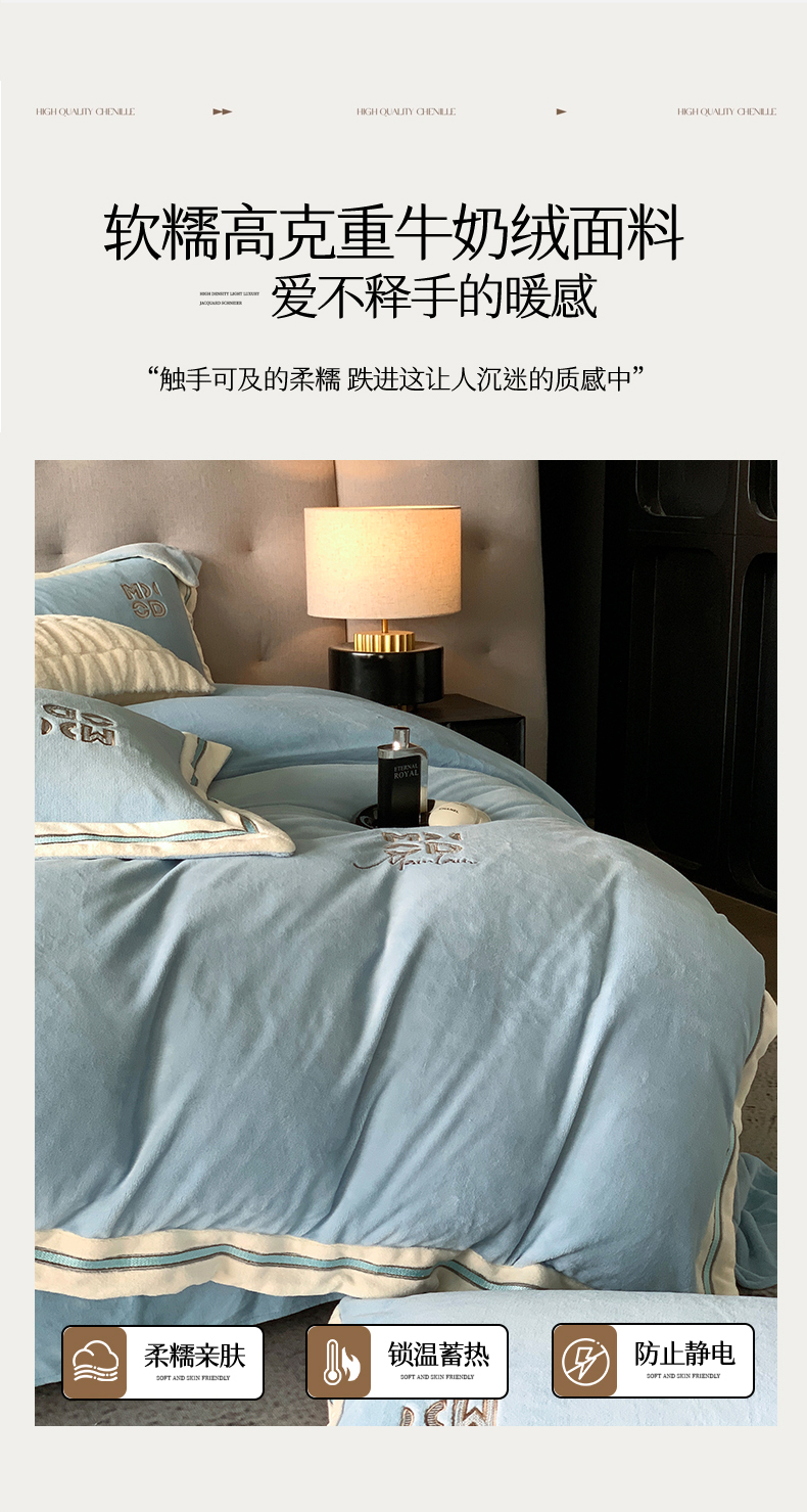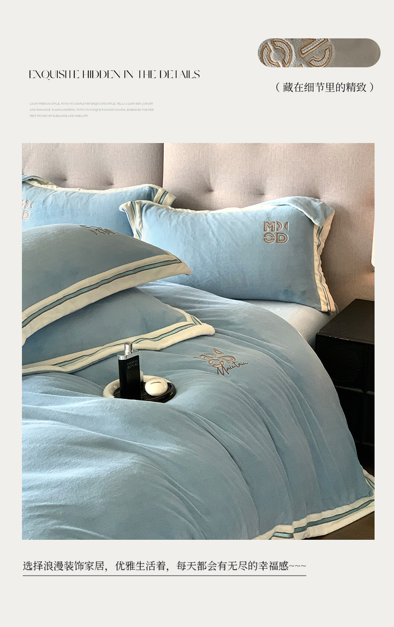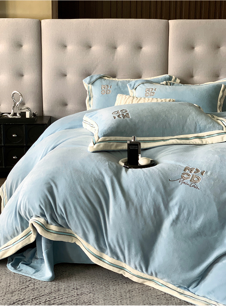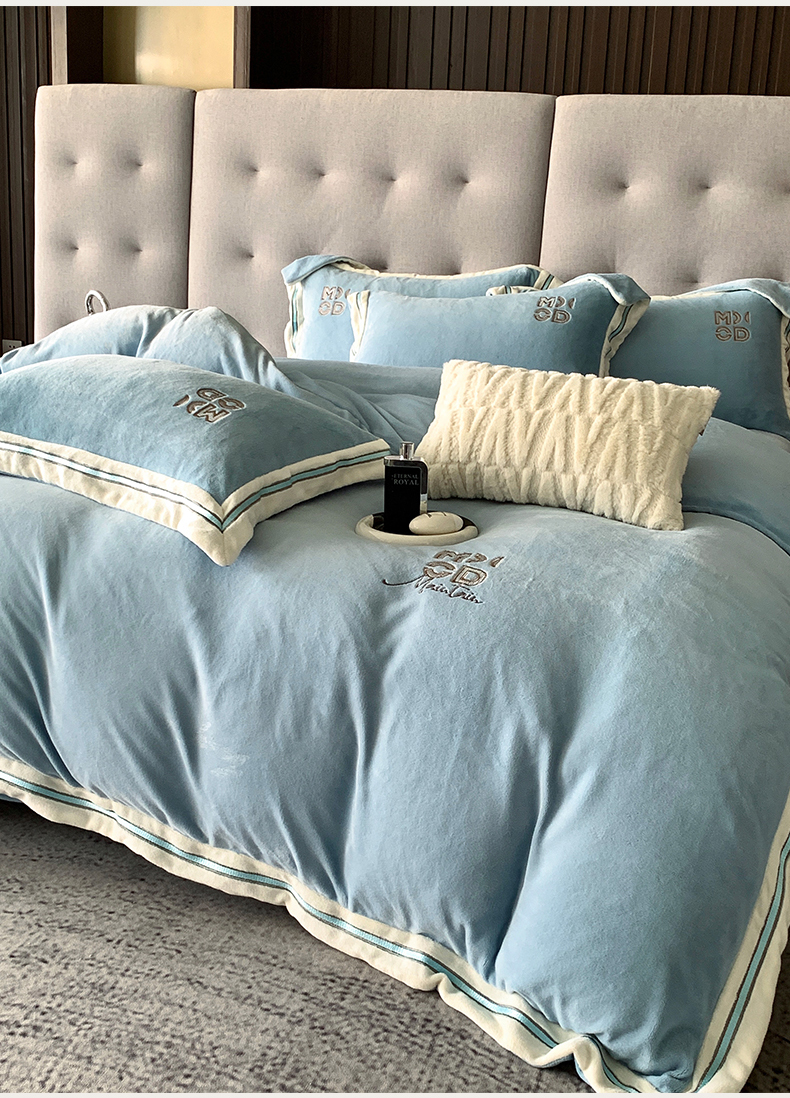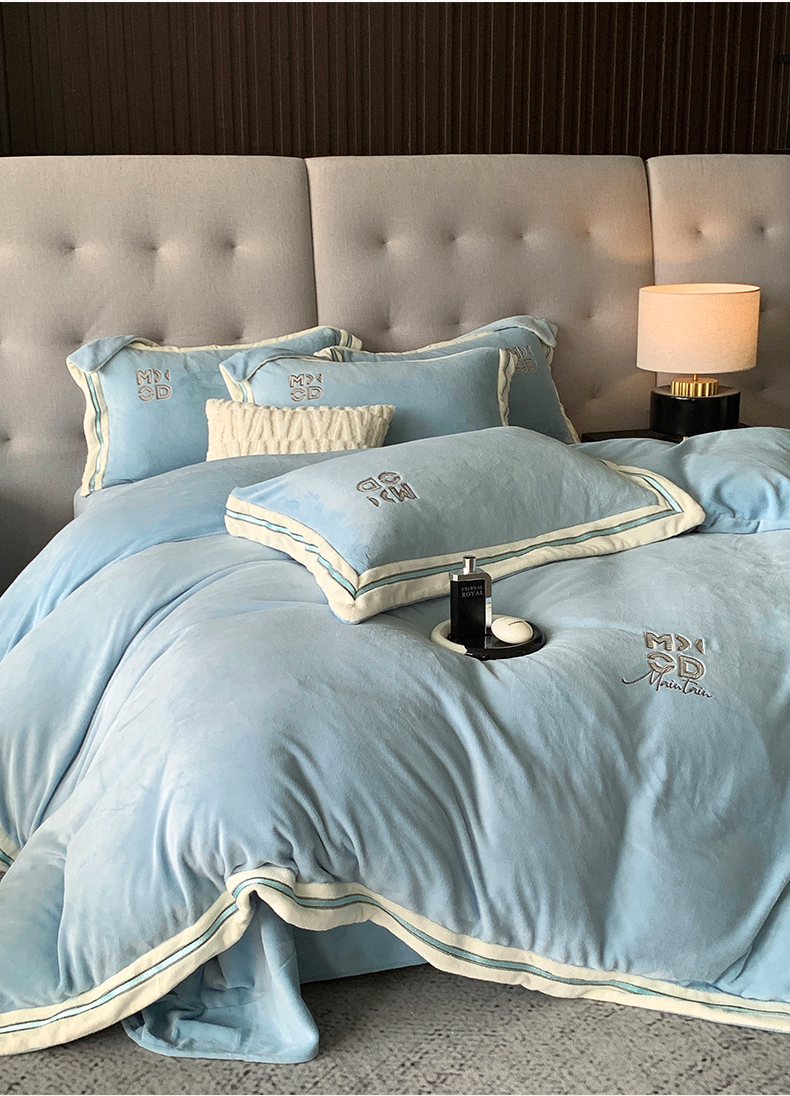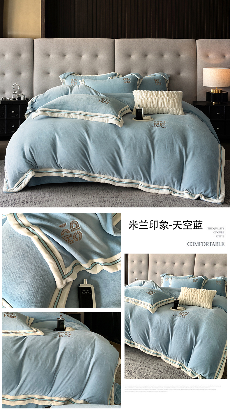商品名称:保罗圣迪奥 2025新款A类高克重牛奶绒绣花四件套-米兰印象 米兰印象-天空蓝