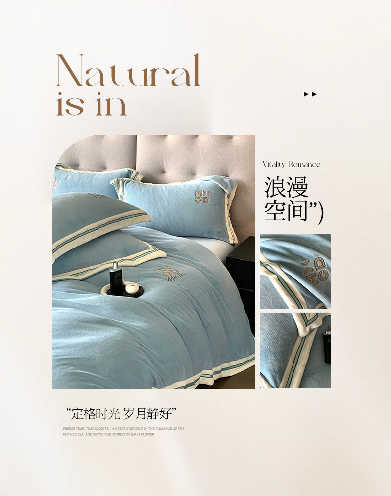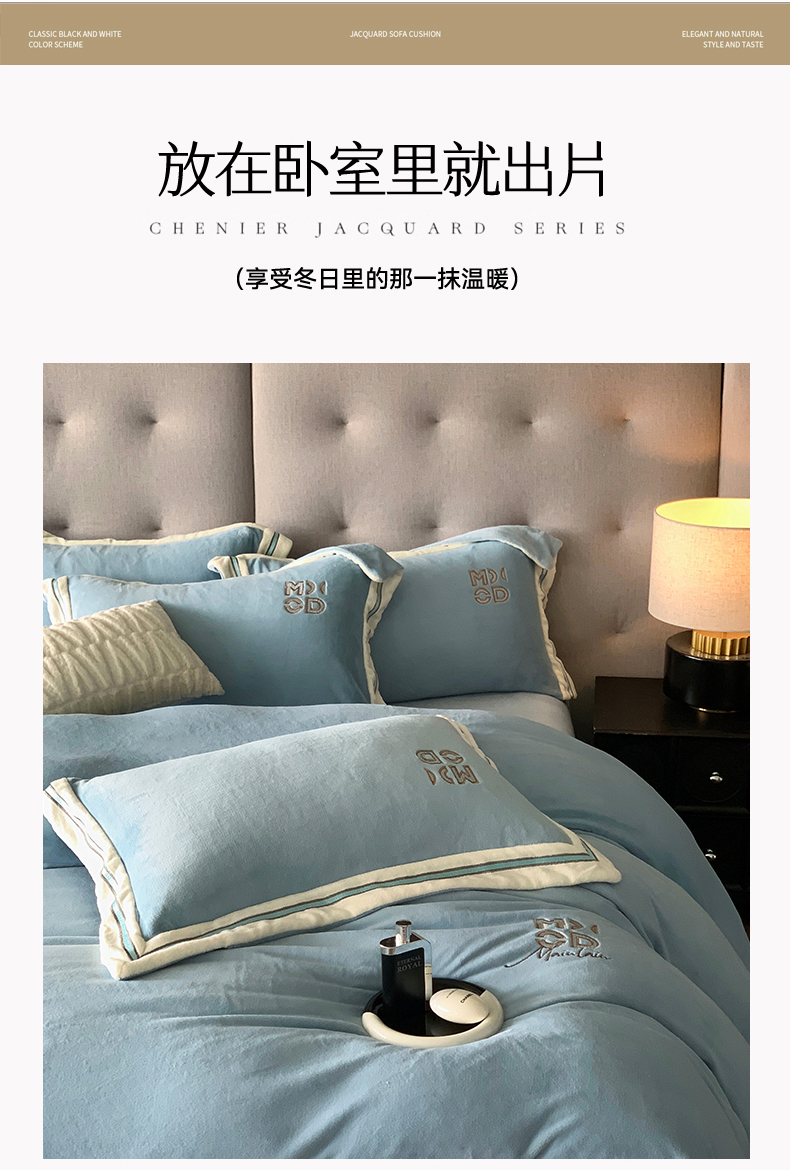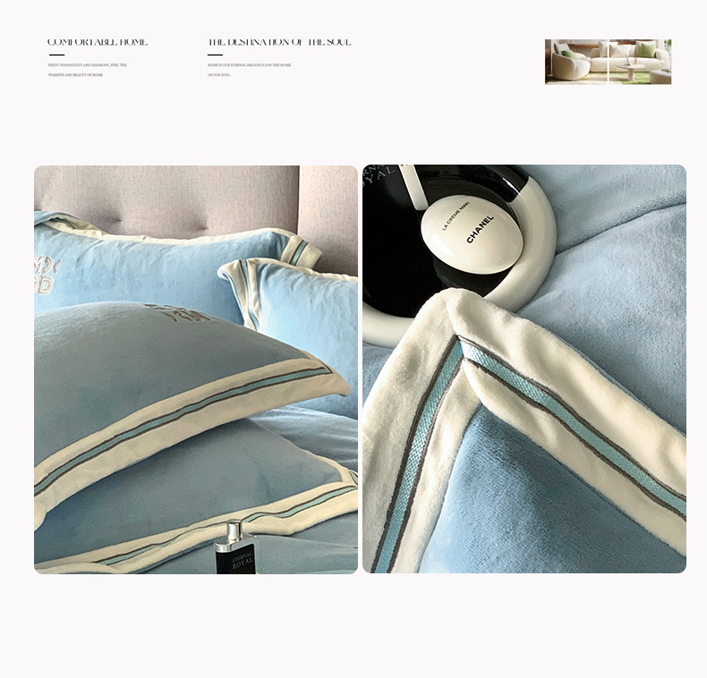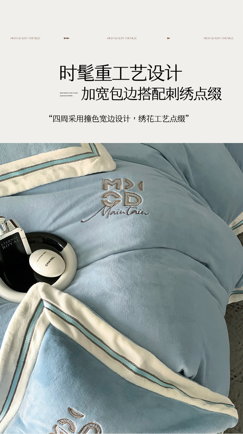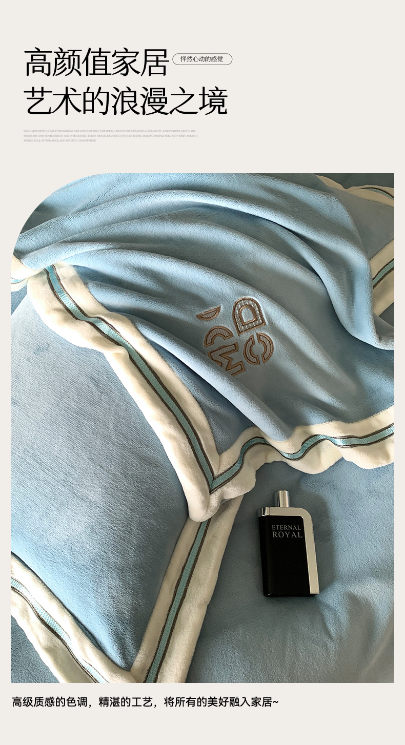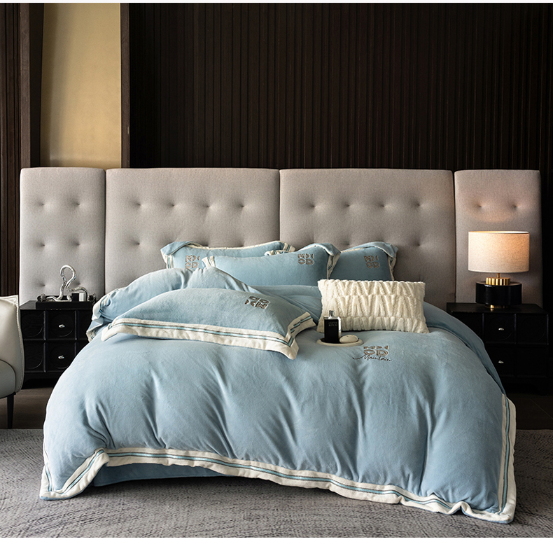 商品名称:保罗圣迪奥 2025新款A类高克重牛奶绒绣花四件套-米兰印象 米兰印象-天空蓝