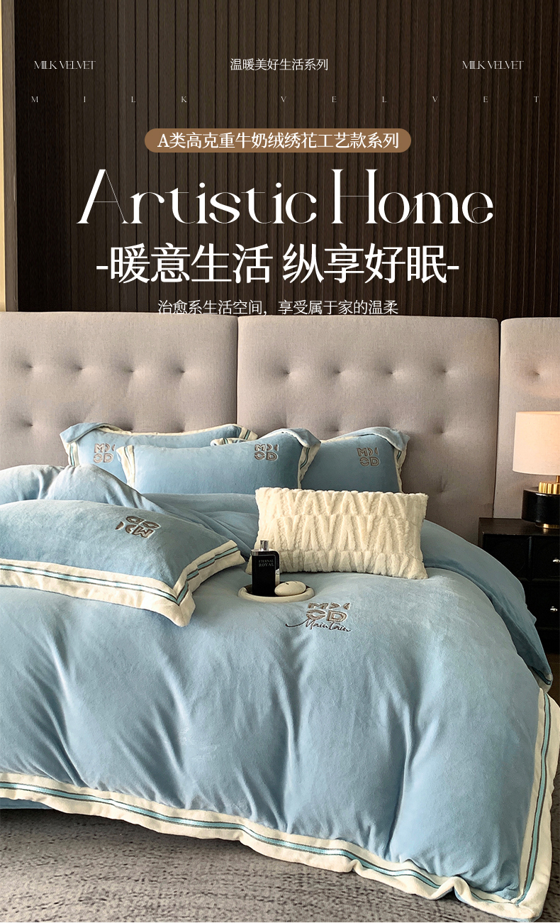 保罗圣迪奥 2025新款A类高克重牛奶绒绣花四件套-米兰印象 米兰印象-天空蓝