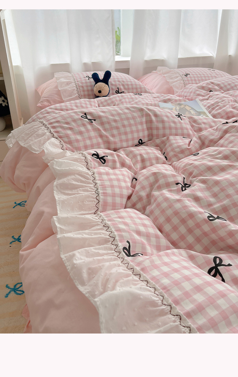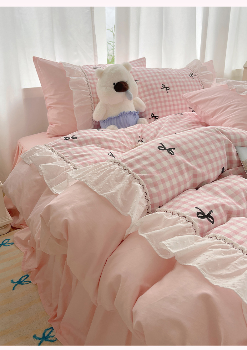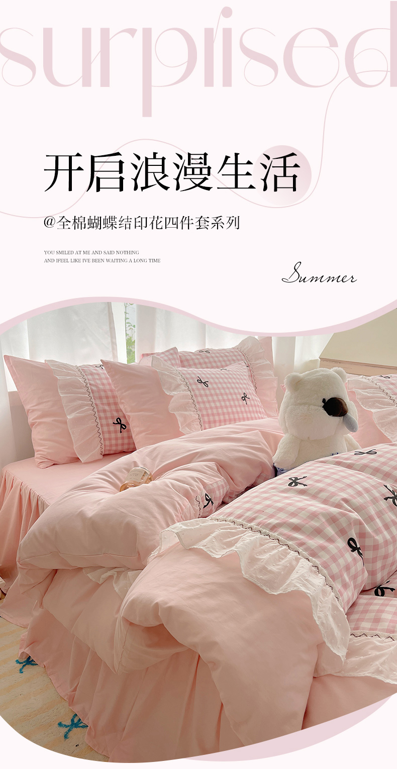 瑞莱 2025冬季新款13372舞动花边全棉四件套系列 粉格蝴蝶结