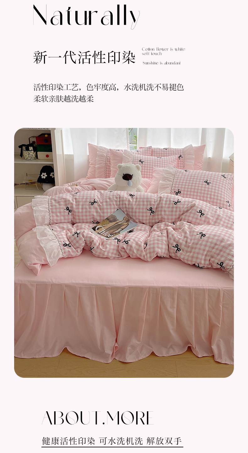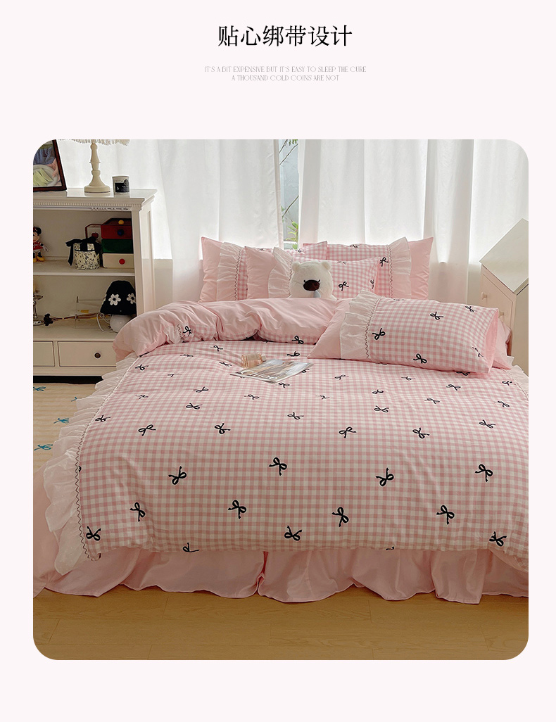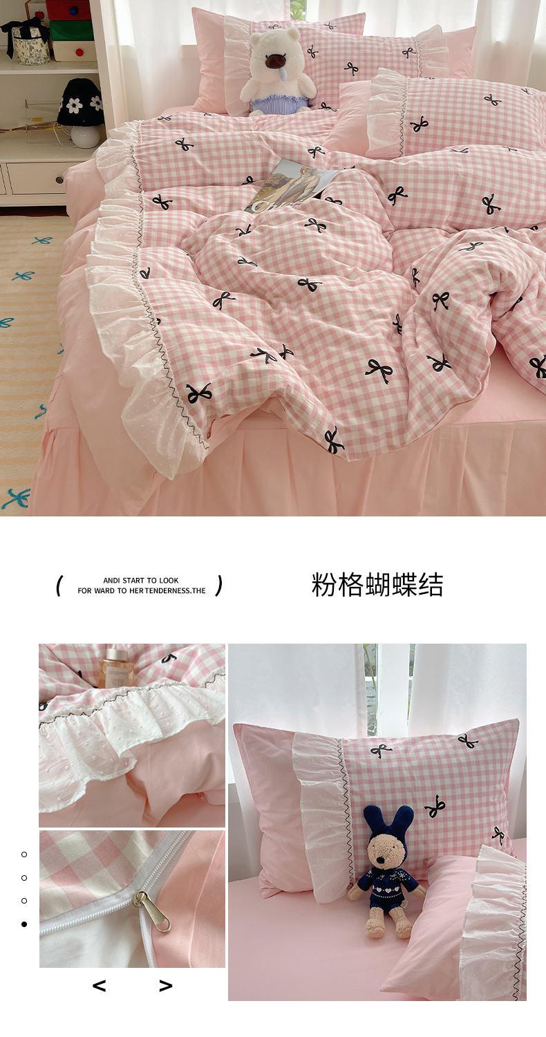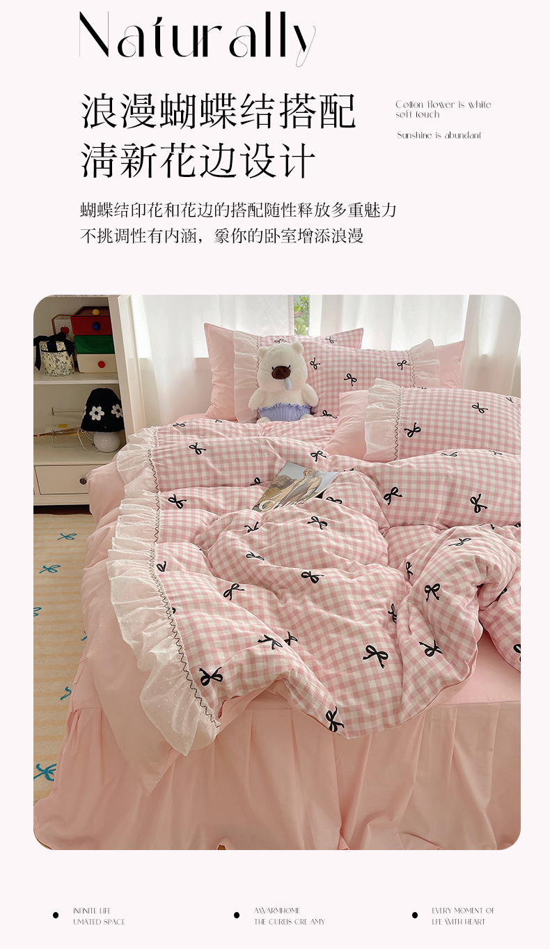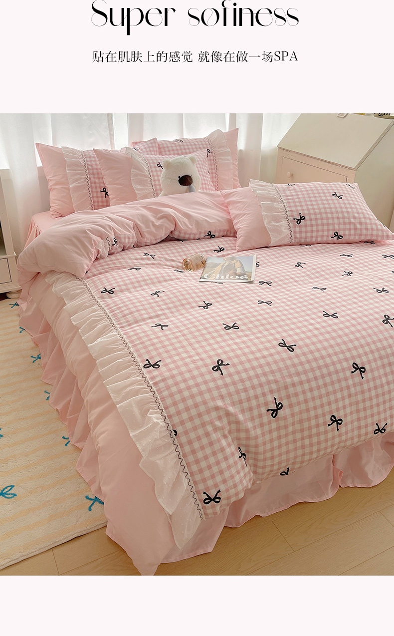 商品名称:瑞莱 2025冬季新款13372舞动花边全棉四件套系列 粉格蝴蝶结