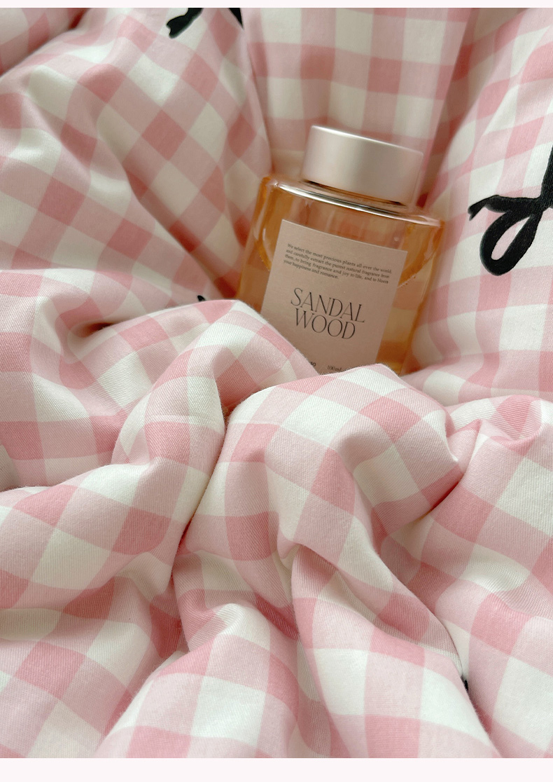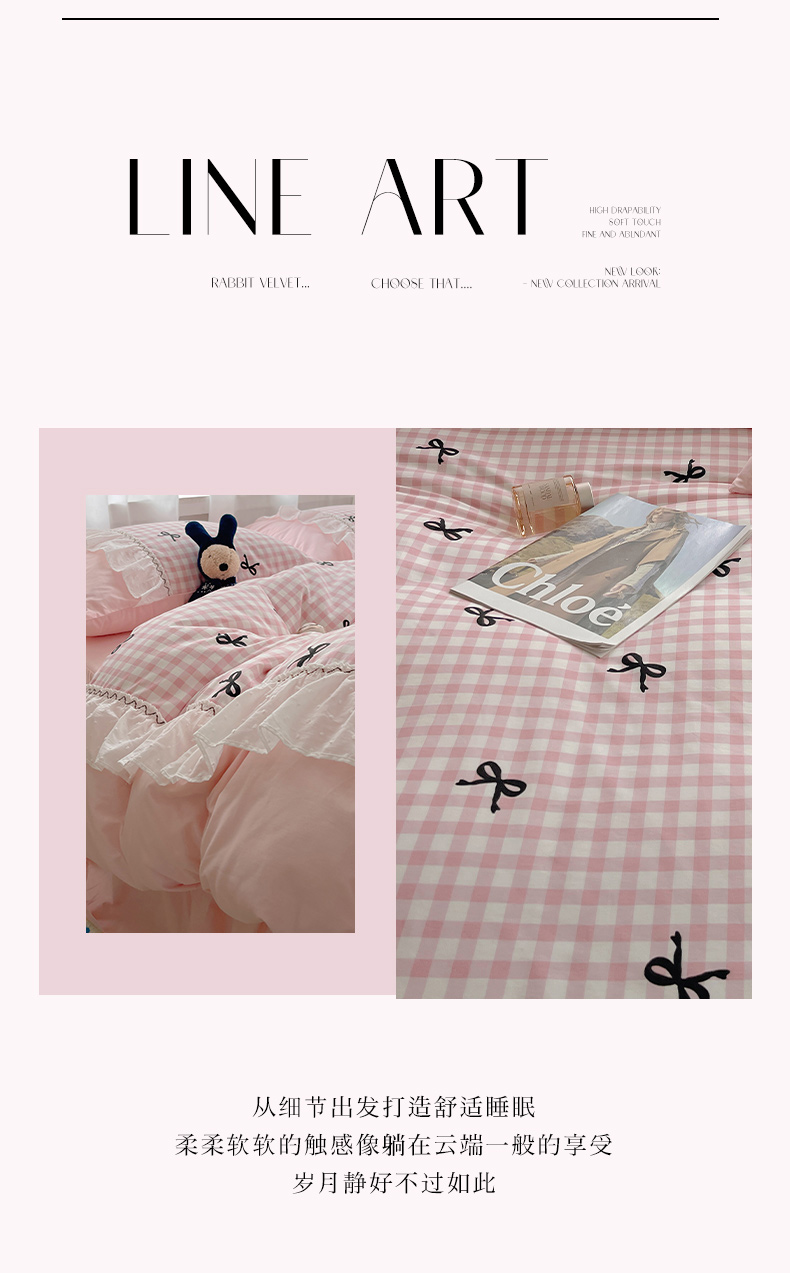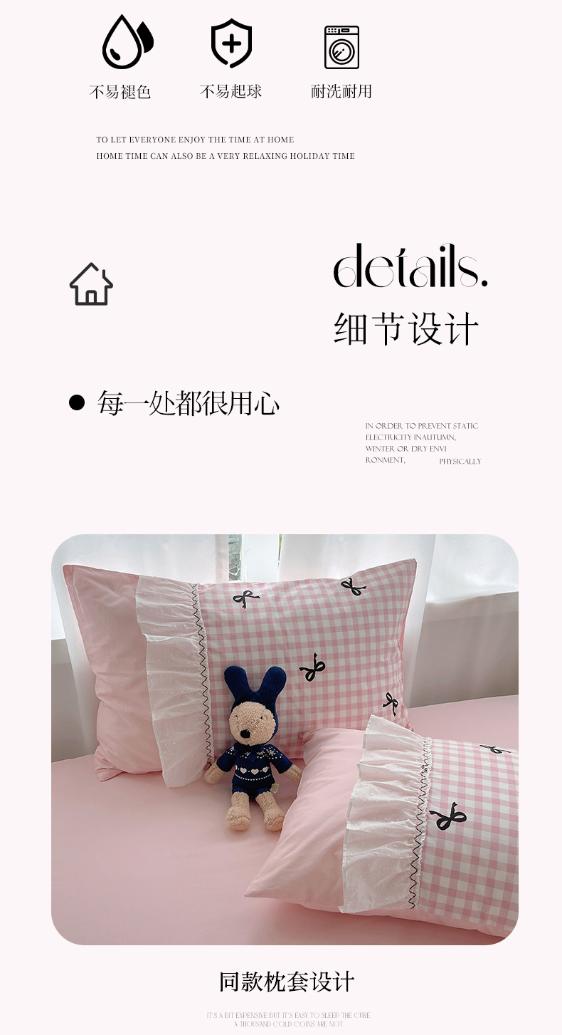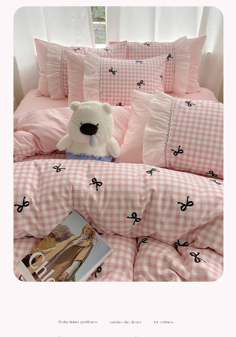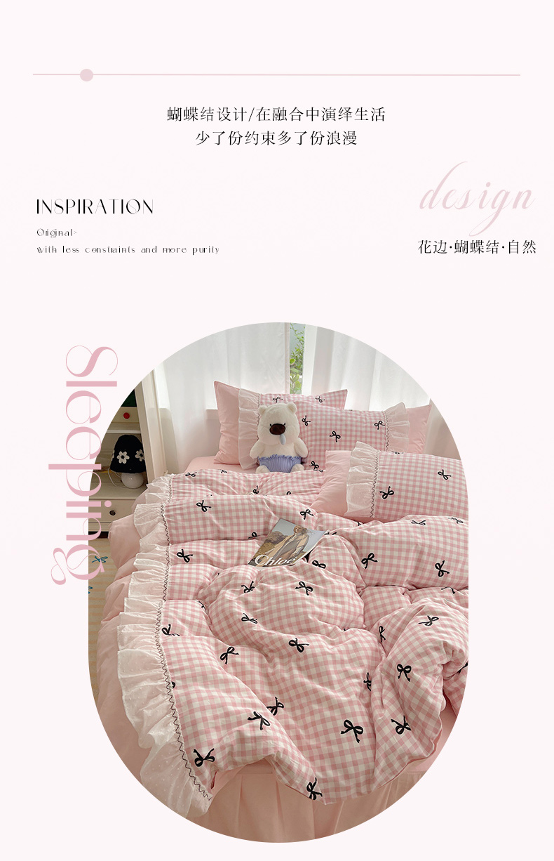 商品名称:瑞莱 2025冬季新款13372舞动花边全棉四件套系列 粉格蝴蝶结