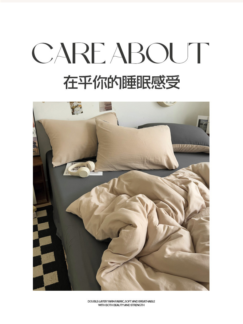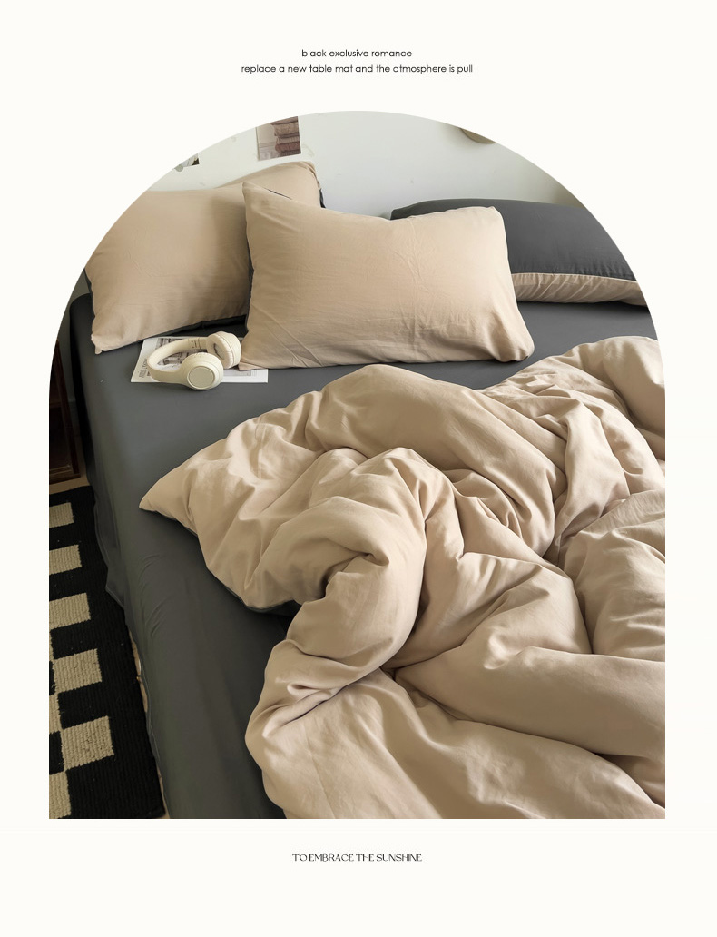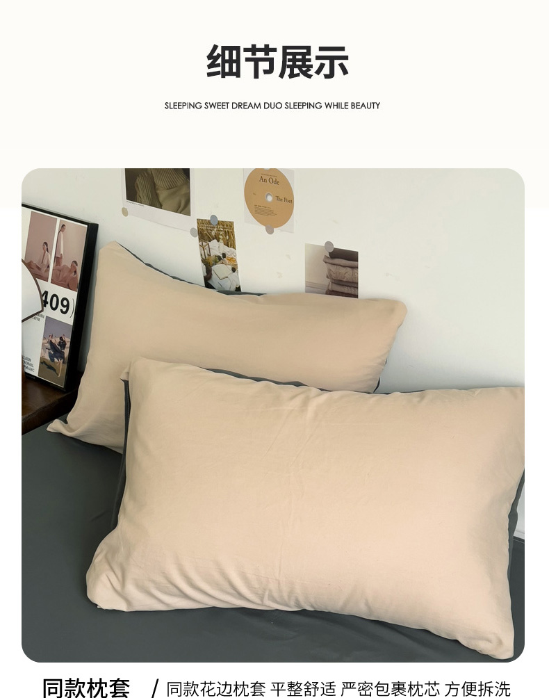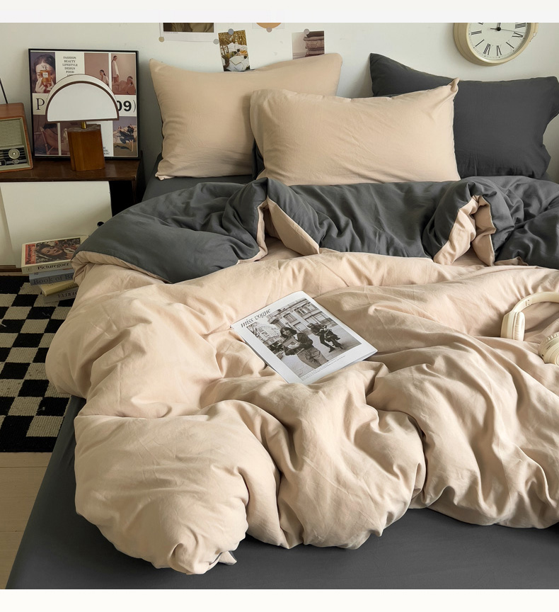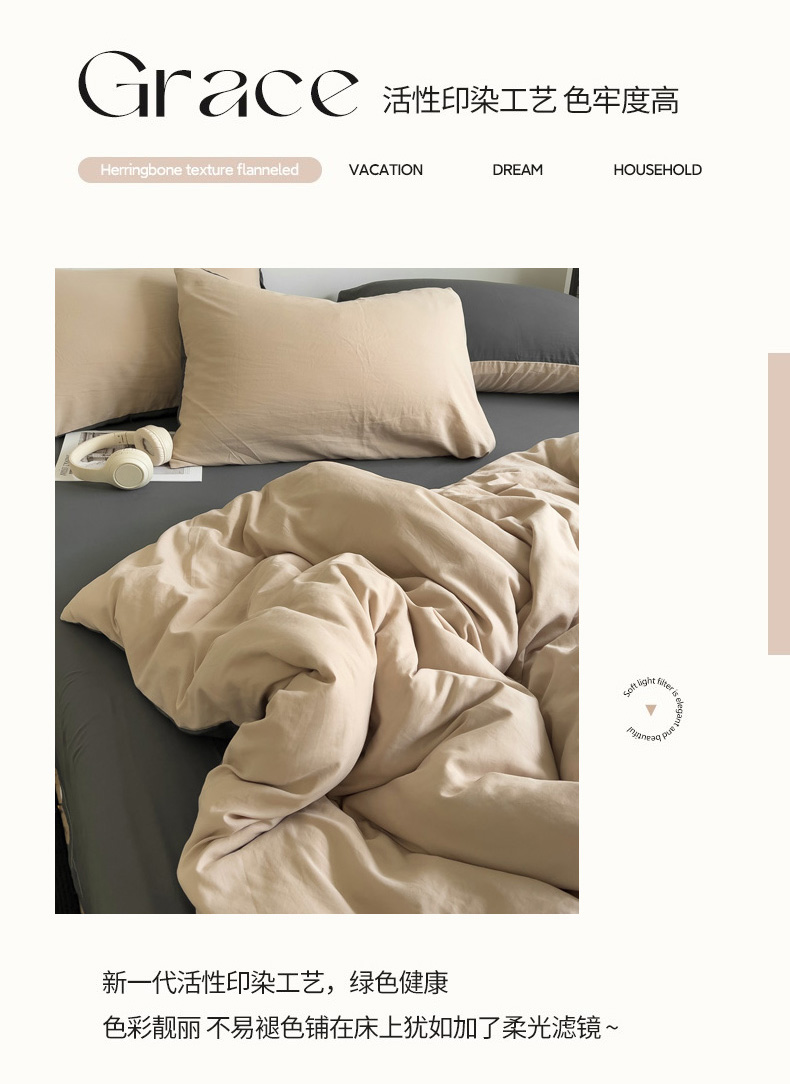 当前位置: 91家纺网 > 商品网购 > 床品套件 > 四件套 > 普通磨毛四件套 > 花伞家居 2025新款纯色拼色柔软亲肤水洗棉简约四件套 奶茶+深灰