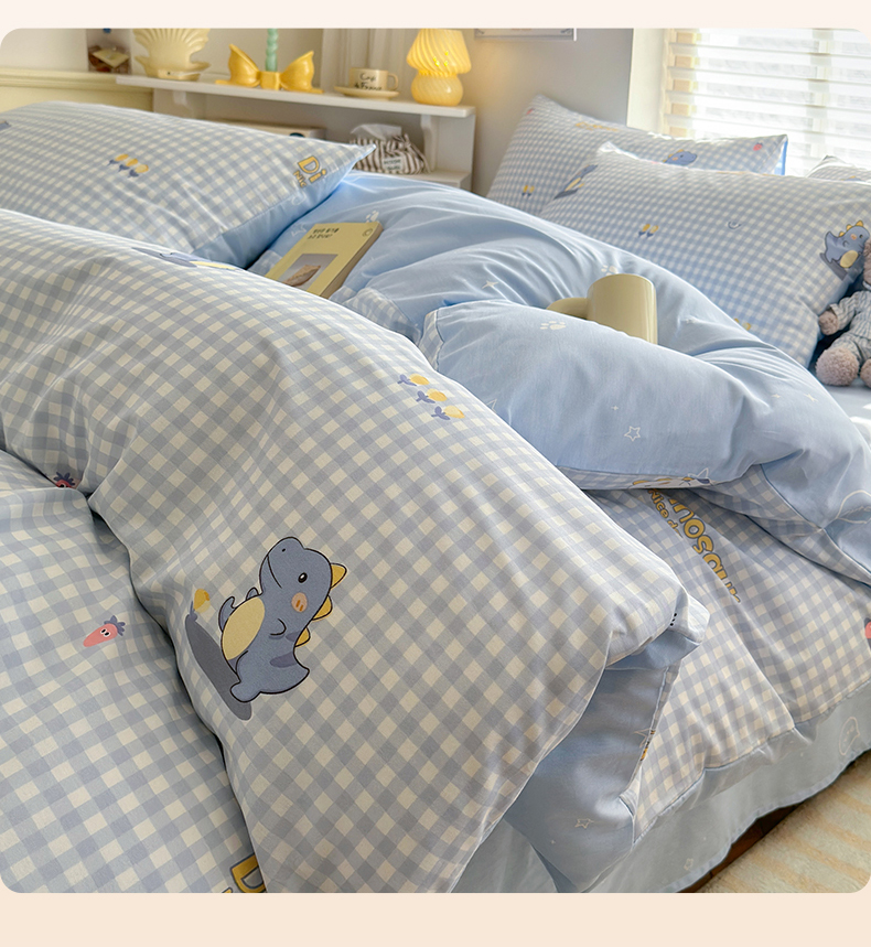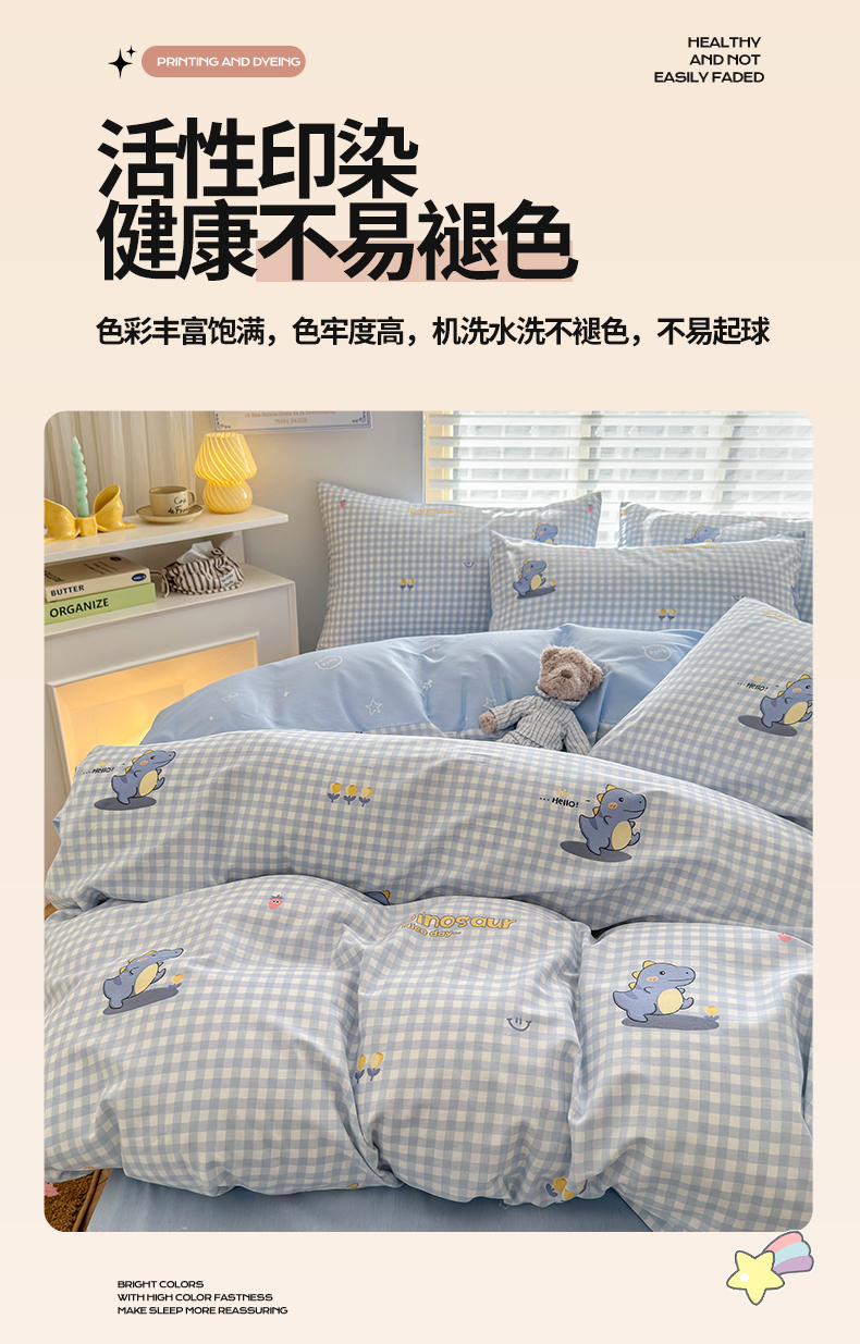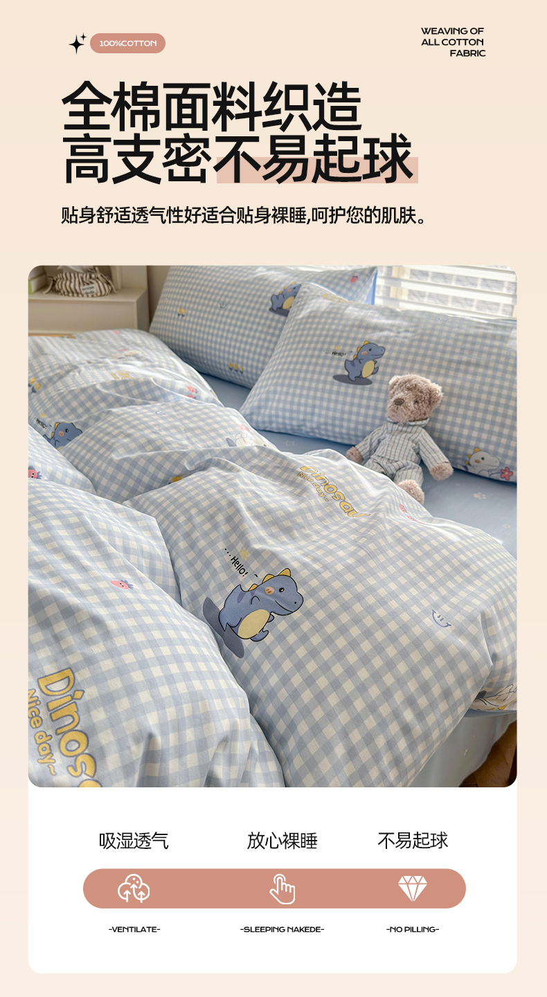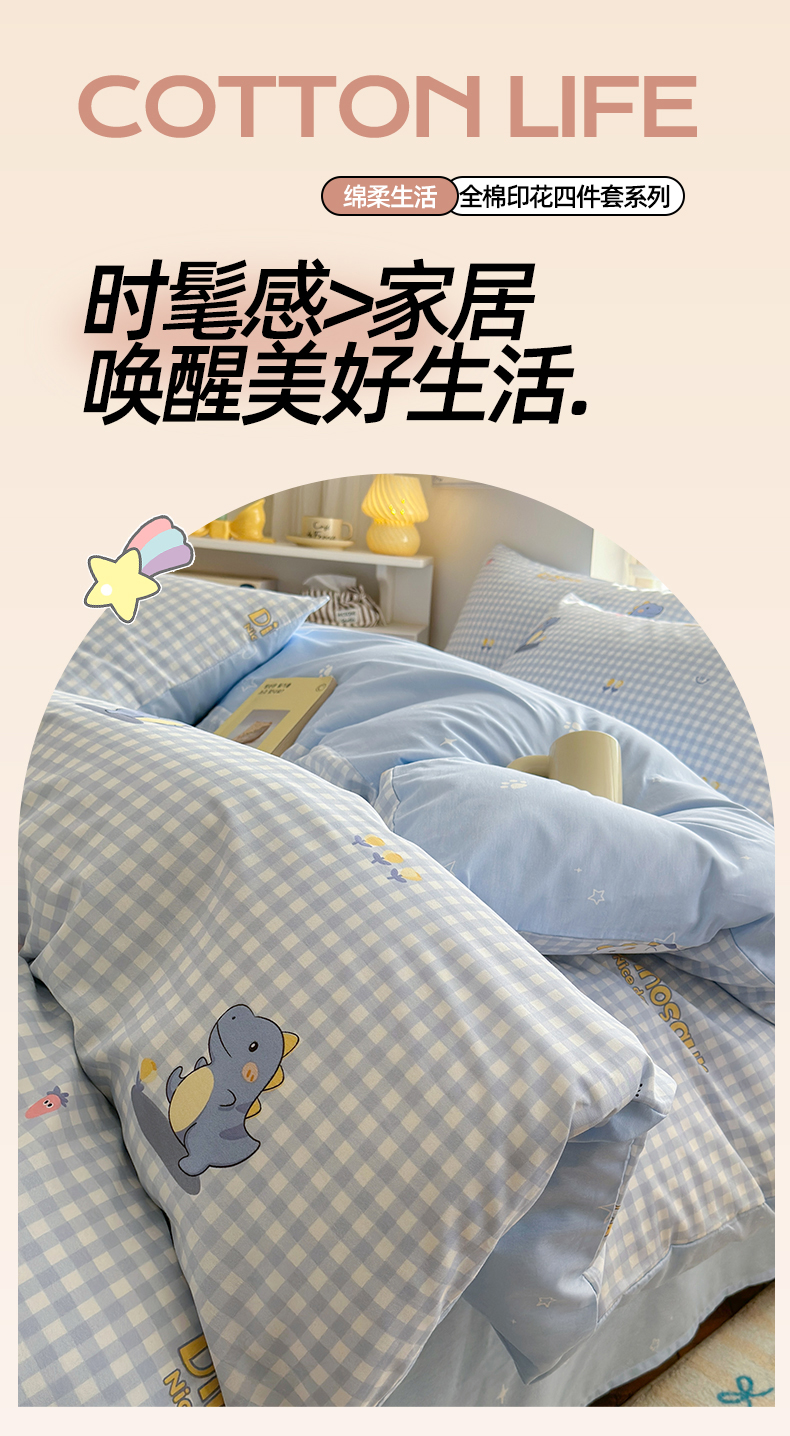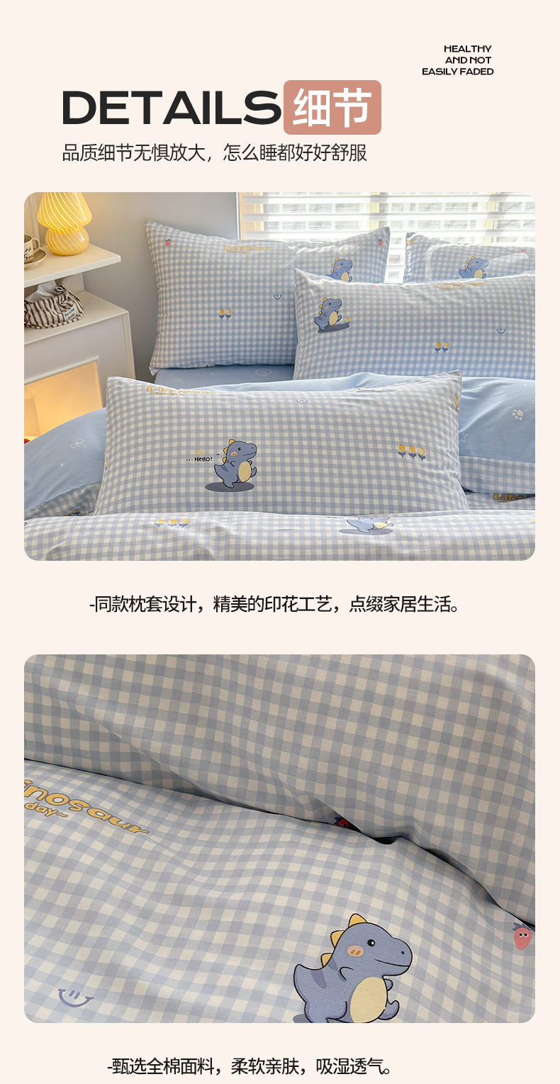 当前位置: 91家纺网 > 商品网购 > 床品套件 > 四件套 > 全棉普通四件套 > 名兮家居 2025年新款13372全棉印花四件套-卡通系列 格子恐龙