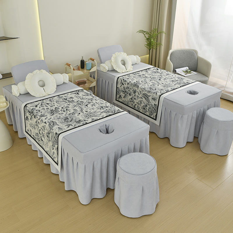 当前位置: 91家纺网 > 商品网购 > 床品套件 > 四件套 > 贡缎全棉四件套 > 不打烊家纺 2025新款贡棉美 容床罩印花款-花千城(支持logo定制) 花千城米白色拼灰色