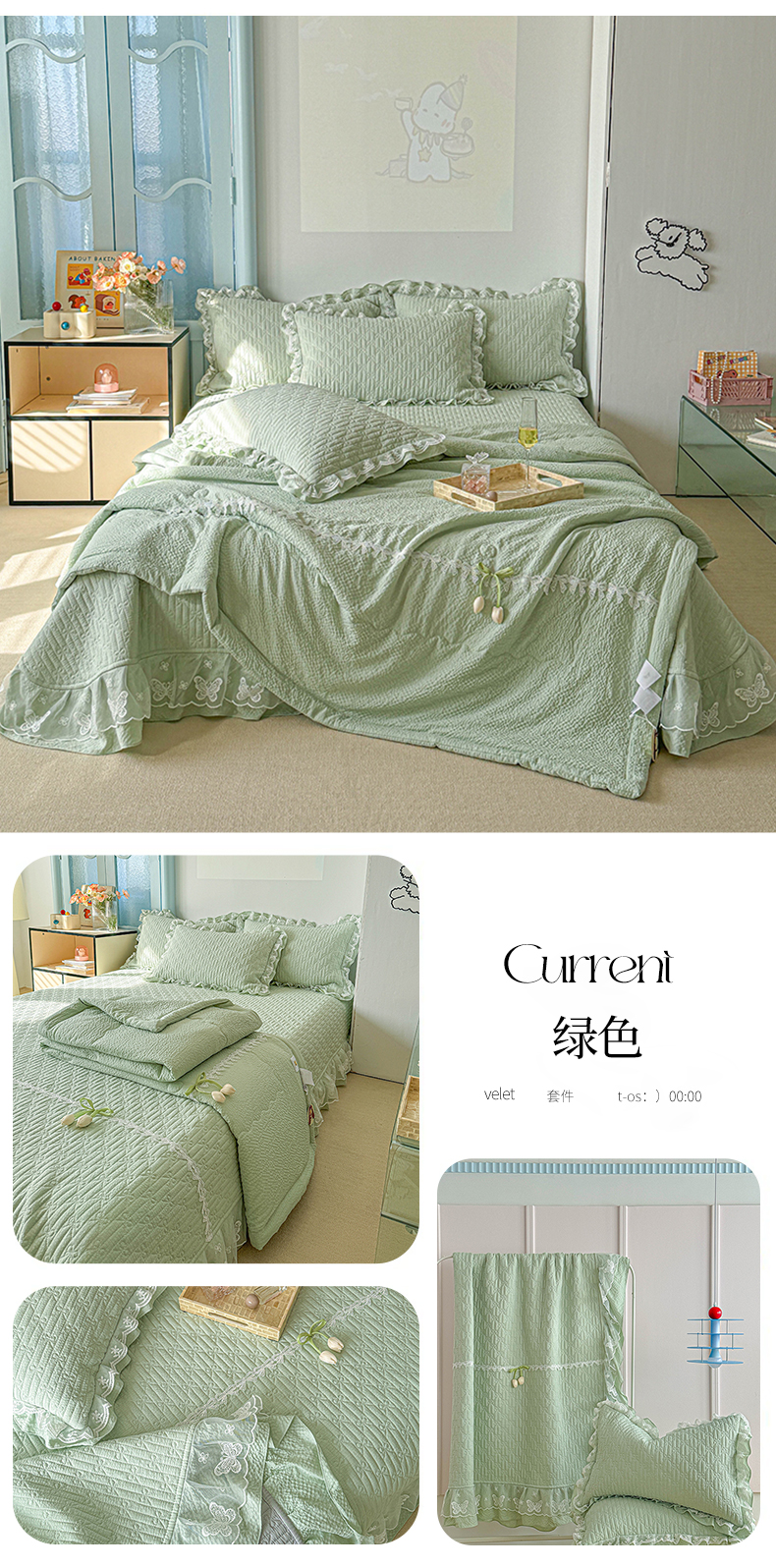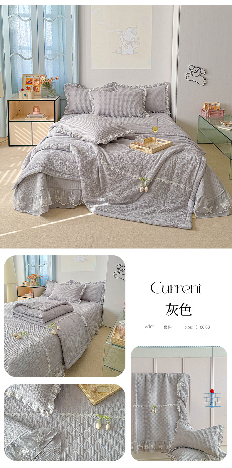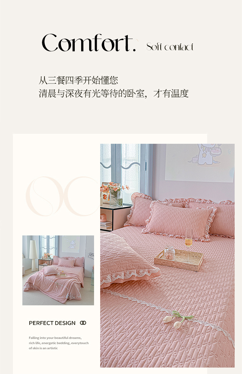 (总)源舜家纺 2025新款色织棉简约韩系花边床盖三件套,简约灰,简约粉,简约绿,简约驼,简约蓝