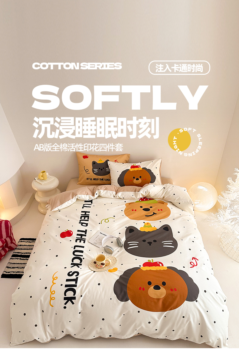 当前位置: 91家纺网 > 商品网购 > 床品套件 > 四件套 > 全棉活性四件套 > 典曼家纺 2025新款 AB版活性印花四件套 幸运小队(米)