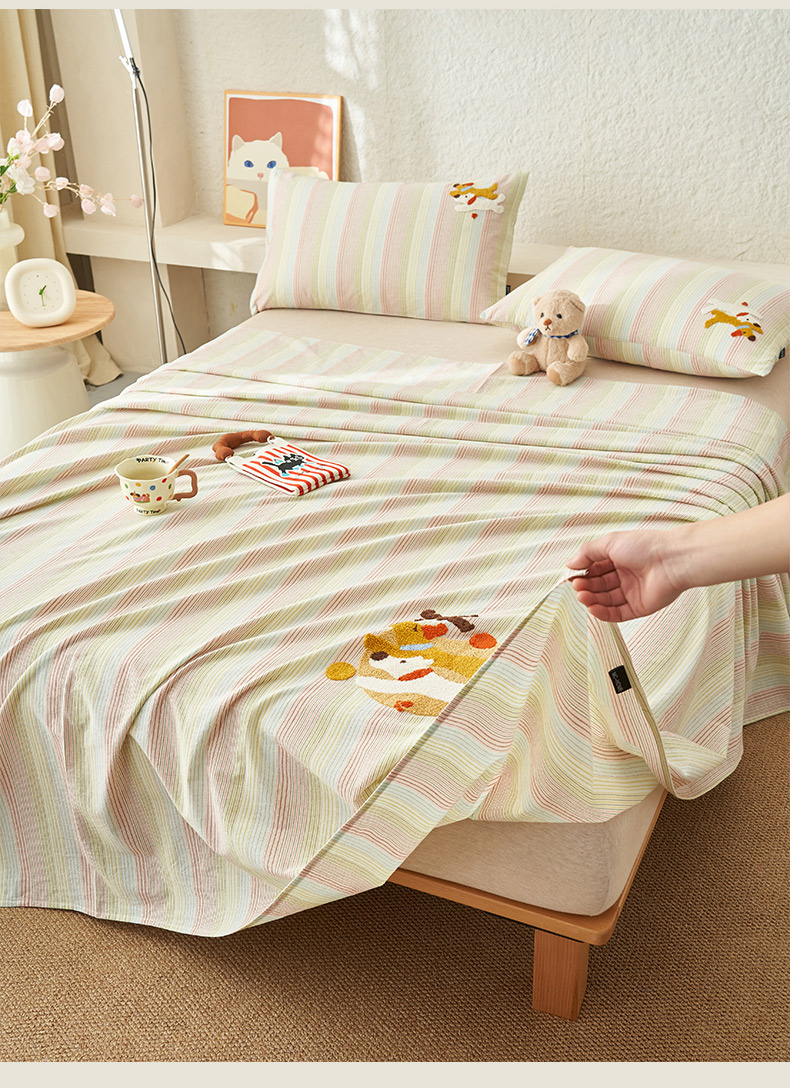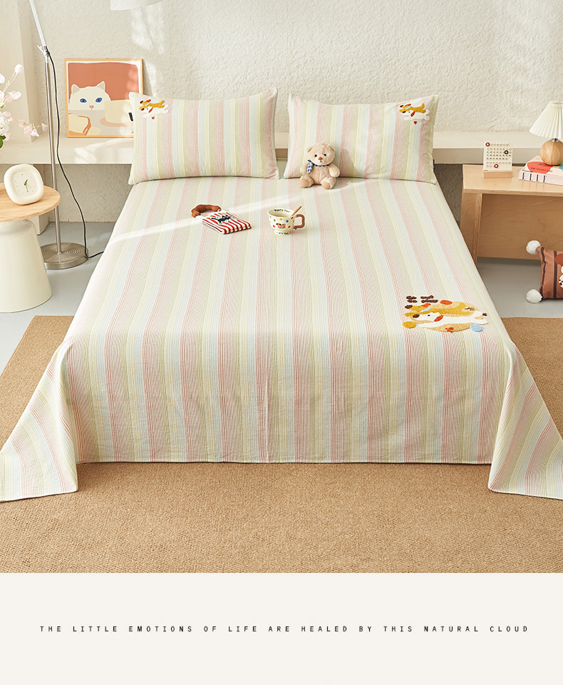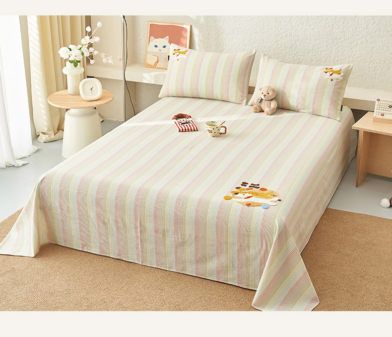寐绸家纺 2025新款纯棉色织水洗棉竖条单床单 水洗棉竖条床单-炫彩绿
