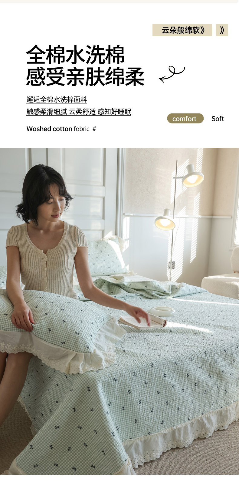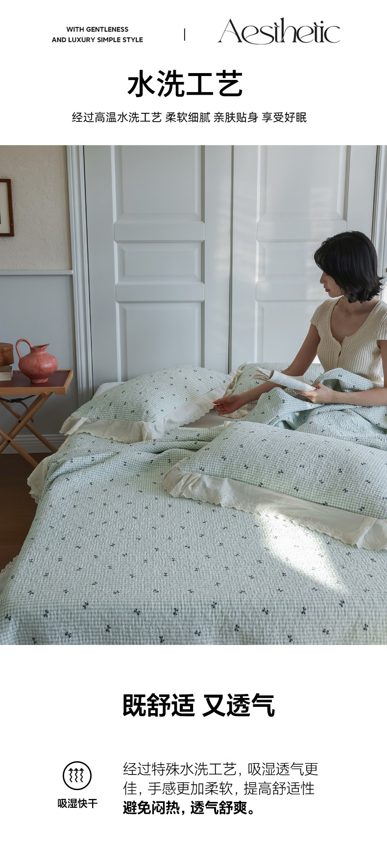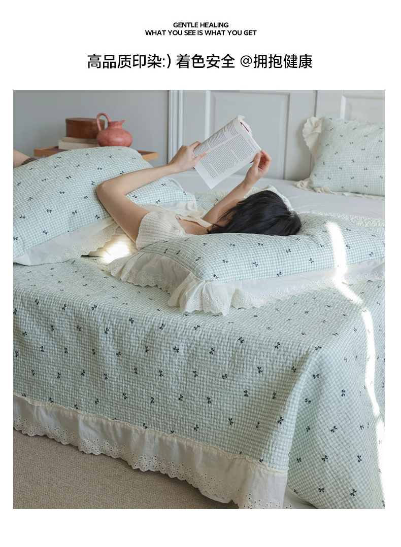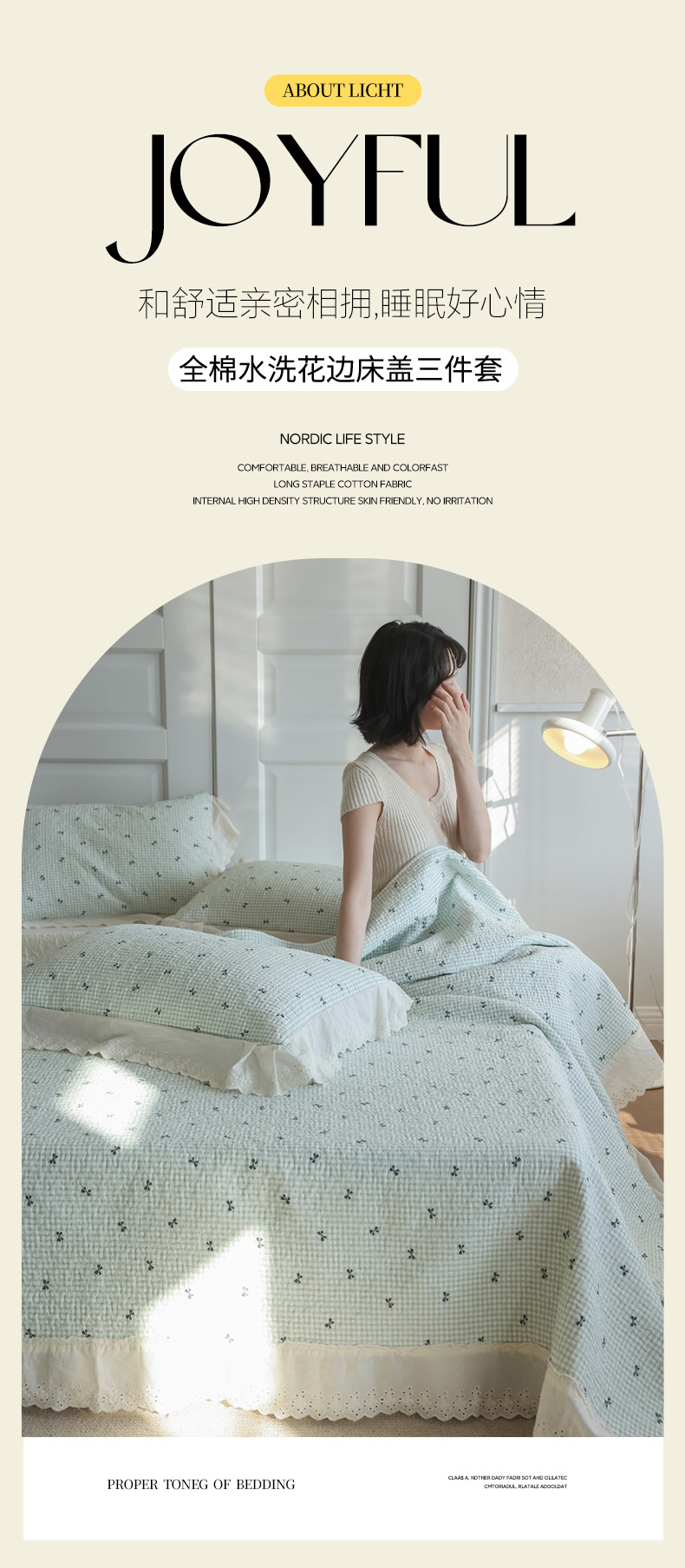 万盛家纺 2025新款全棉水洗花边床盖三件套 念思语绿