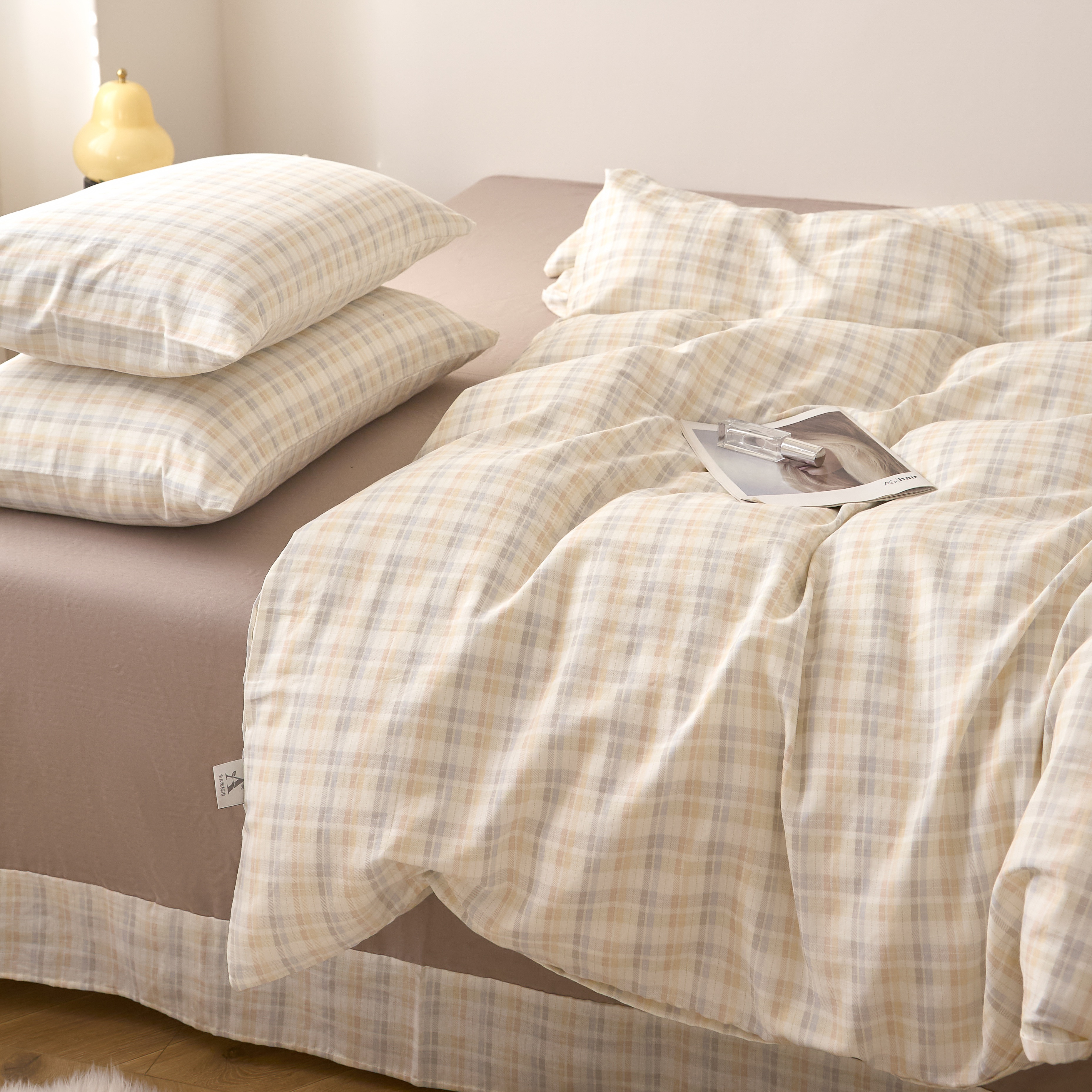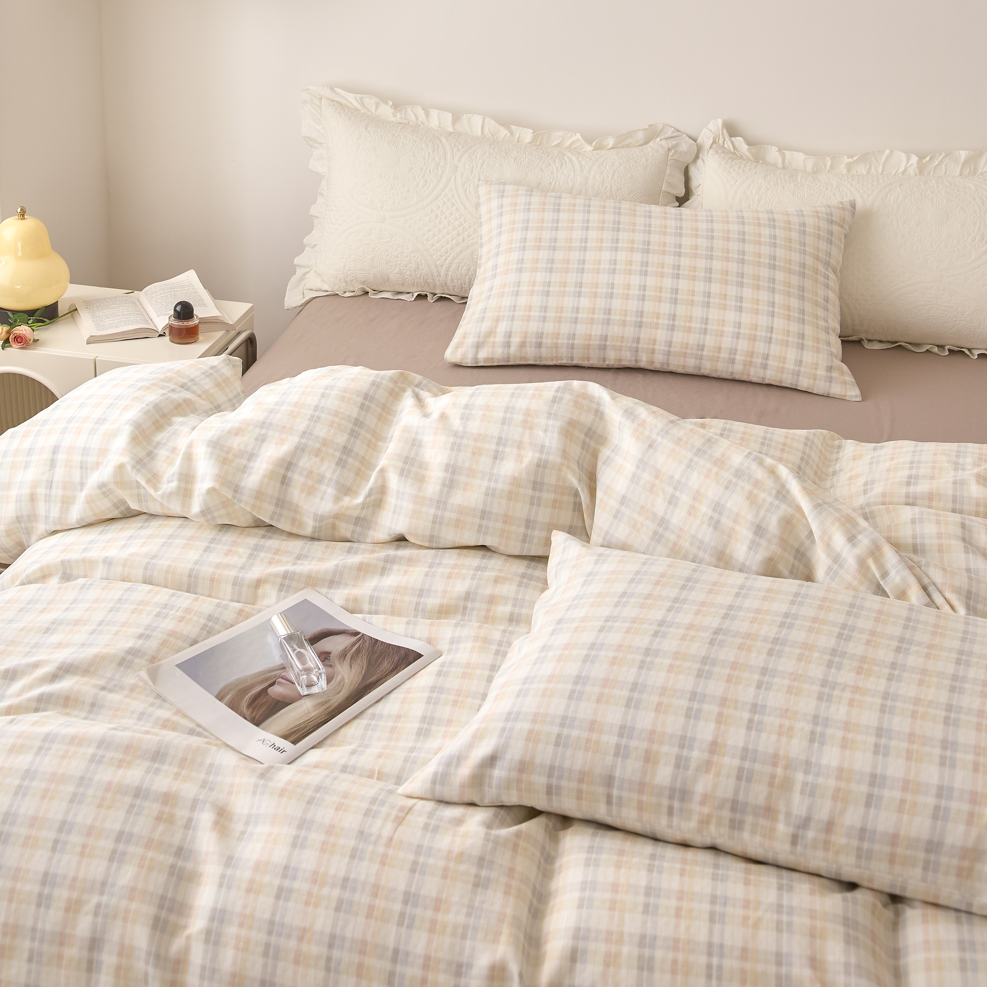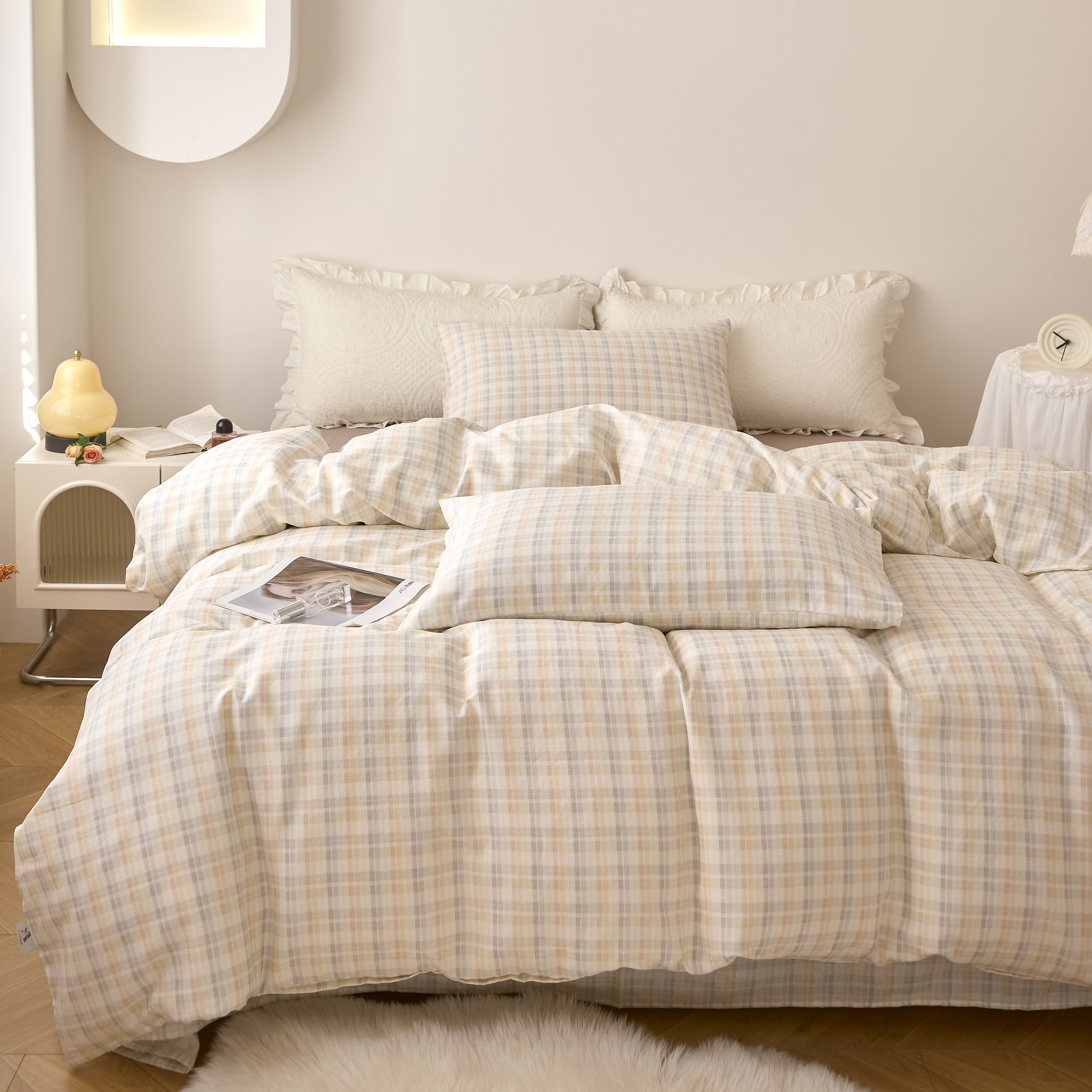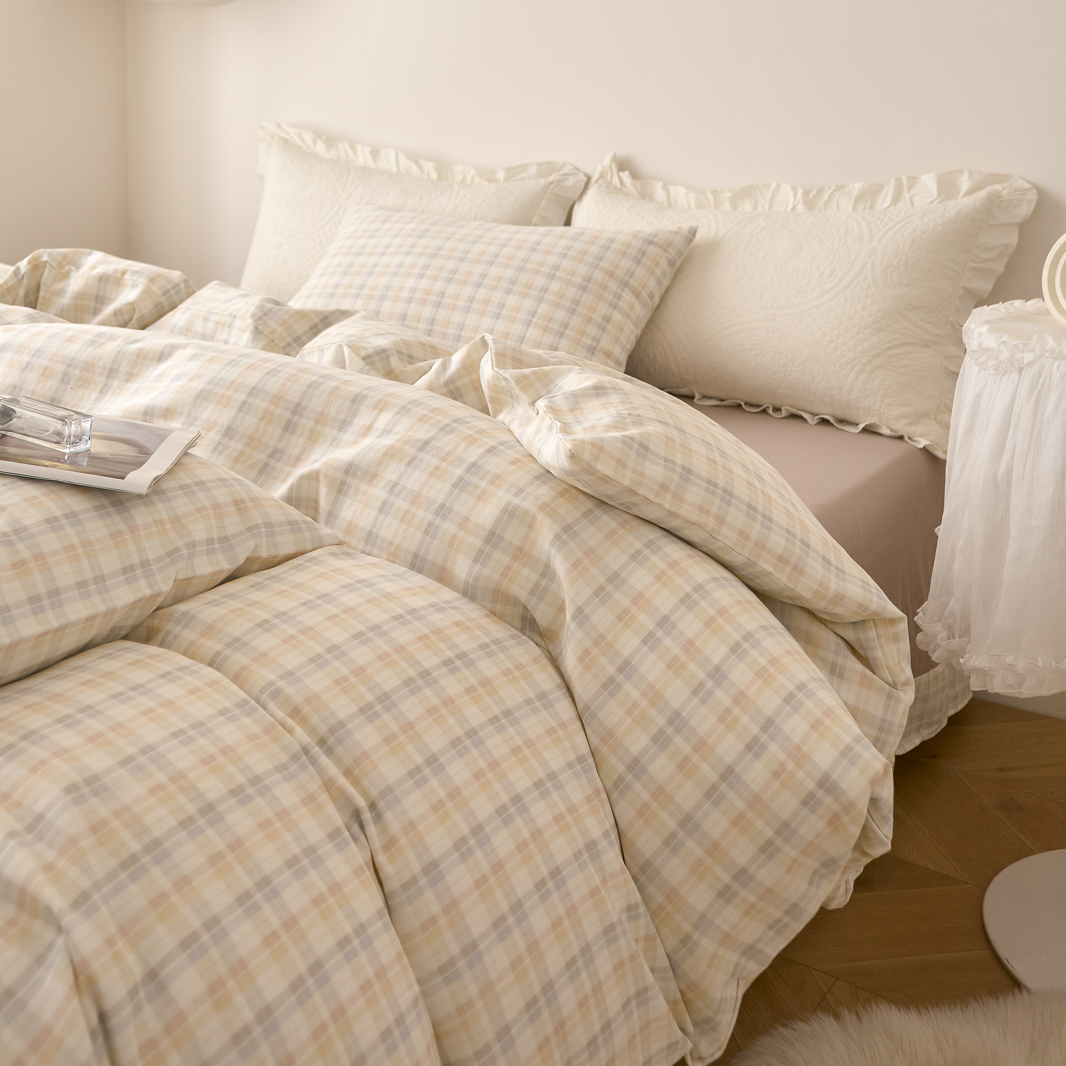 商品名称:嘉汀兰家居 2025新款圆角花边款全棉纯棉A类母婴级有氧全棉双层纱亲肤全棉小清新印花四件套 彩格