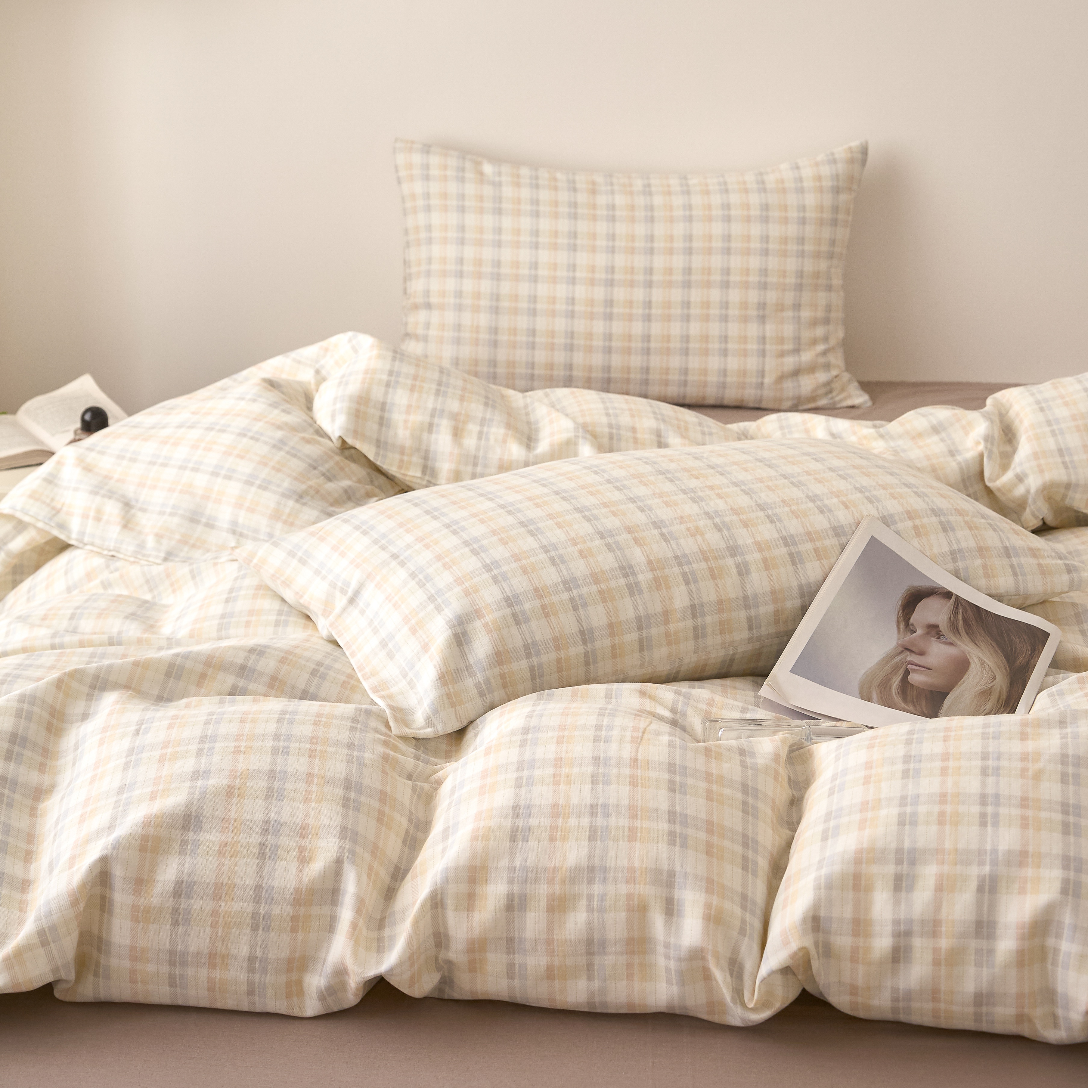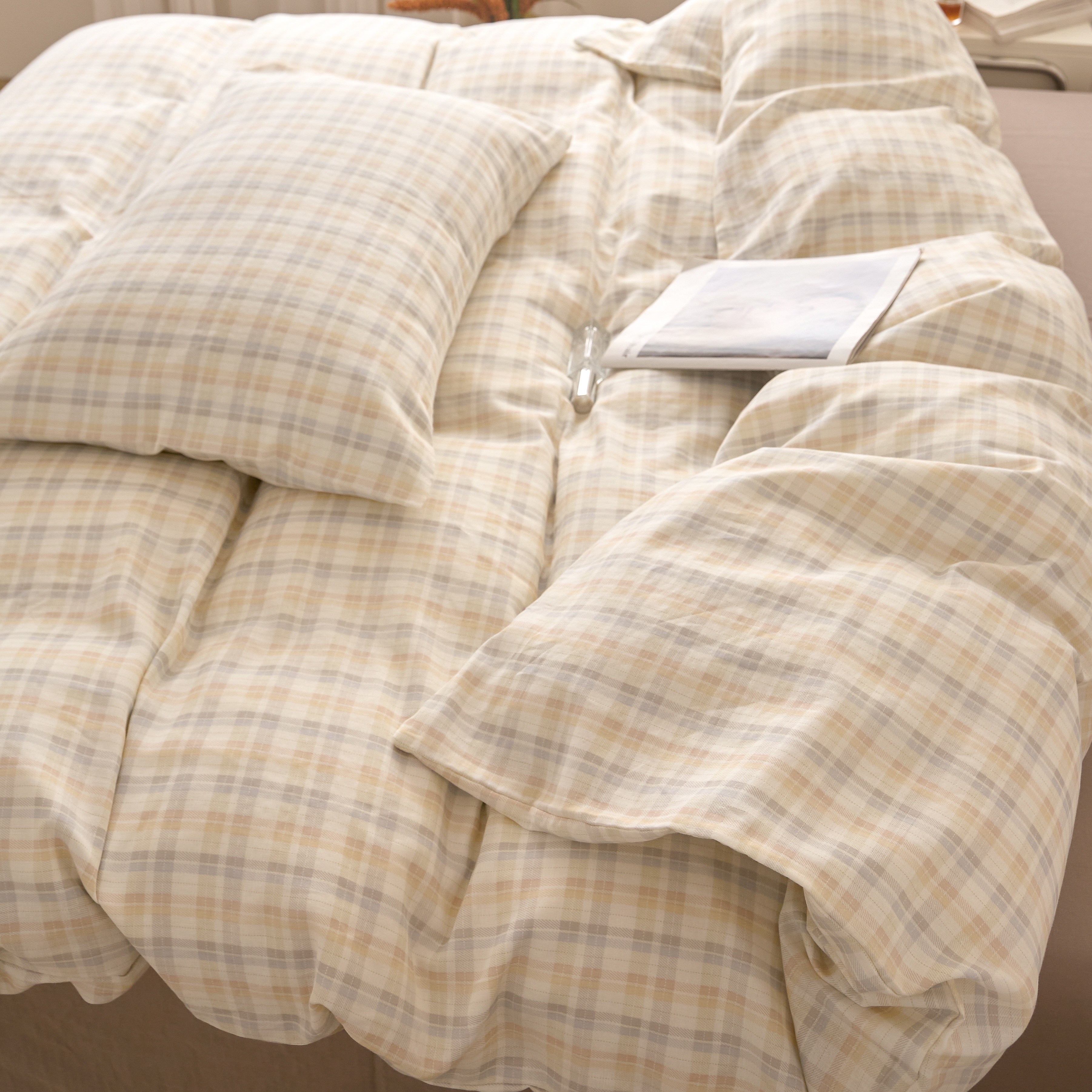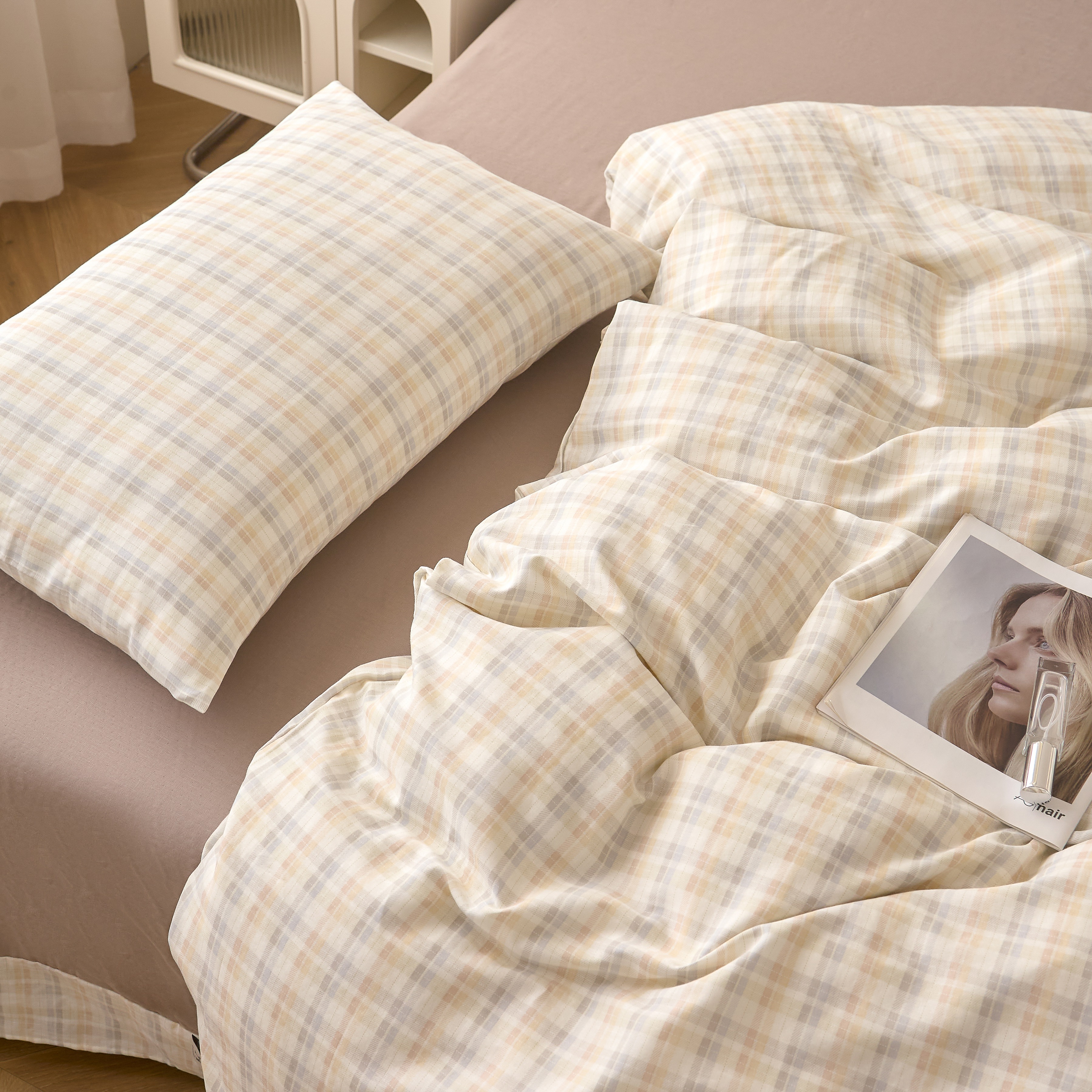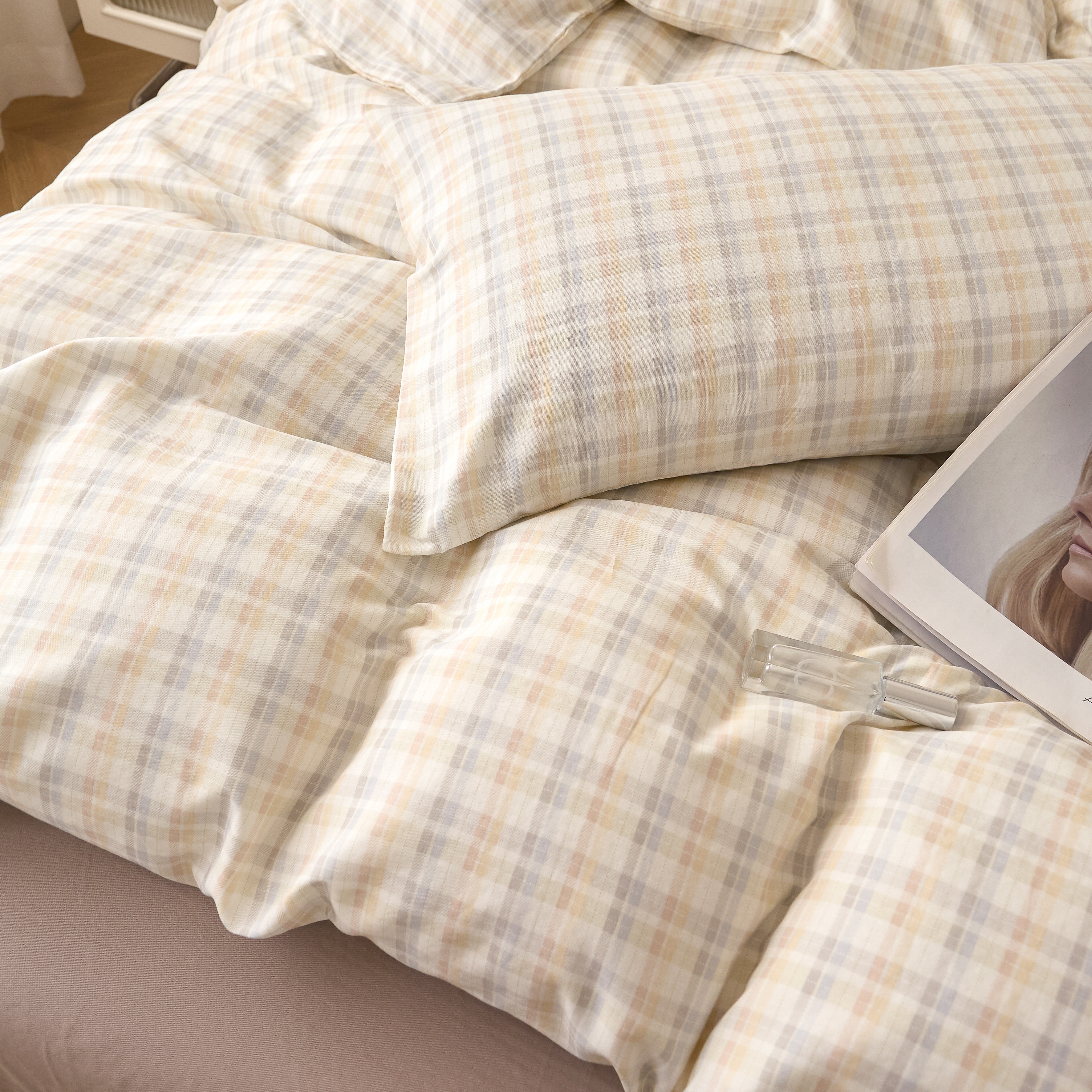 商品名称:嘉汀兰家居 2025新款圆角花边款全棉纯棉A类母婴级有氧全棉双层纱亲肤全棉小清新印花四件套 彩格