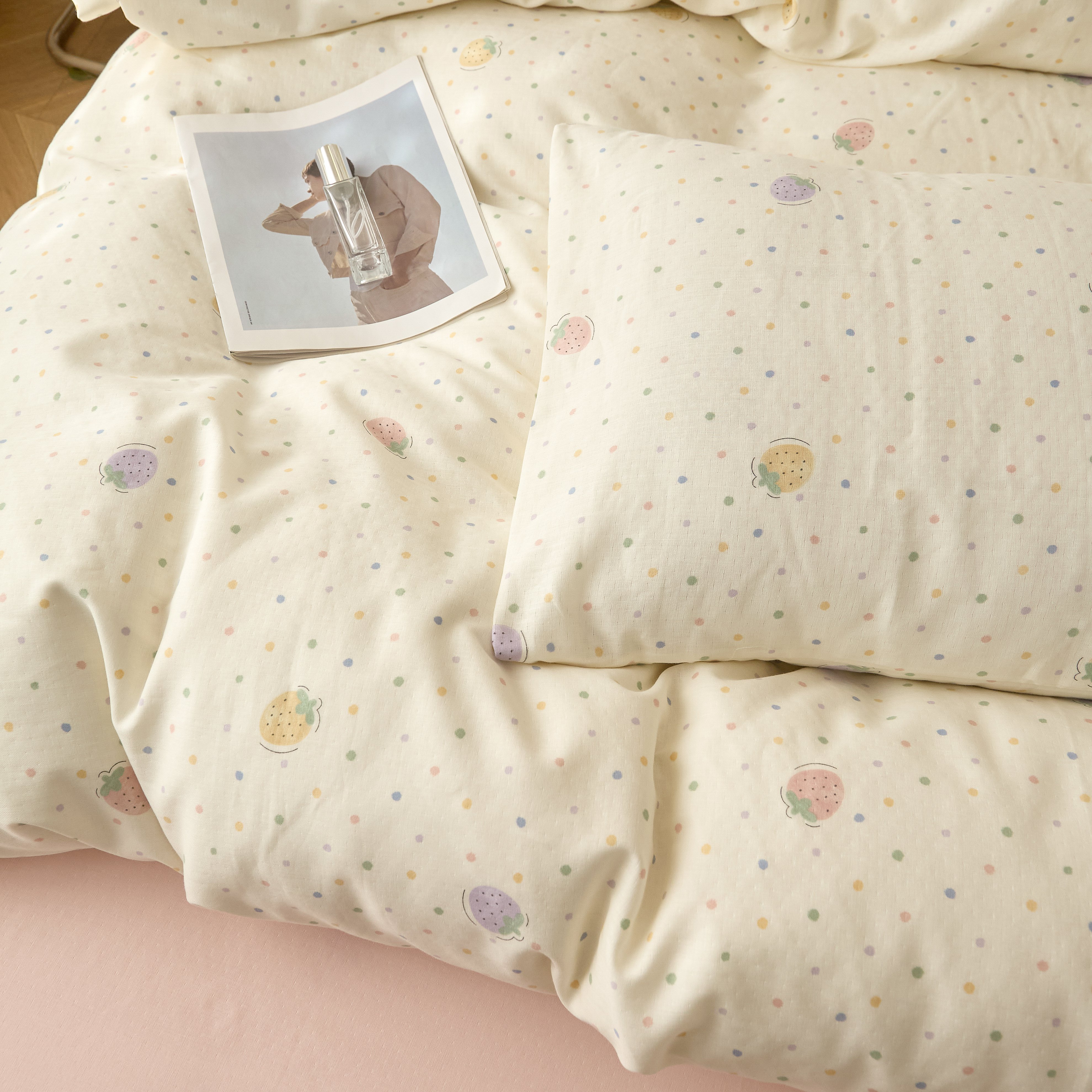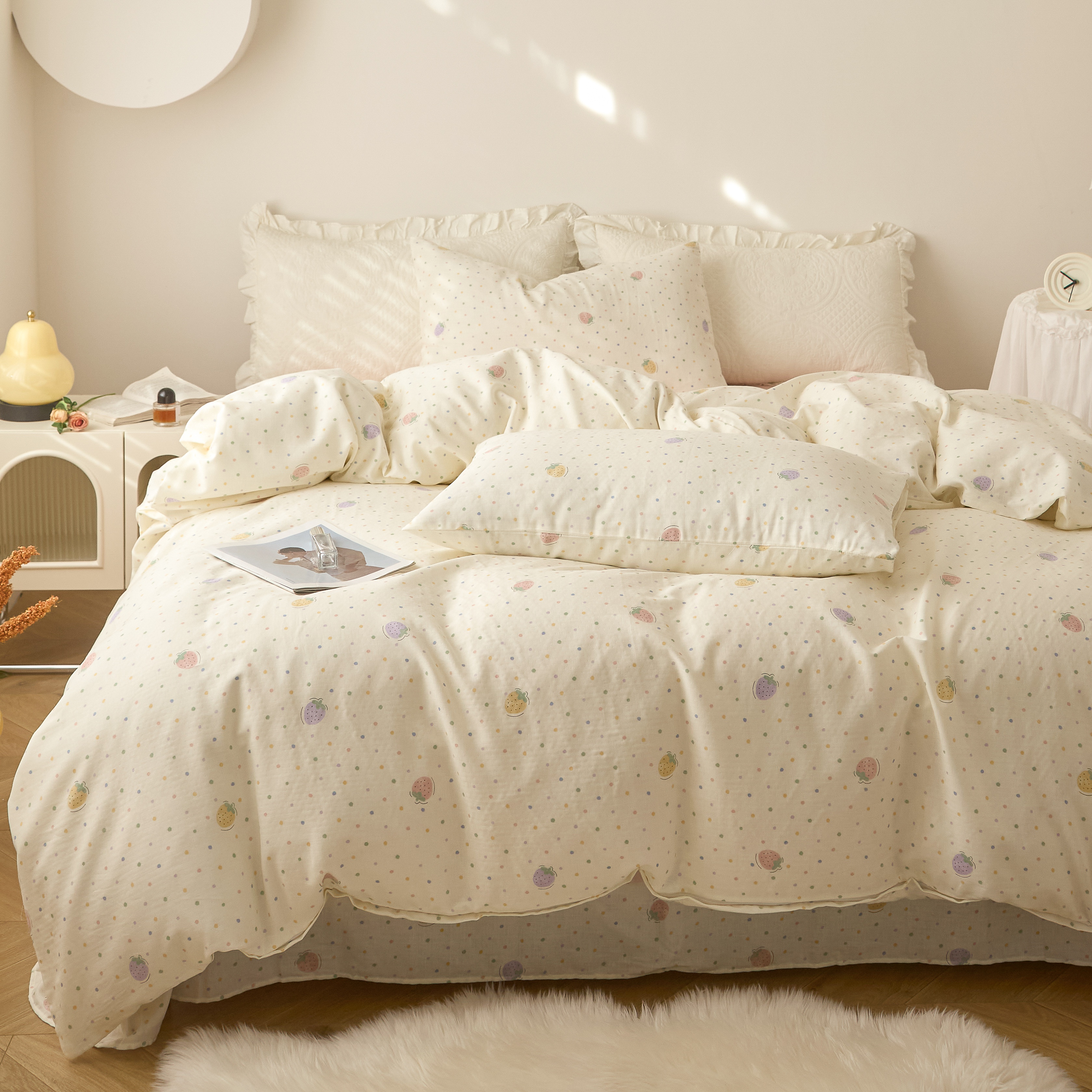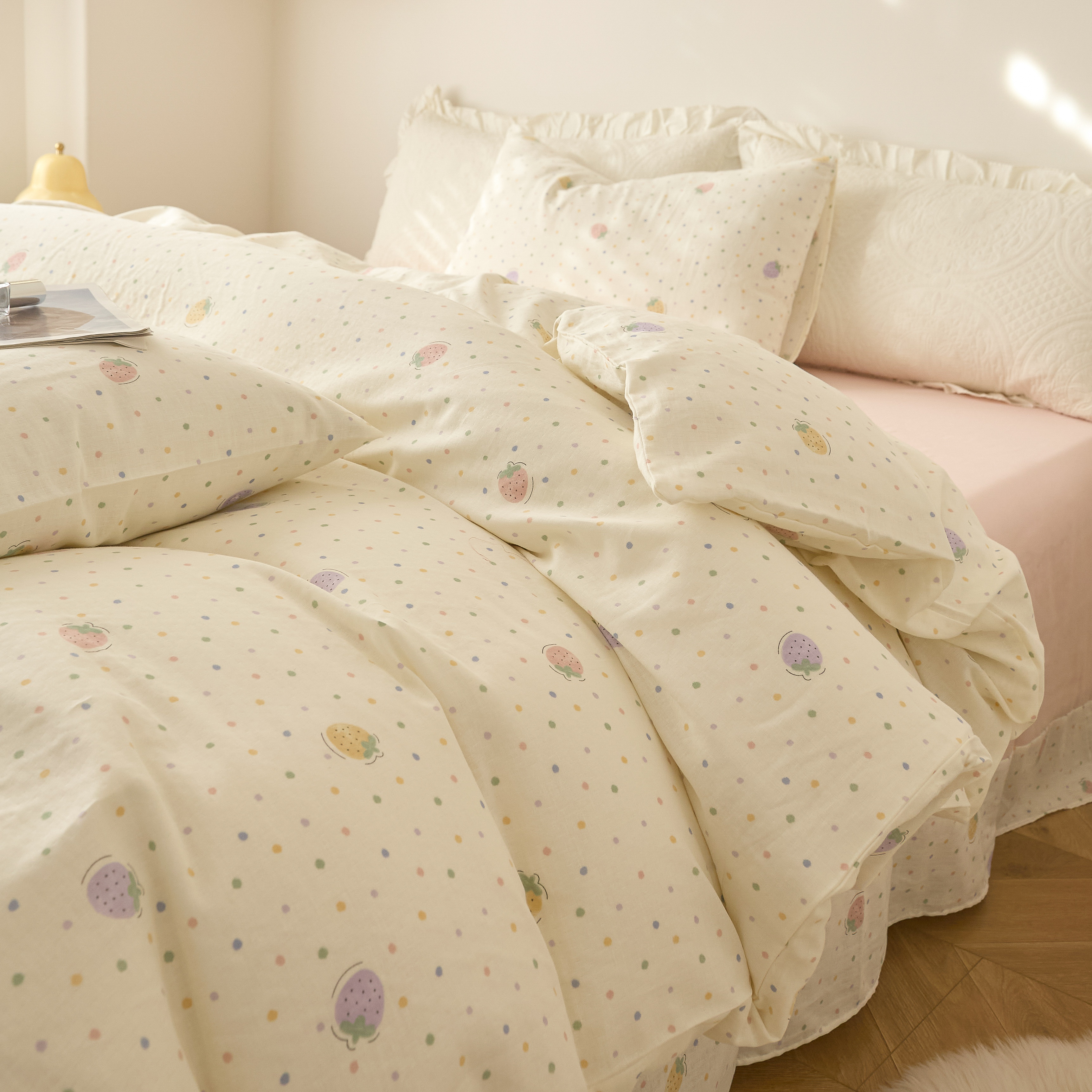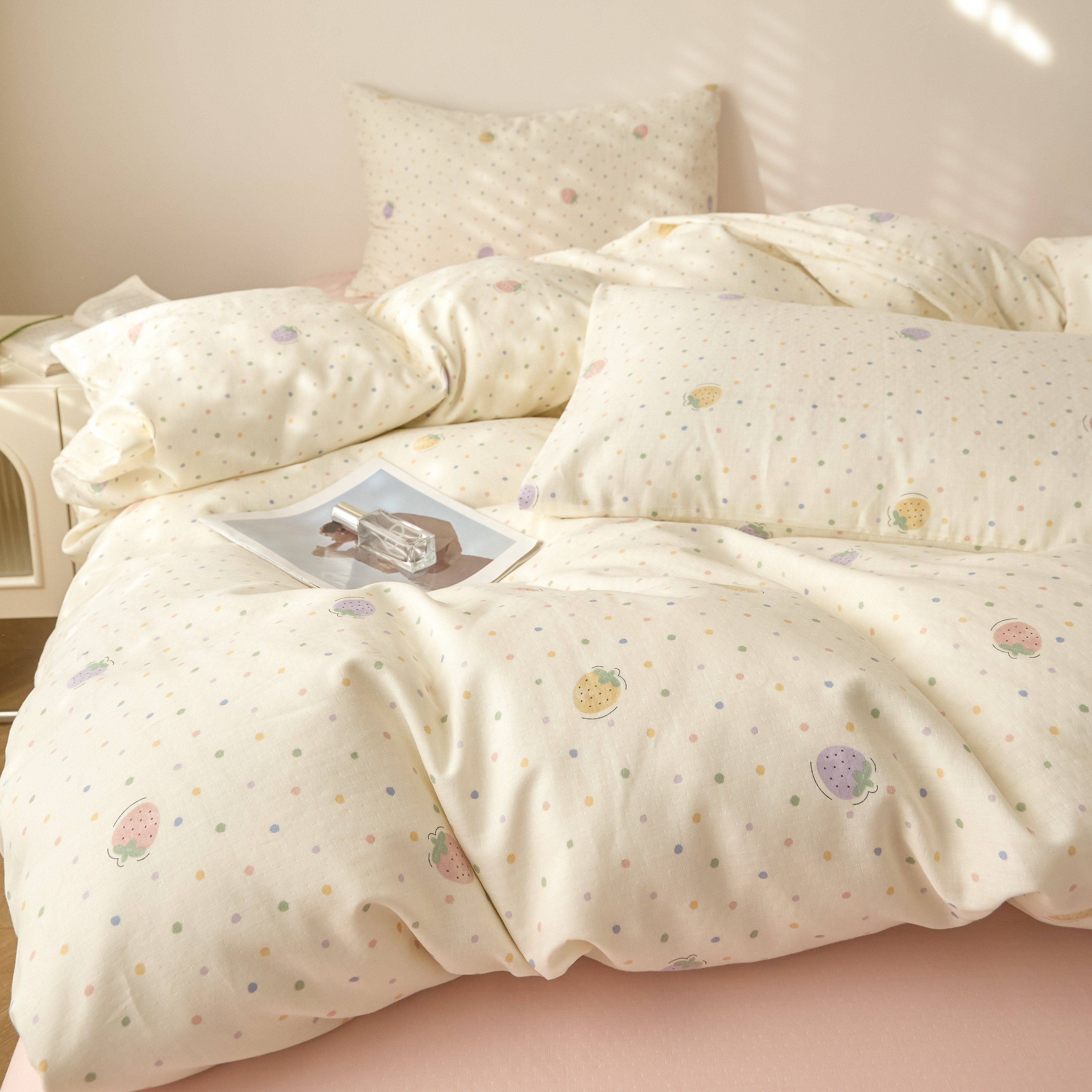 商品名称:嘉汀兰家居 2025新款圆角花边款全棉纯棉A类母婴级有氧全棉双层纱亲肤全棉小清新印花四件套 五彩草莓