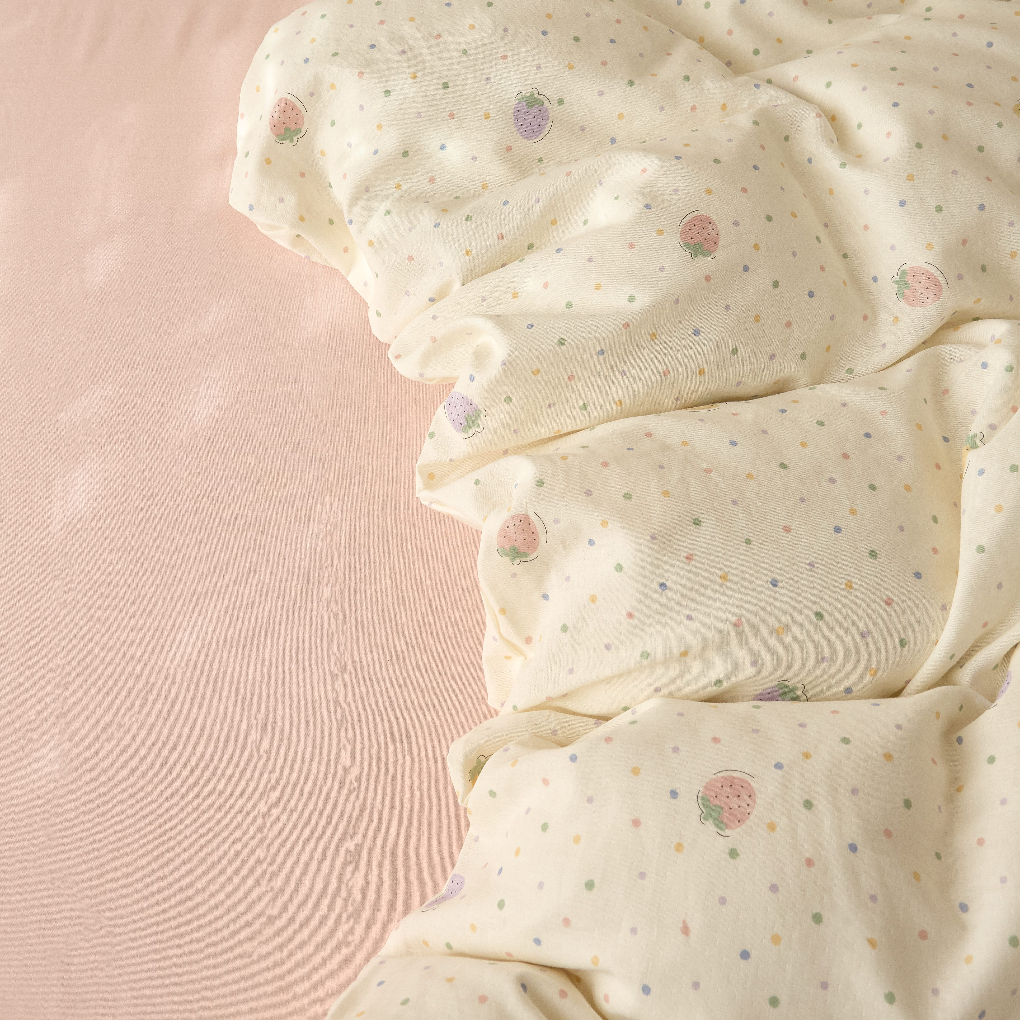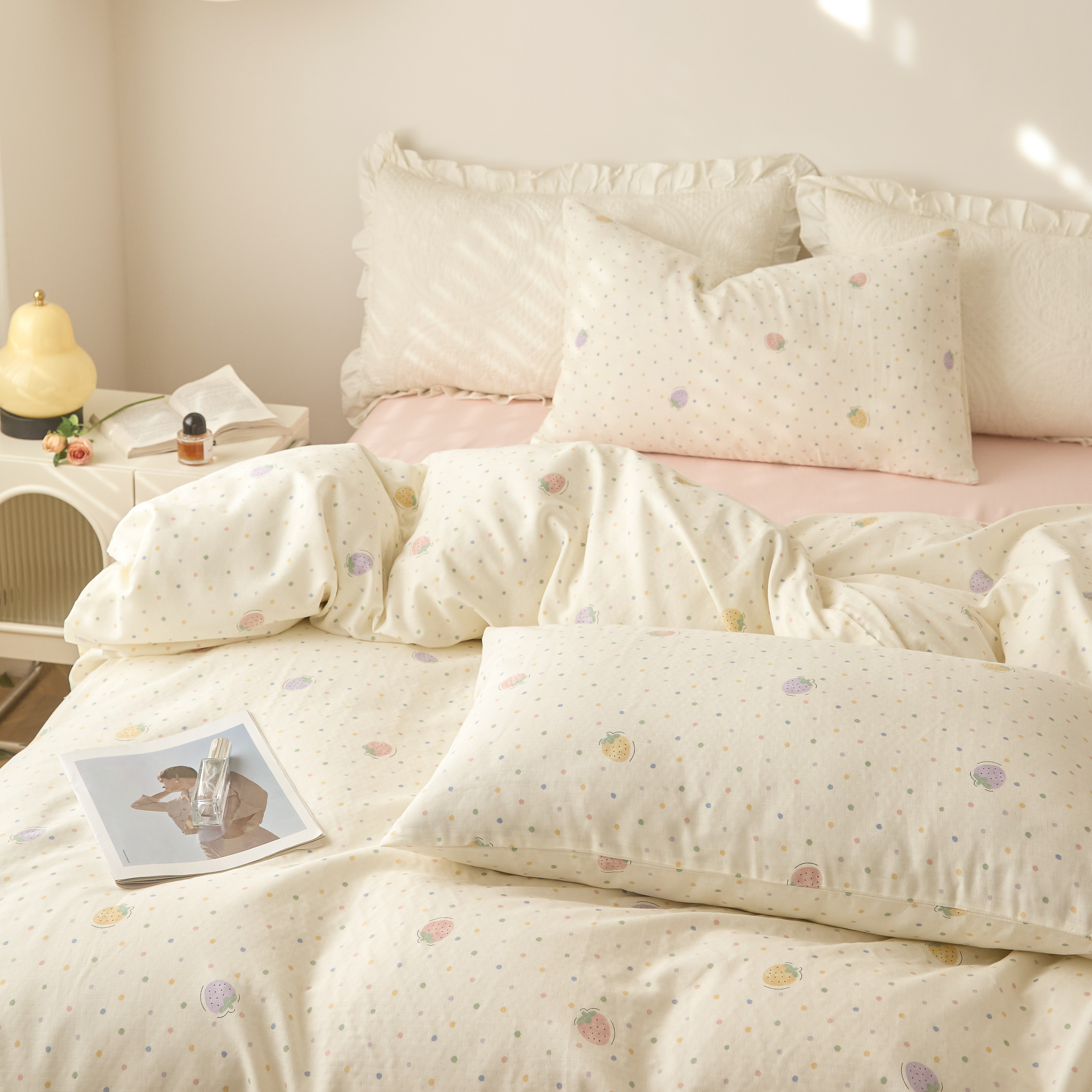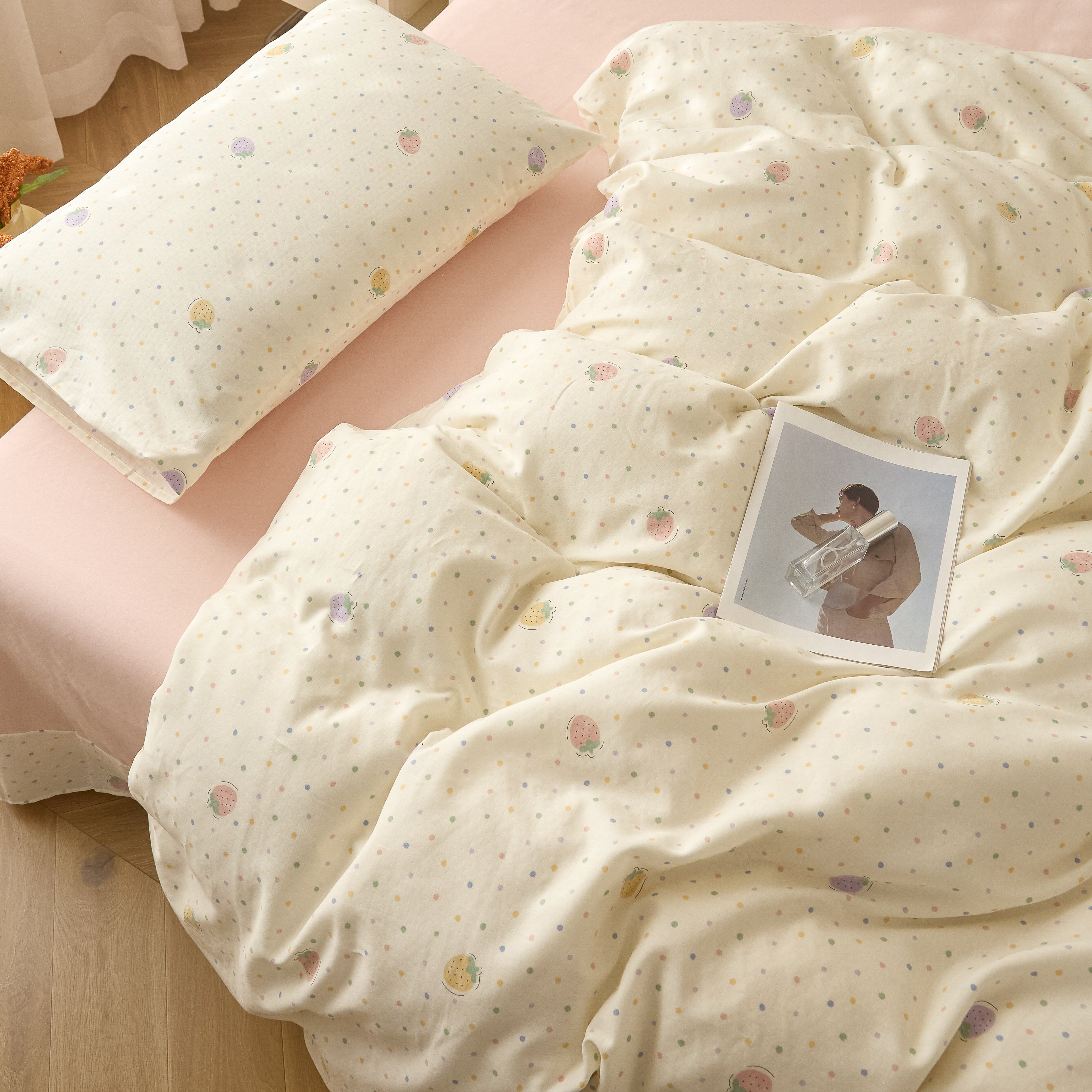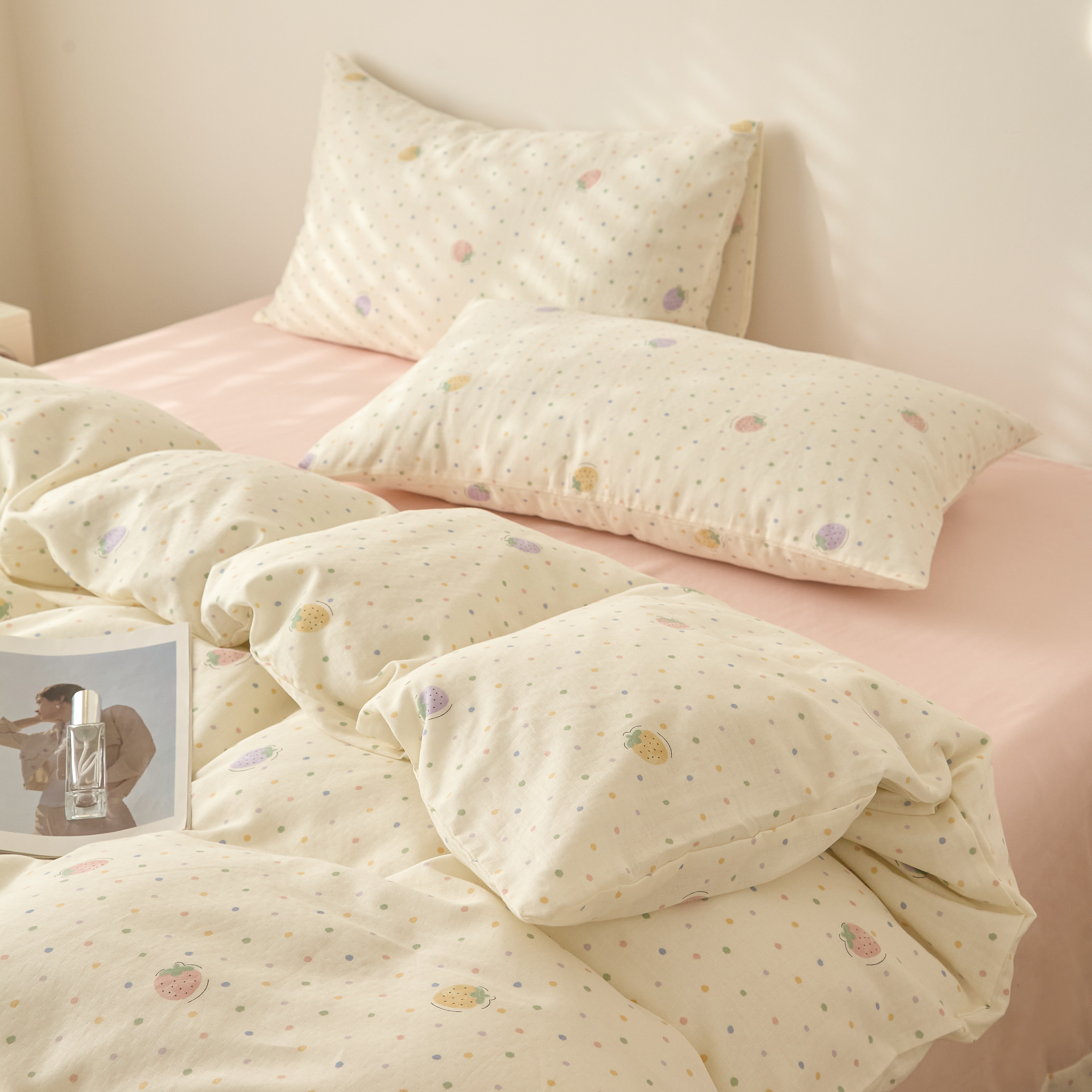 商品名称:嘉汀兰家居 2025新款圆角花边款全棉纯棉A类母婴级有氧全棉双层纱亲肤全棉小清新印花四件套 五彩草莓