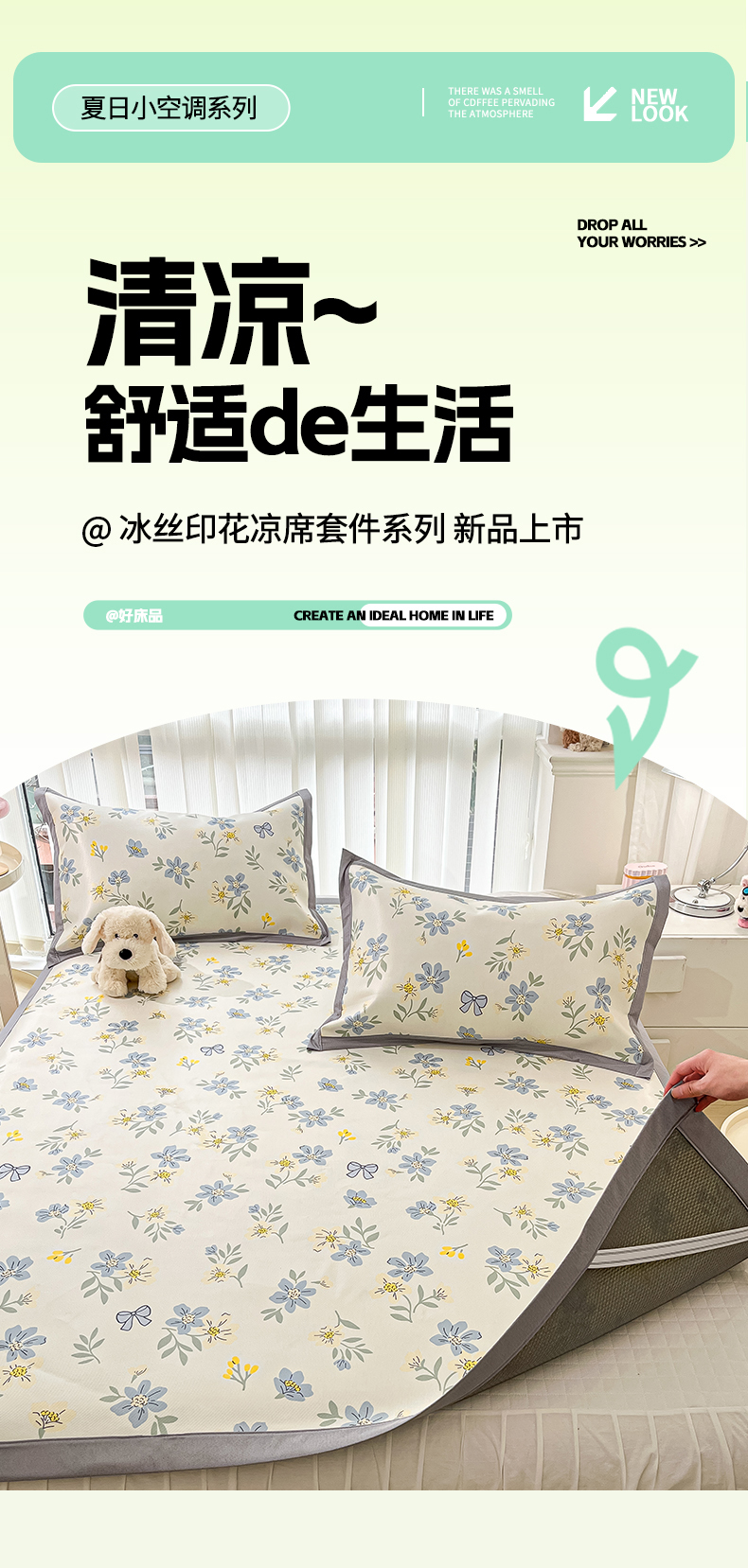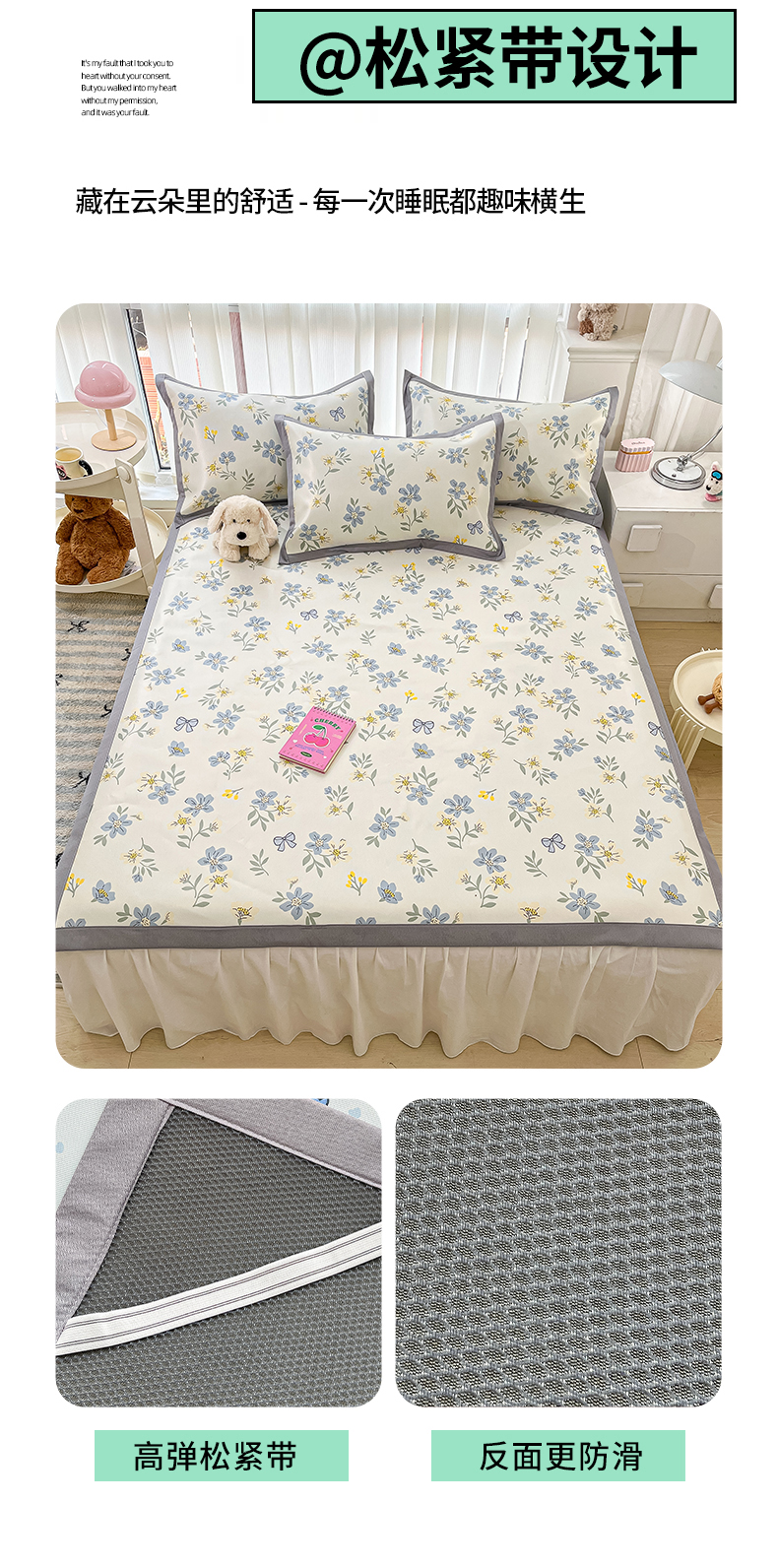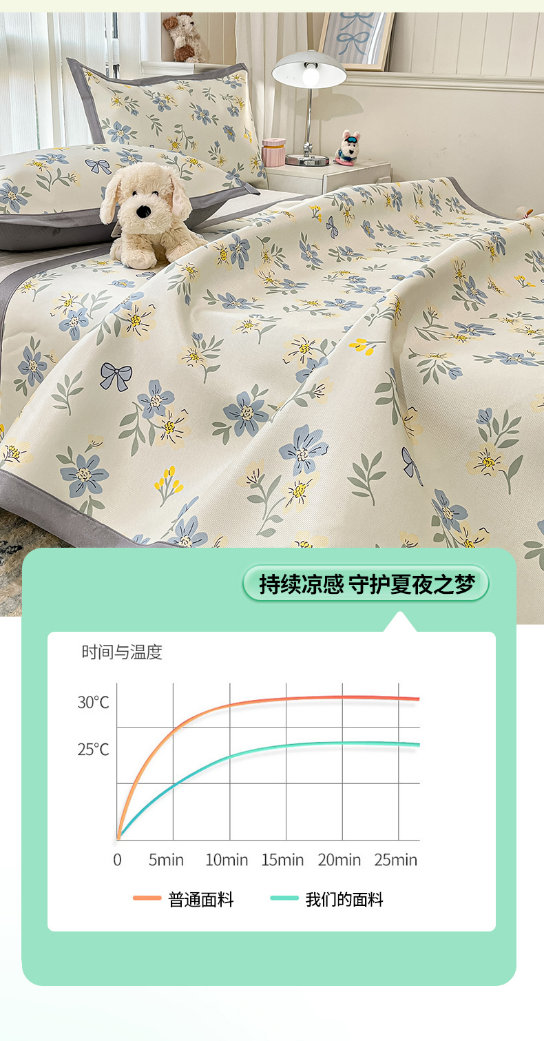 商品名称:川悦生活 2025新款600D立体宽边冰丝印花凉席 花月青啬