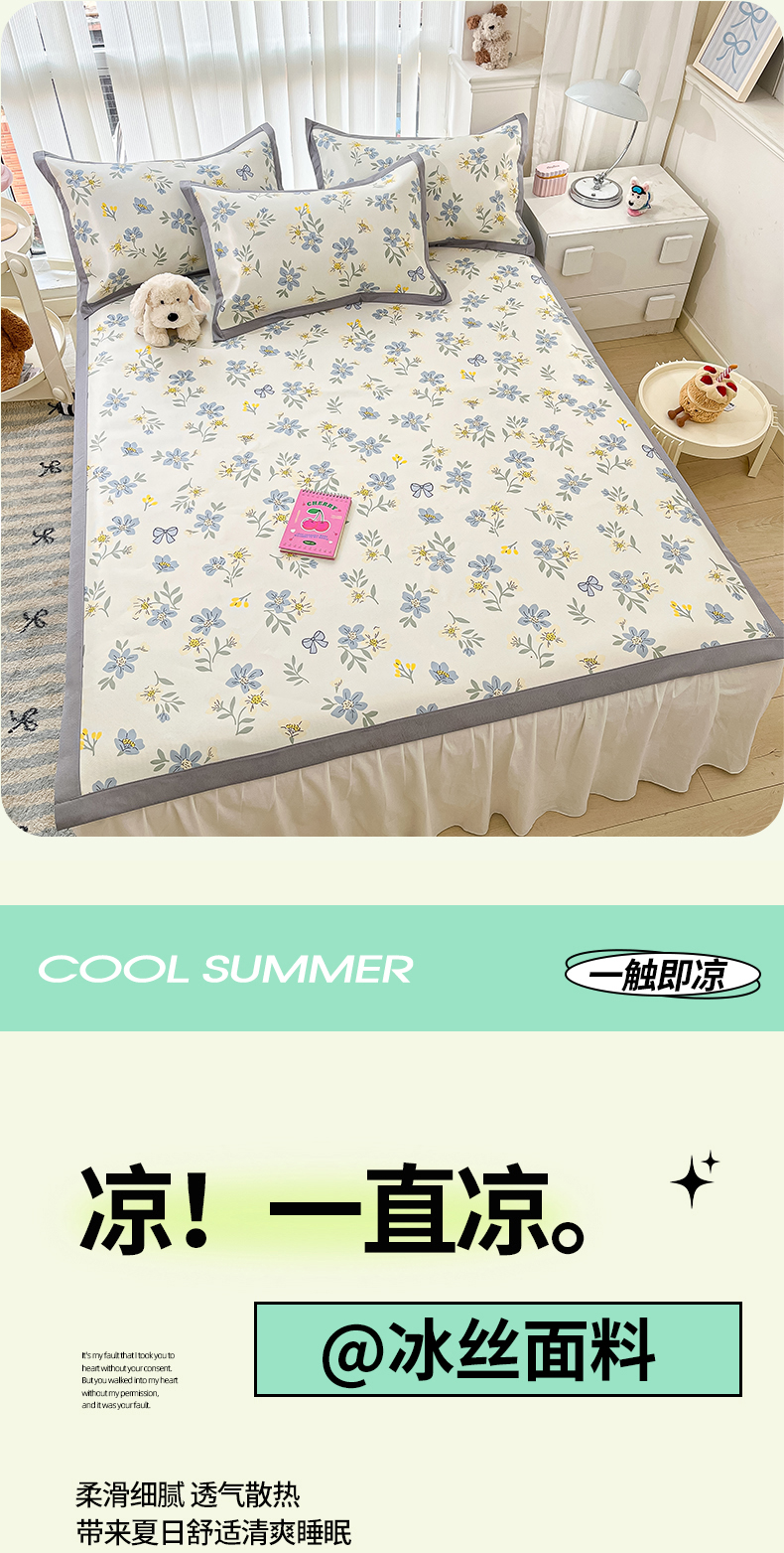 川悦生活 2025新款600D立体宽边冰丝印花凉席 花月青啬