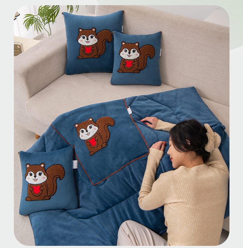 宝马家纺(原梦童画) 2025新款牛奶绒小松鼠抱枕被 宾利蓝