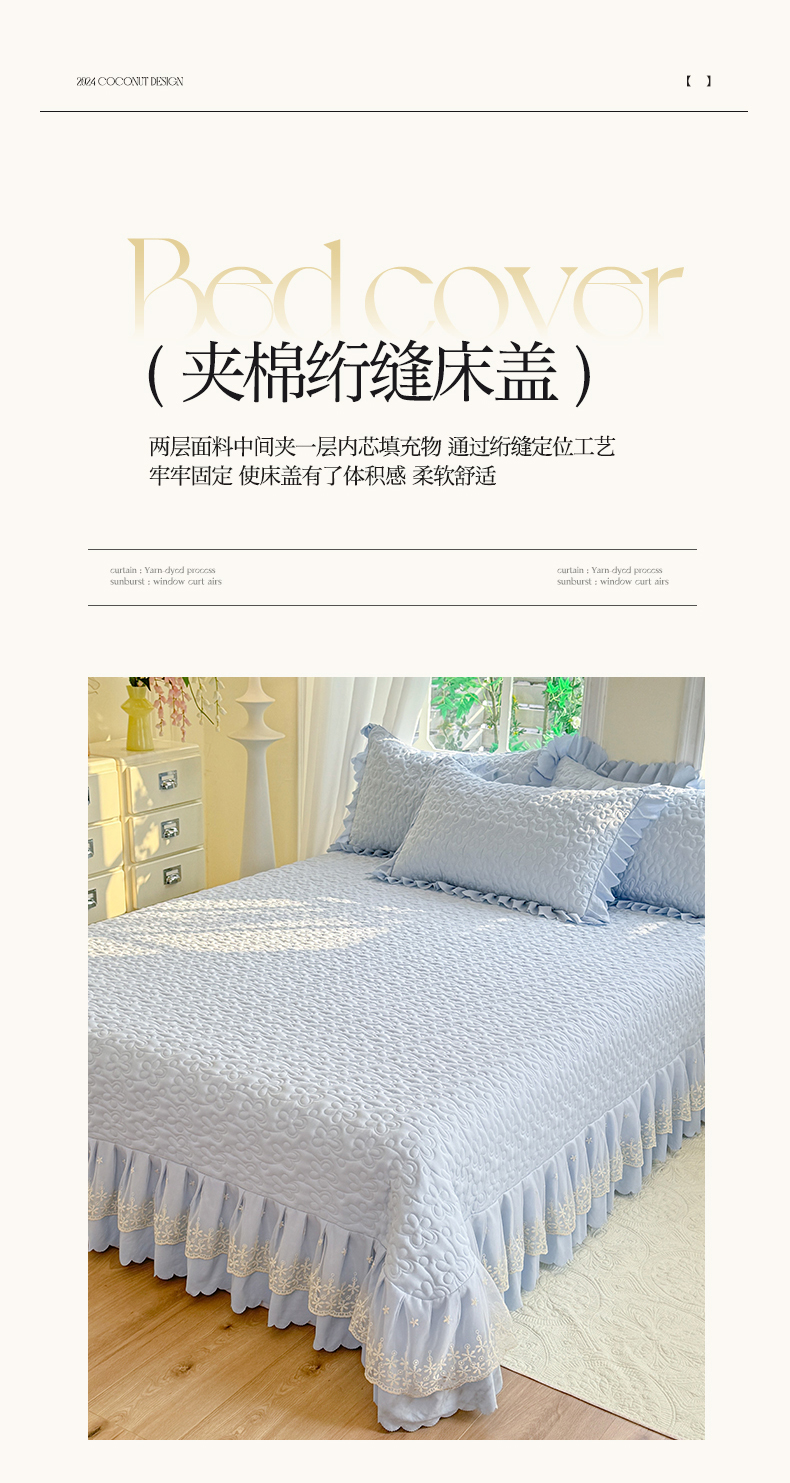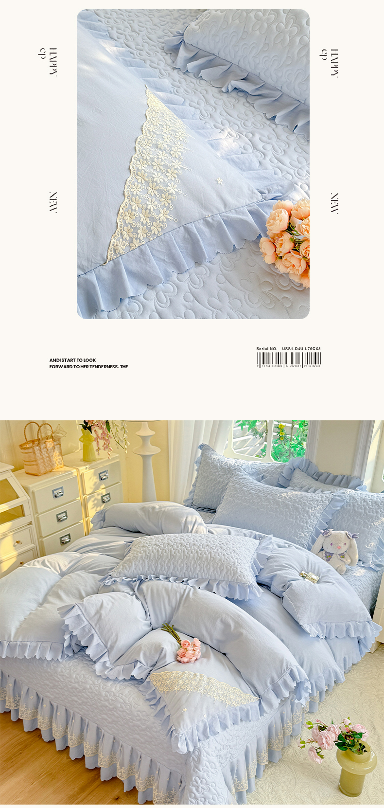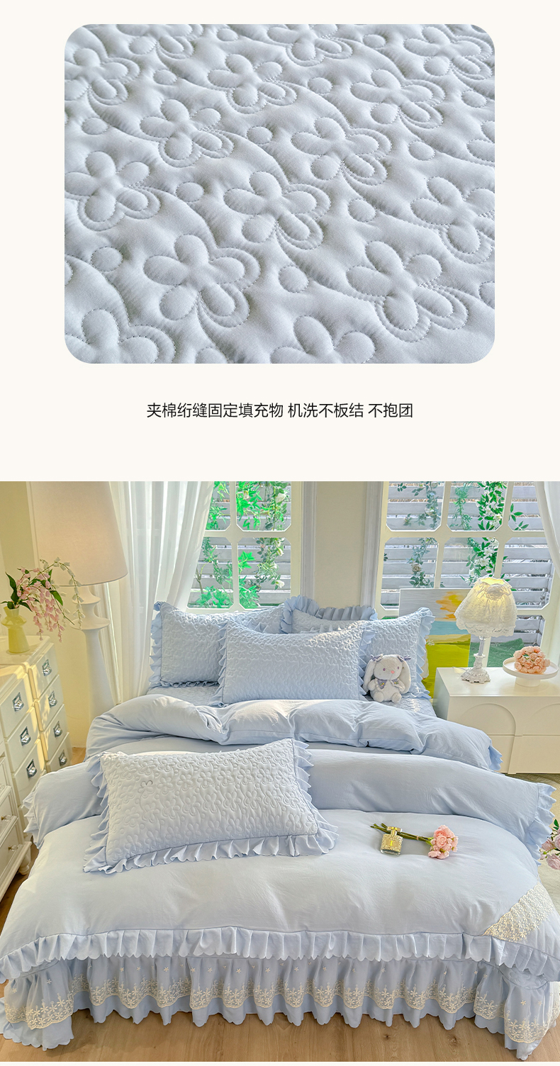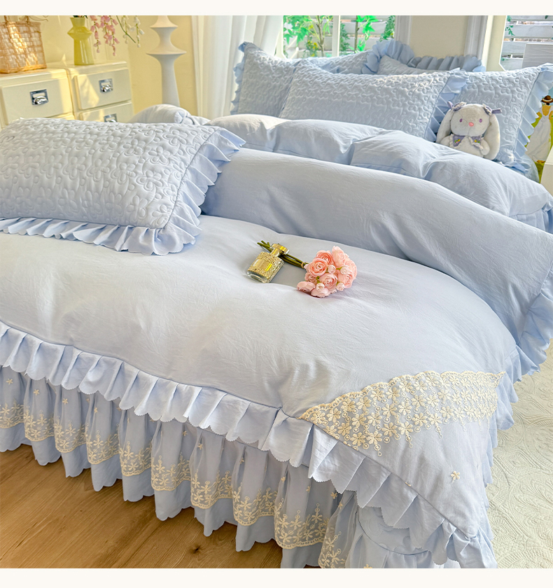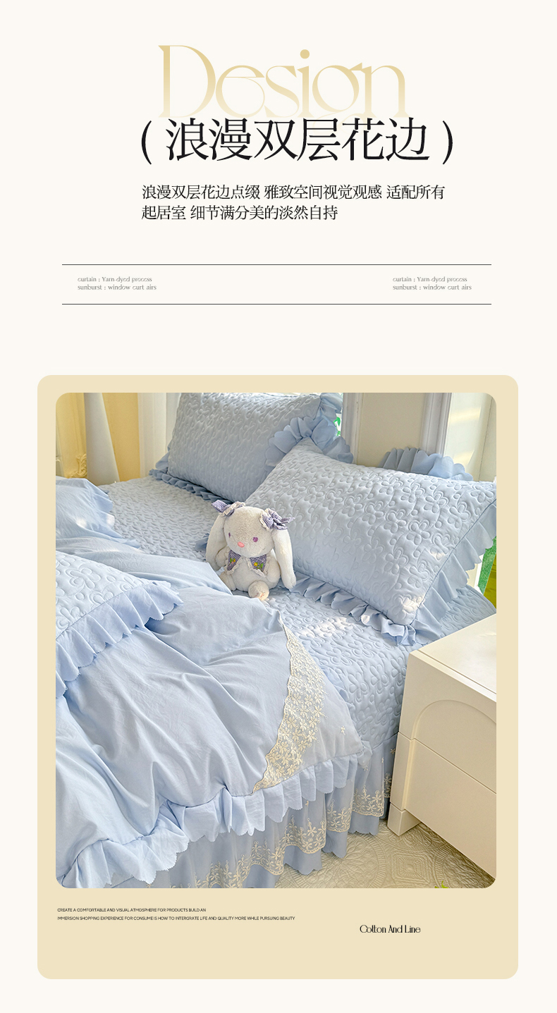 当前位置: 91家纺网 > 商品网购 > 床品套件 > 四件套 > 其它四件套 > 九诺家纺 2025新款花夕云朵棉蕾丝花边床盖四件套 花夕-天空蓝