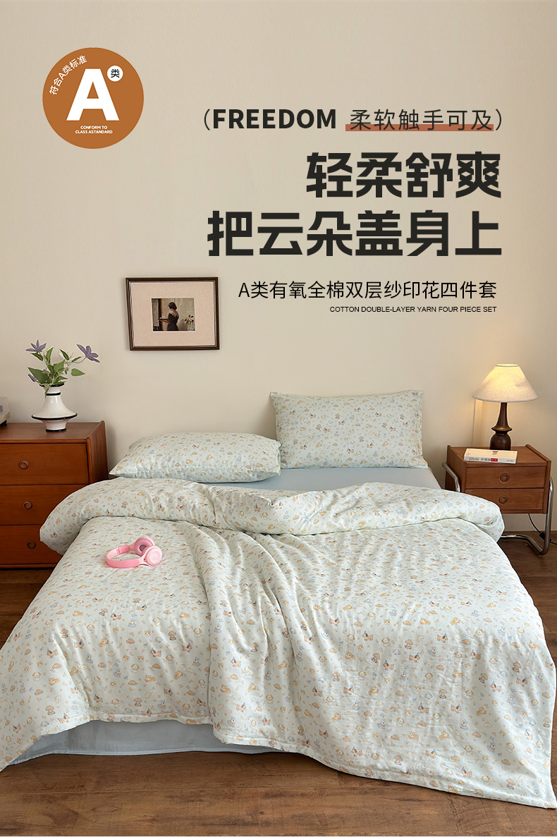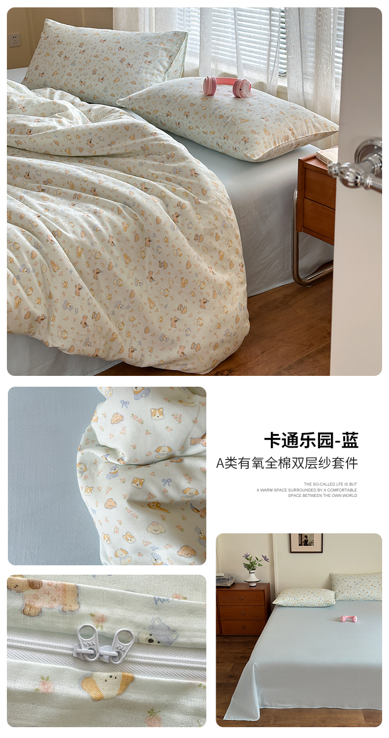 当前位置: 91家纺网 > 商品网购 > 床品套件 > 四件套 > 双层纱四件套 > 亿梵家居 2025新款A类母婴级有氧全棉纯棉双层纱纯棉印花四件套-床拍图卡通乐园-蓝