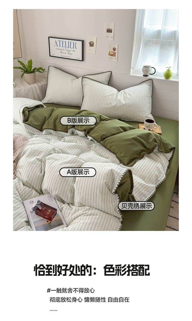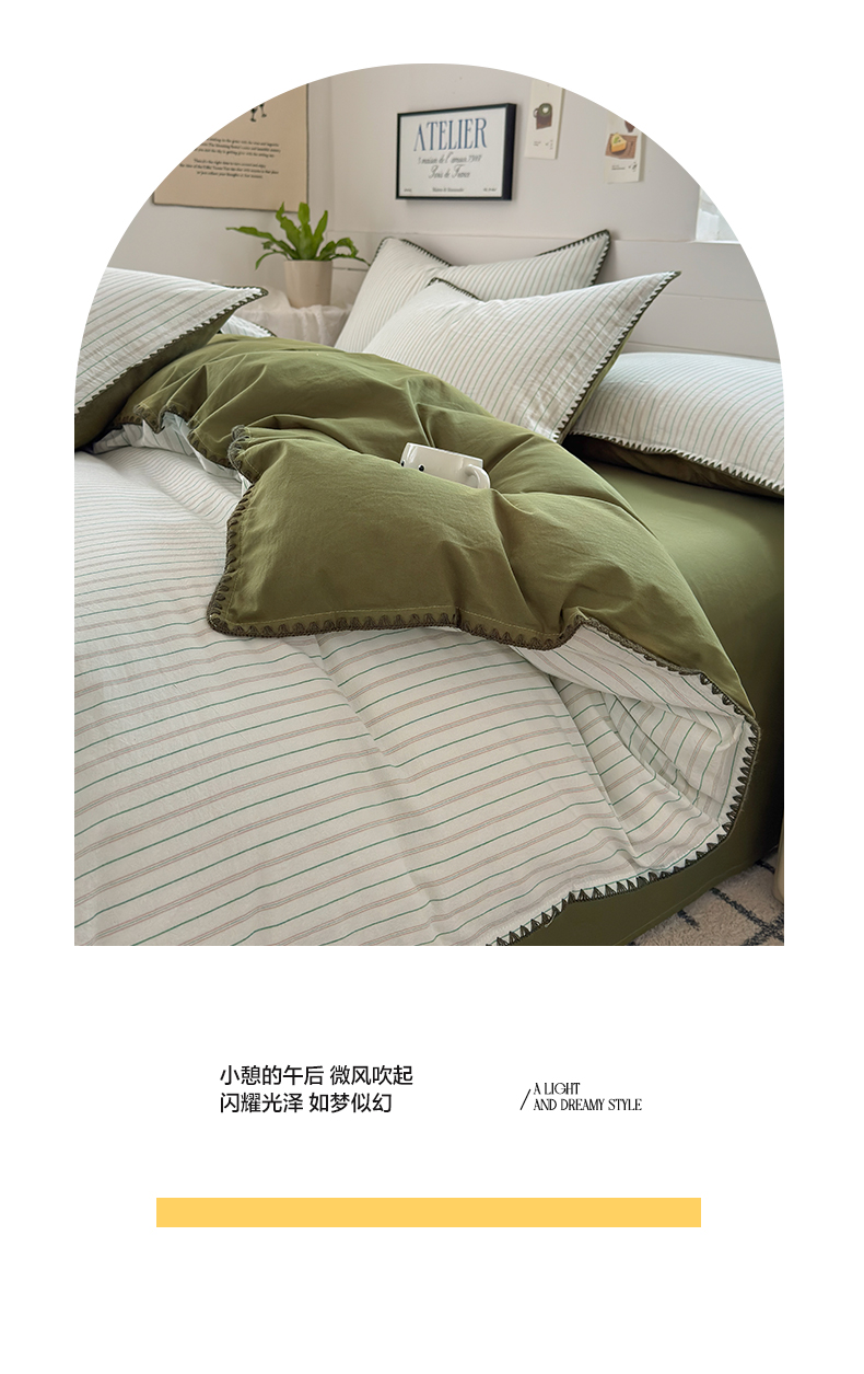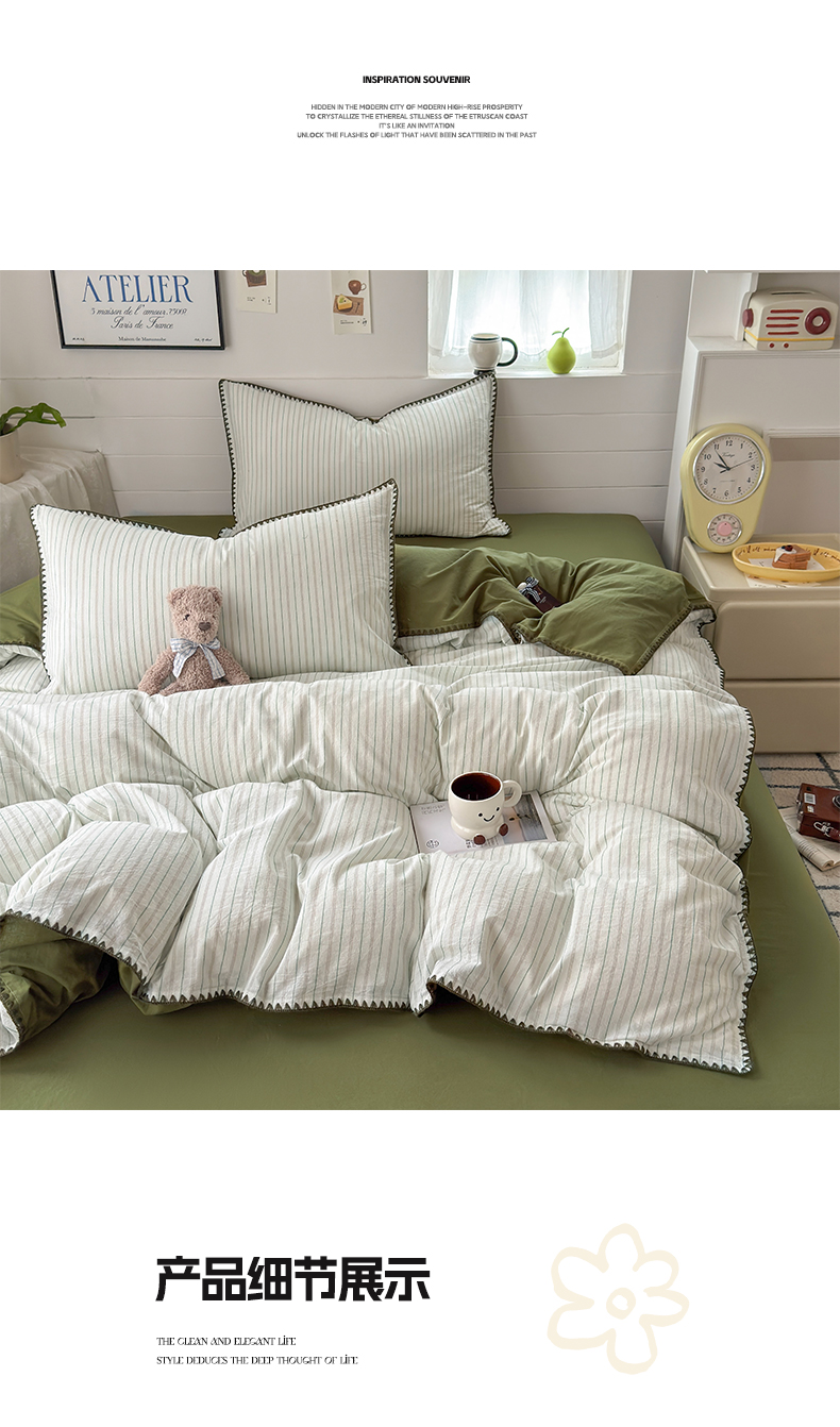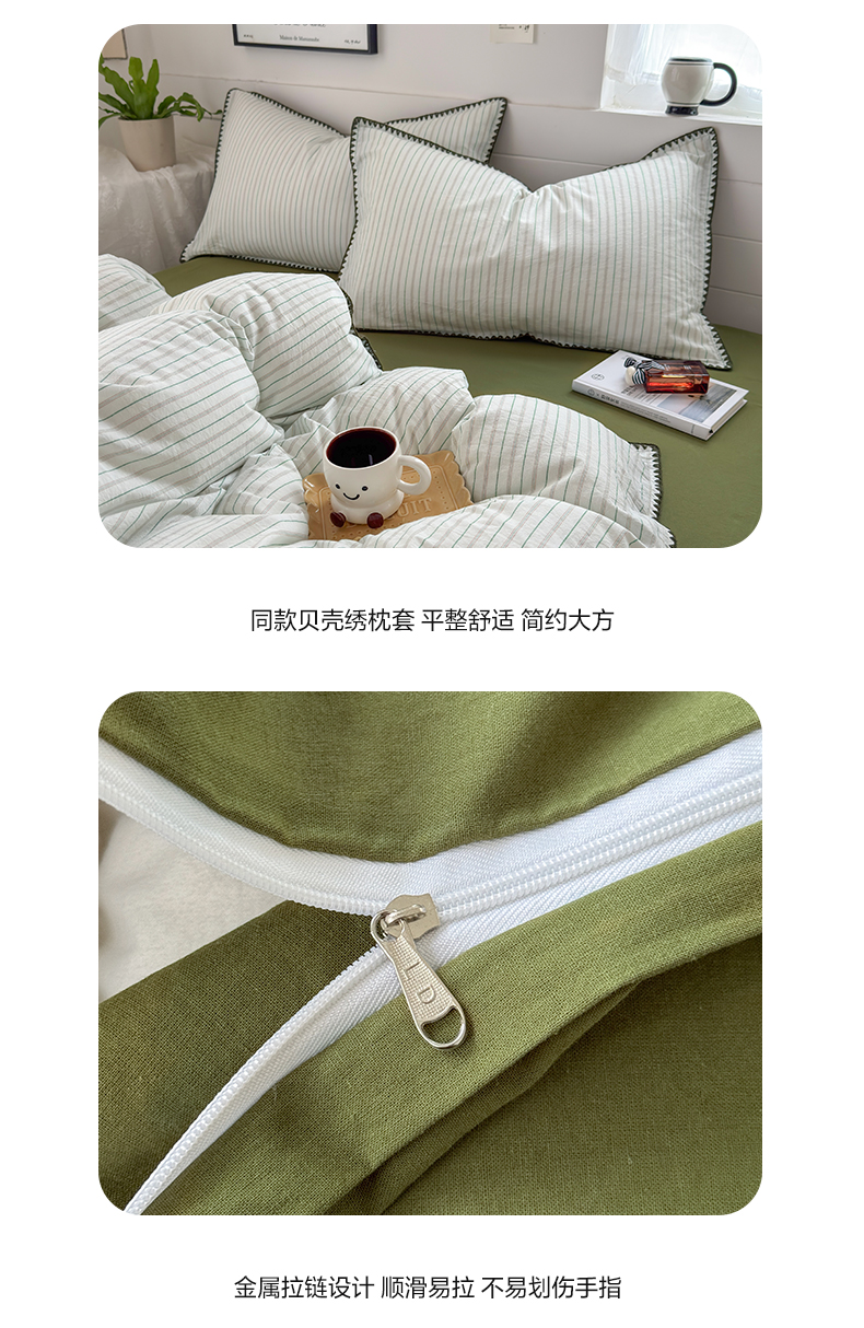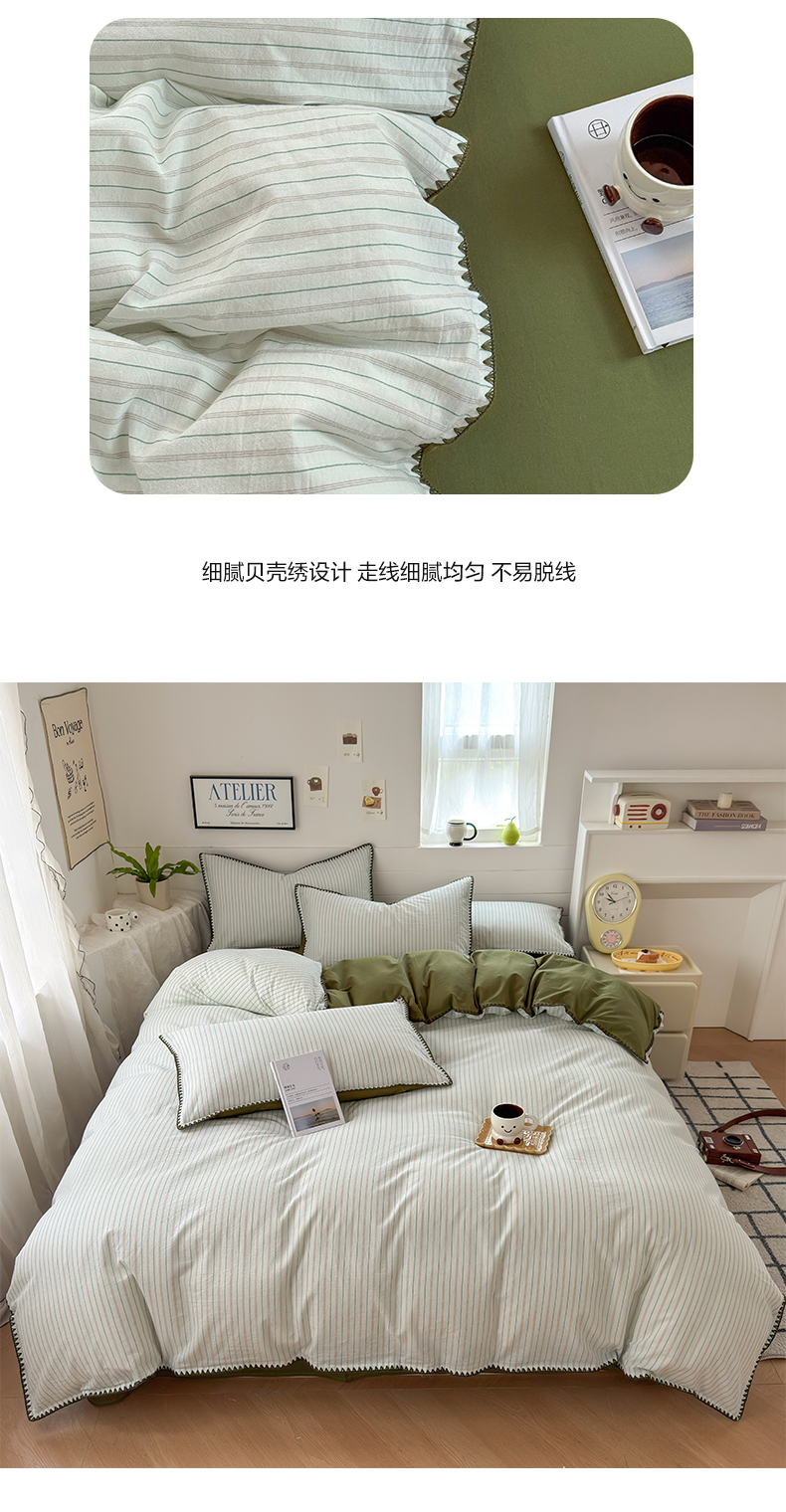 当前位置: 91家纺网 > 商品网购 > 床品套件 > 四件套 > 水洗棉四件套 > 2025新款A类全棉色织水洗棉贝壳绣条纹系列四件套 柒夏绿