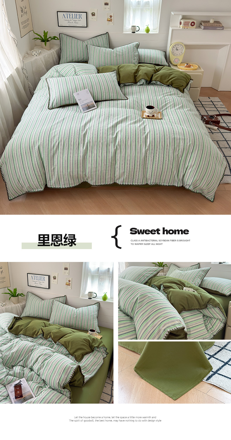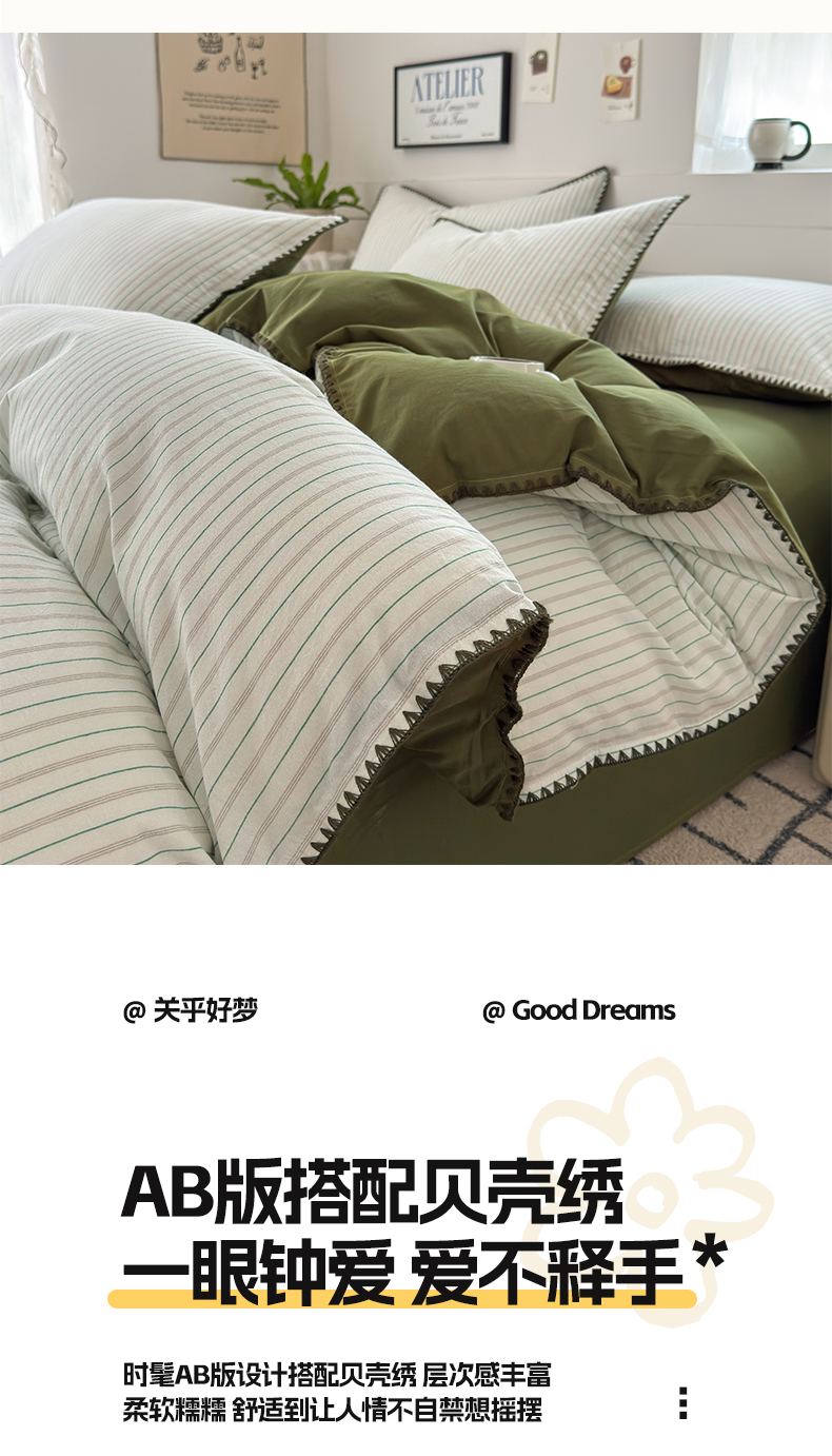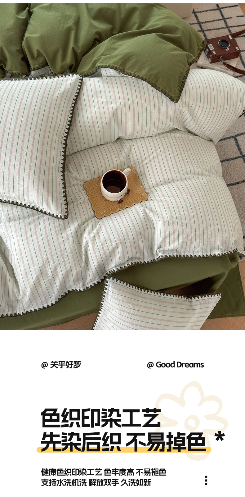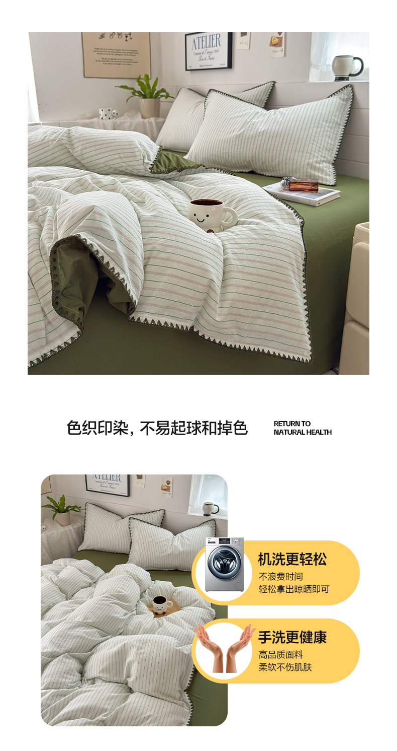 当前位置: 91家纺网 > 商品网购 > 床品套件 > 四件套 > 水洗棉四件套 > 2025新款A类全棉色织水洗棉贝壳绣条纹系列四件套 柒夏绿