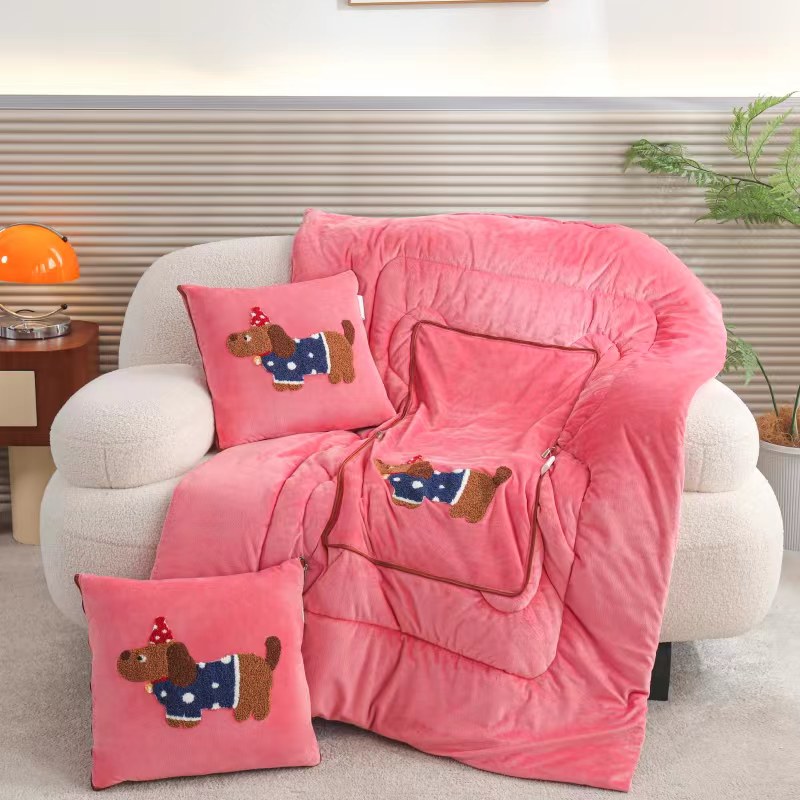 枕芯真意 2025新款毛巾绣刺绣小狗系列多功能抱枕被--腊肠狗 腊肠狗-胭脂红
