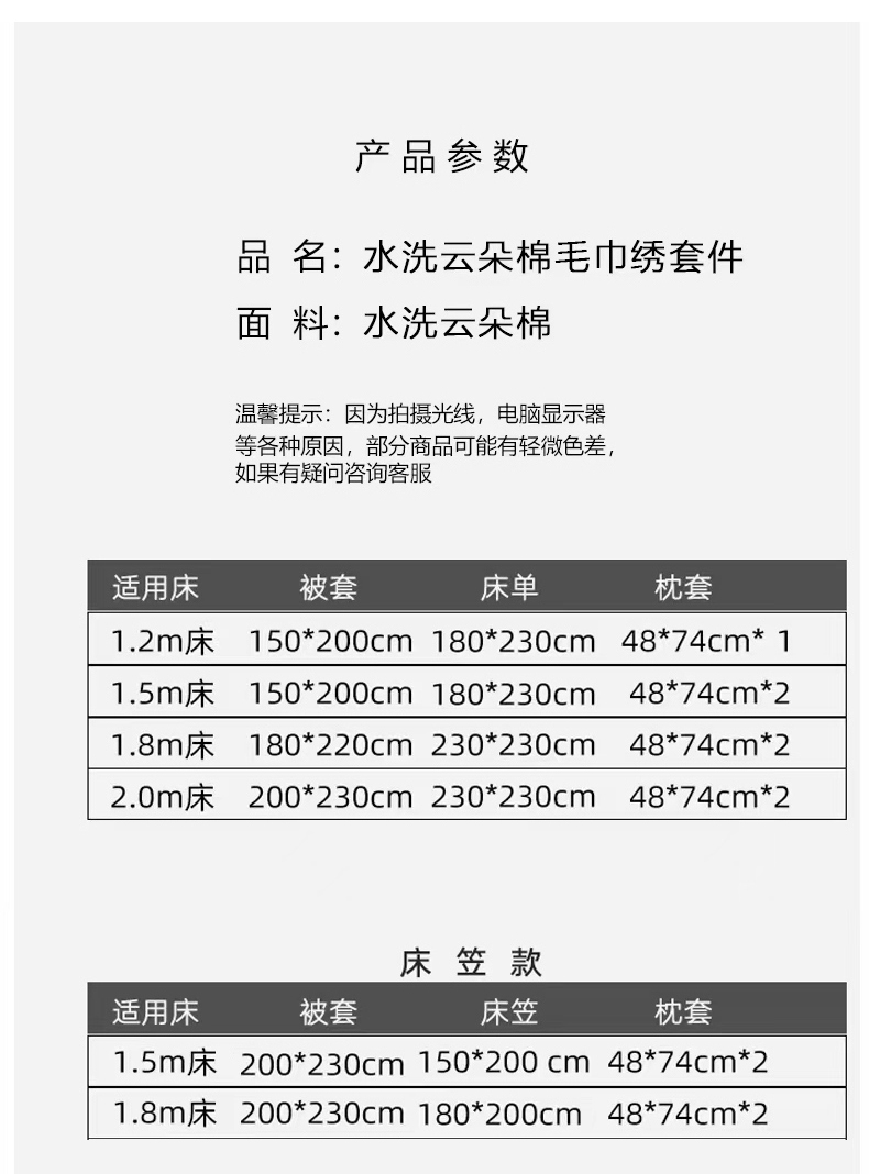 2.0米:被套2.0*2.3米 床笠1.8*2.0米 枕套 47*74*2 | ¥75.00 |