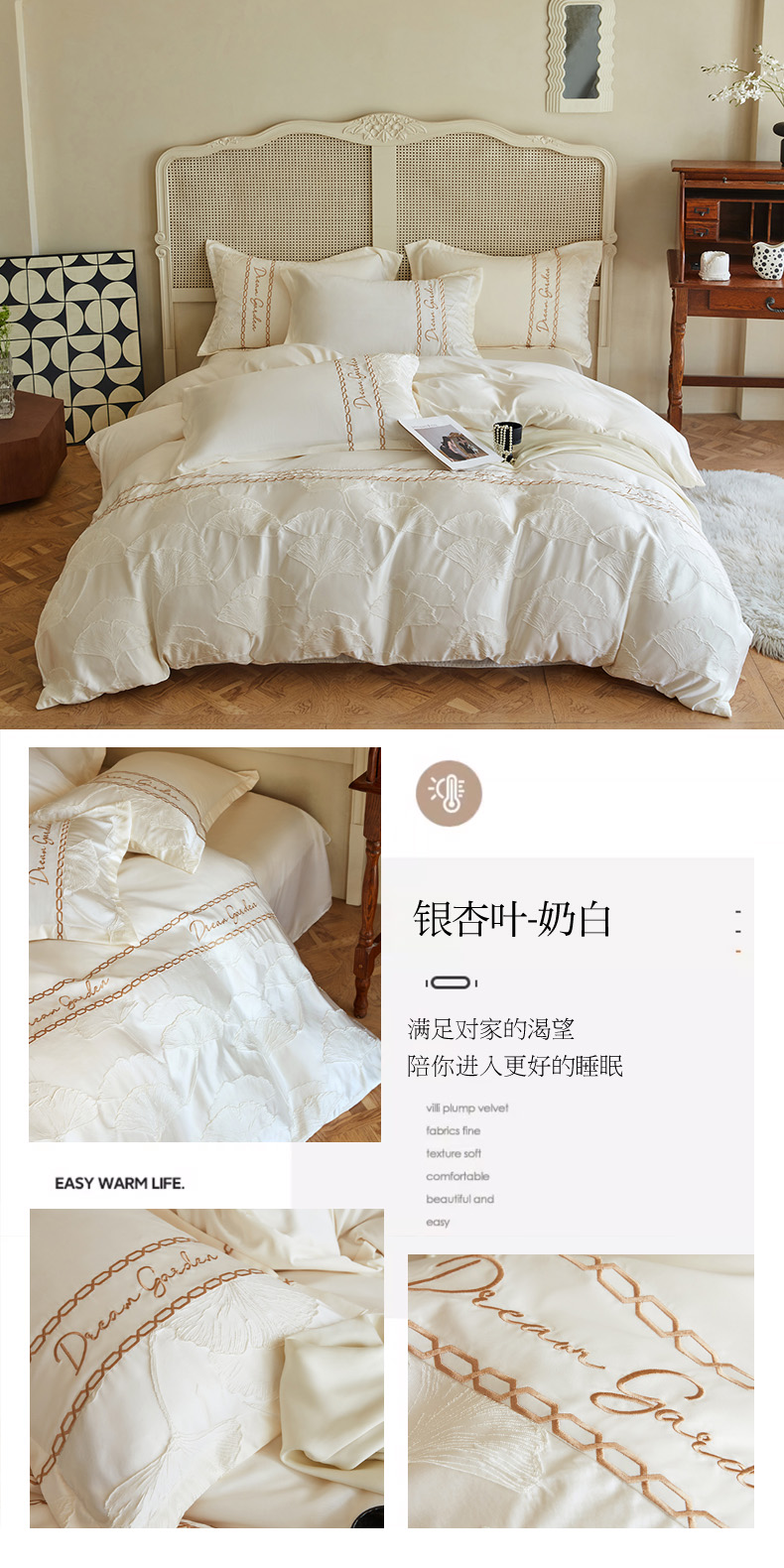 商品名称:菲儿2025新款冰丝浮雕提花绣花四件套 银杏叶-奶白