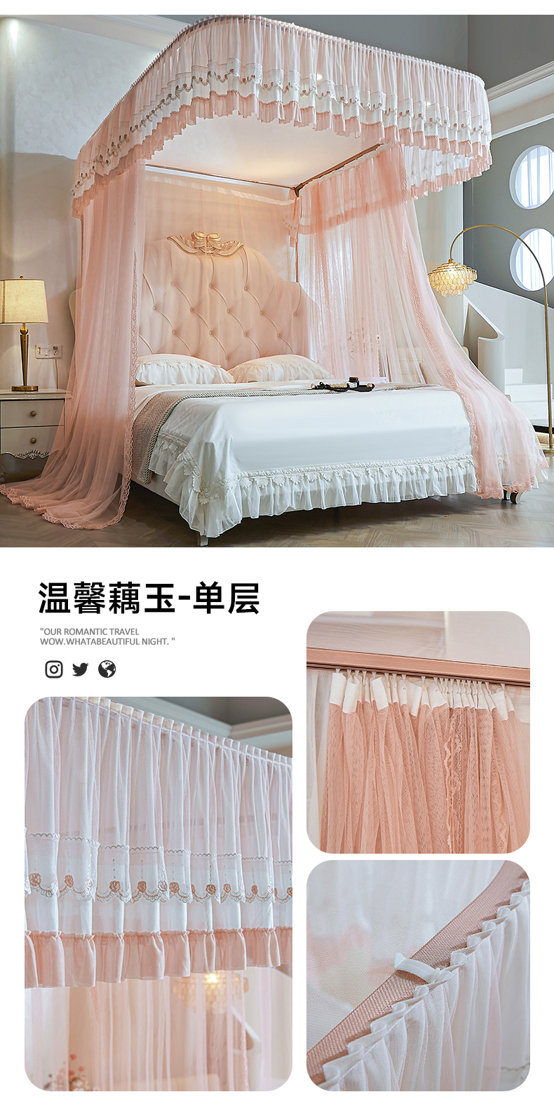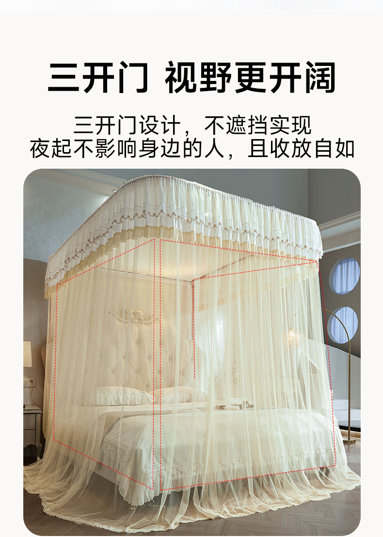 (总)2025新款双层花边全包围床笠款三开门蚊帐-幽梦星辰,奶黄,藕玉,颜淡蓝