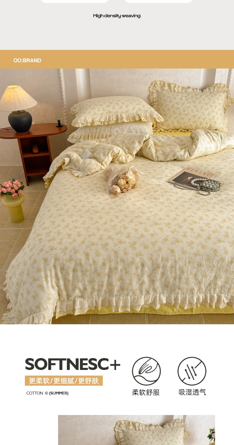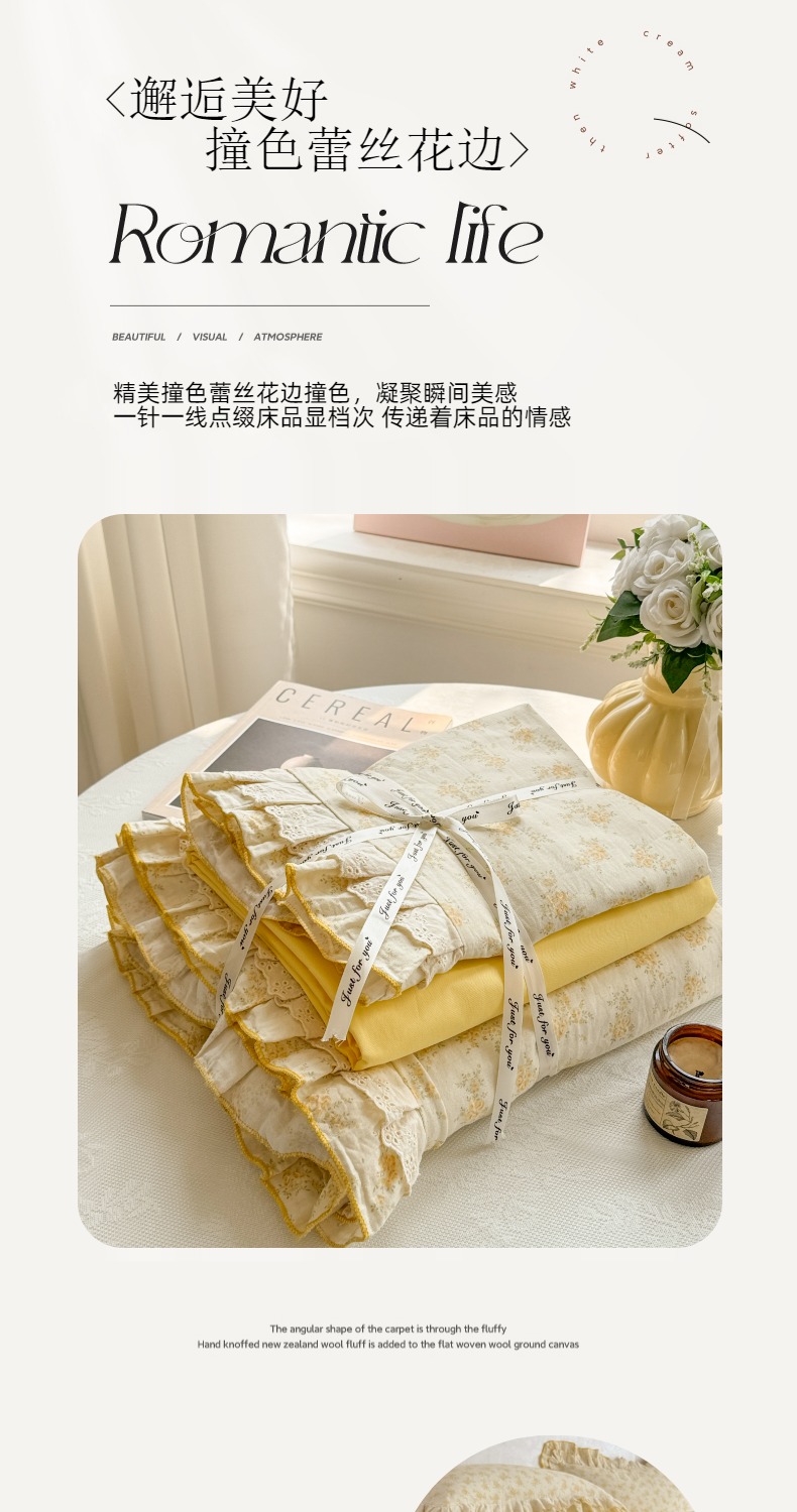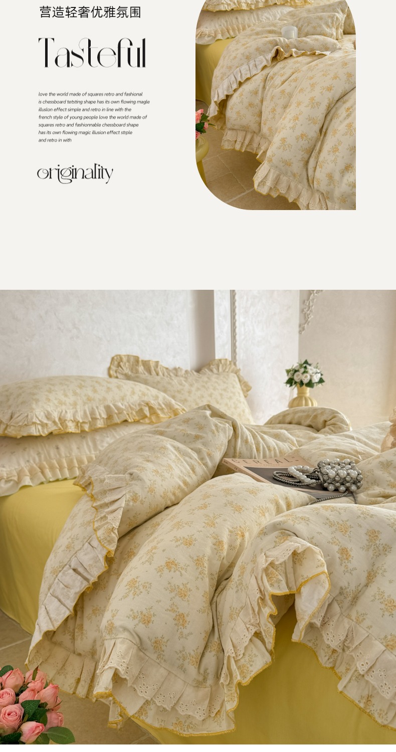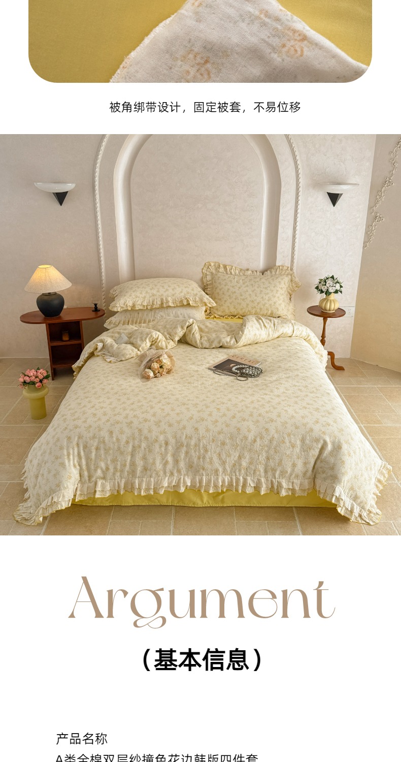 商品名称:简宜家居(朝初家纺) 2025新款40s全棉纯棉双层纱撞色蕾丝花边四件套 黄玫暖居