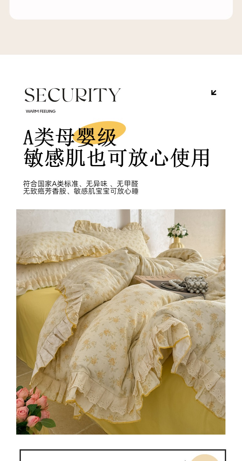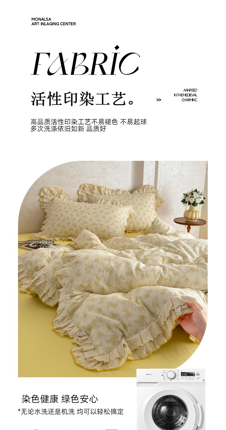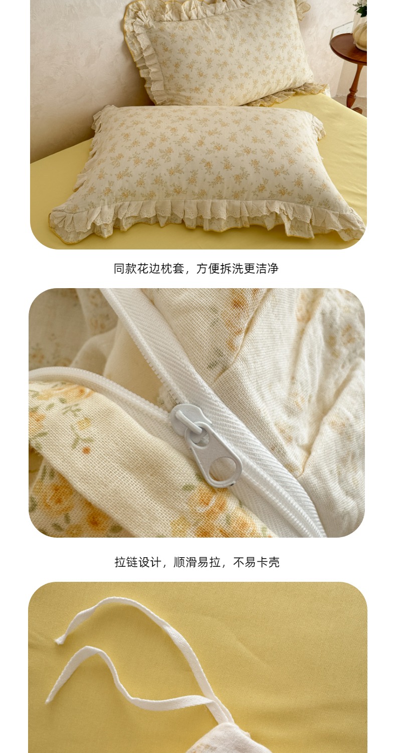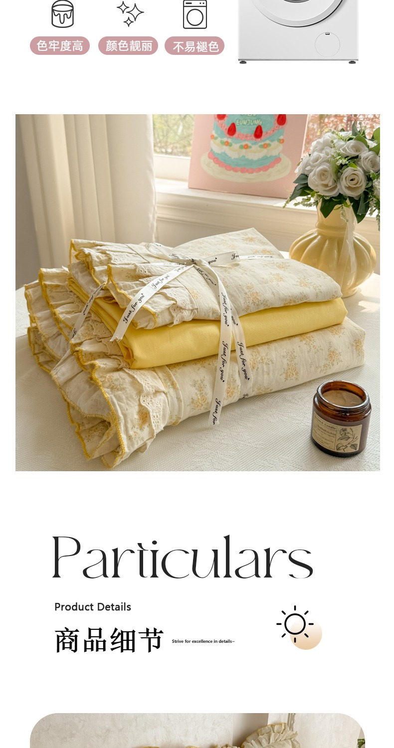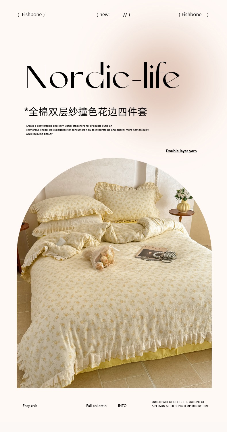 商品名称:简宜家居(朝初家纺) 2025新款40s全棉纯棉双层纱撞色蕾丝花边四件套 黄玫暖居