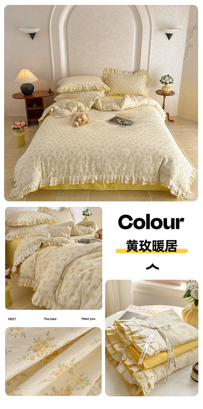 简宜家居(朝初家纺) 2025新款40s全棉纯棉双层纱撞色蕾丝花边四件套 黄玫暖居