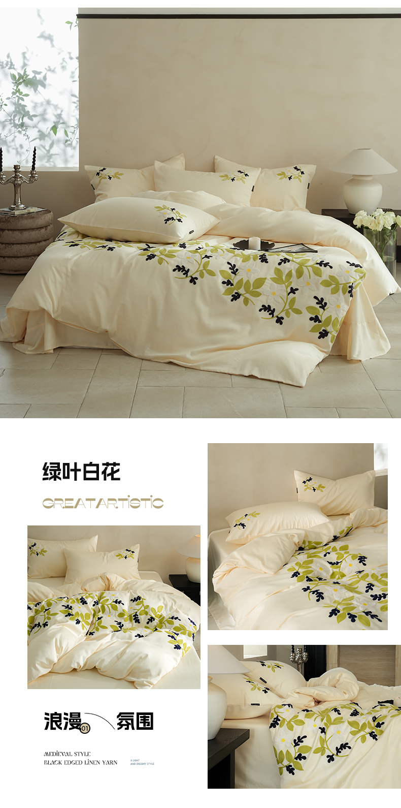 (总)秀色家纺 2025新款小清新60s长绒棉四件套纯棉全棉毛巾绣被套床单轻奢床品-小红书实拍风,绿叶白花,小苍兰,小雏菊