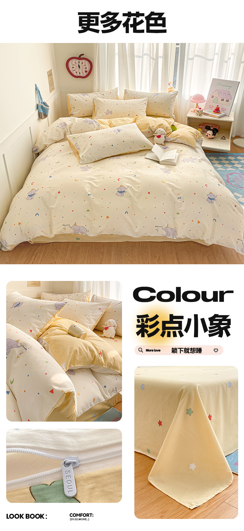 首尔家纺 2025新款学生季全棉跑量款四件套系列卡通小清新AB版学生三件套 彩点小象