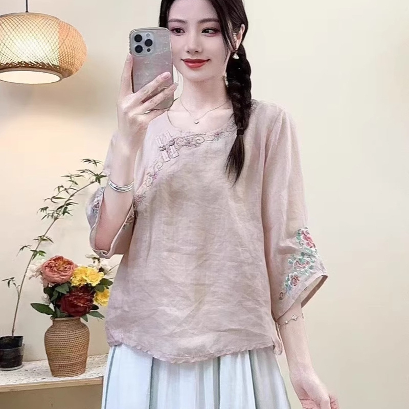 商品名称:洛兰沙家居馆【只代发】【只代发】 2025新款国风夏季棉麻斜襟绣花上衣盘扣文艺中国民族刺绣复古茶服衬衫 粉色