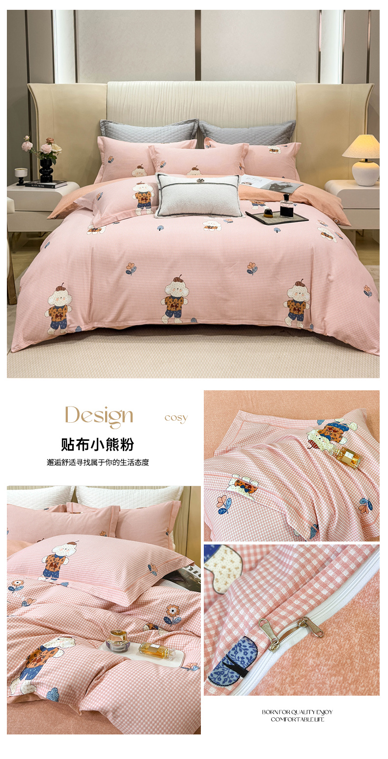 商品名称:凌鼎 2026新款100%全棉磨毛四件套数码印花加厚纯棉磨毛四件套 贴布小熊粉