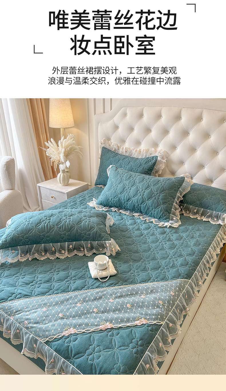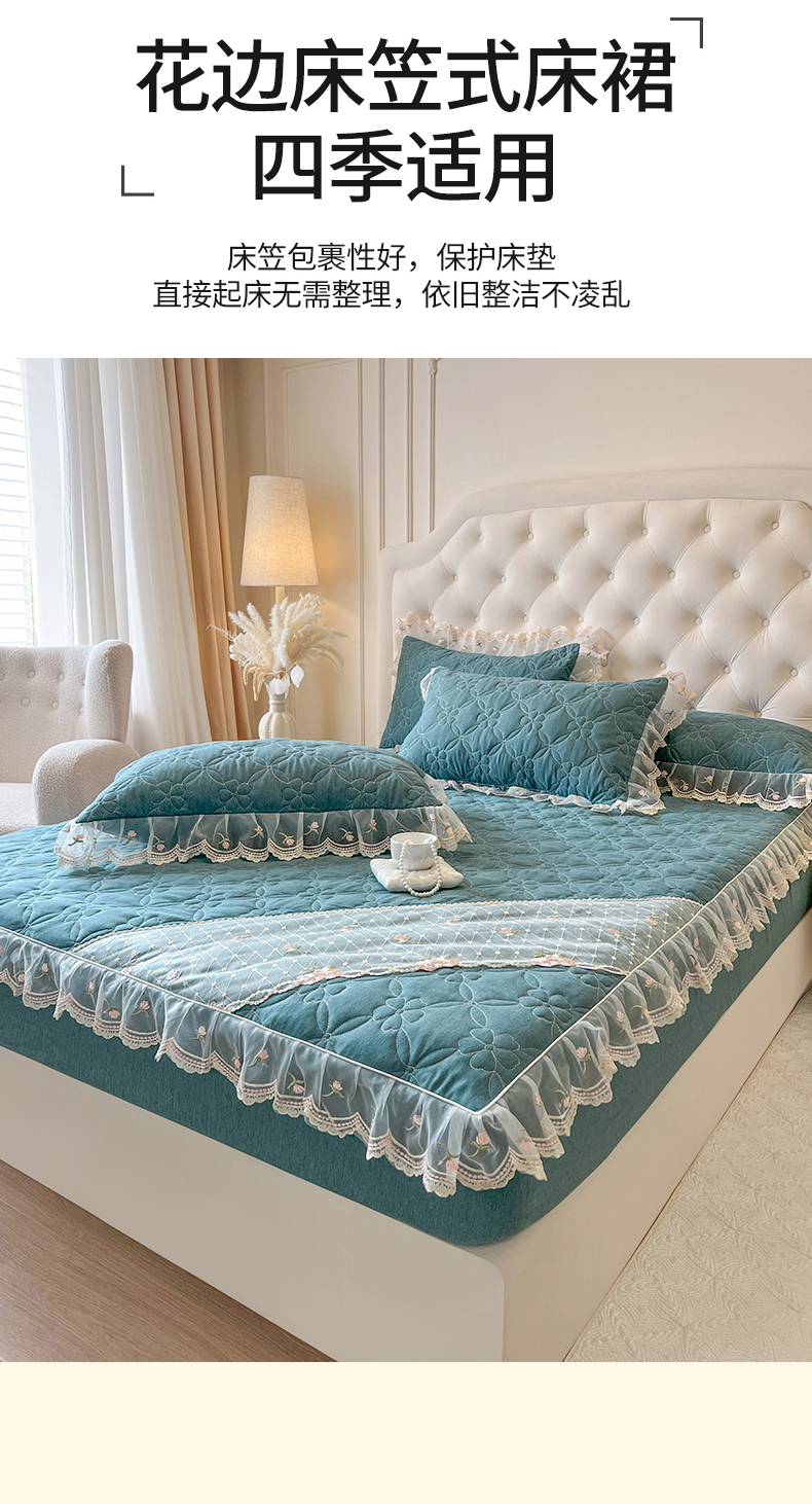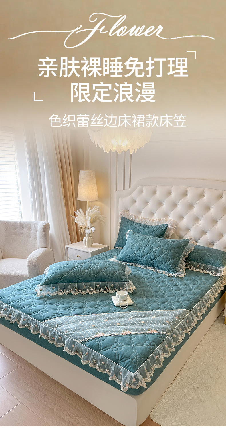 • 91家纺网 家纺一手货源 找家纺 麒豆豆 2025新款色织蕾丝边床裙款床笠-花亦然 花亦然-黛绿色
