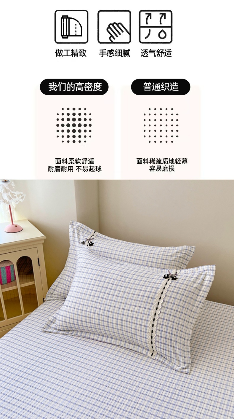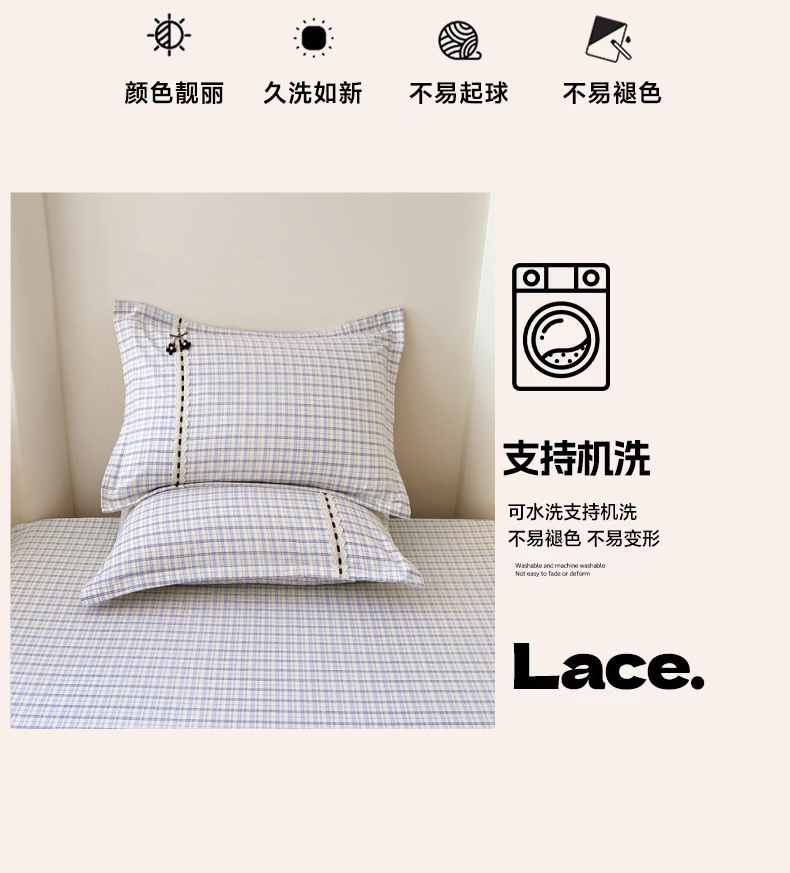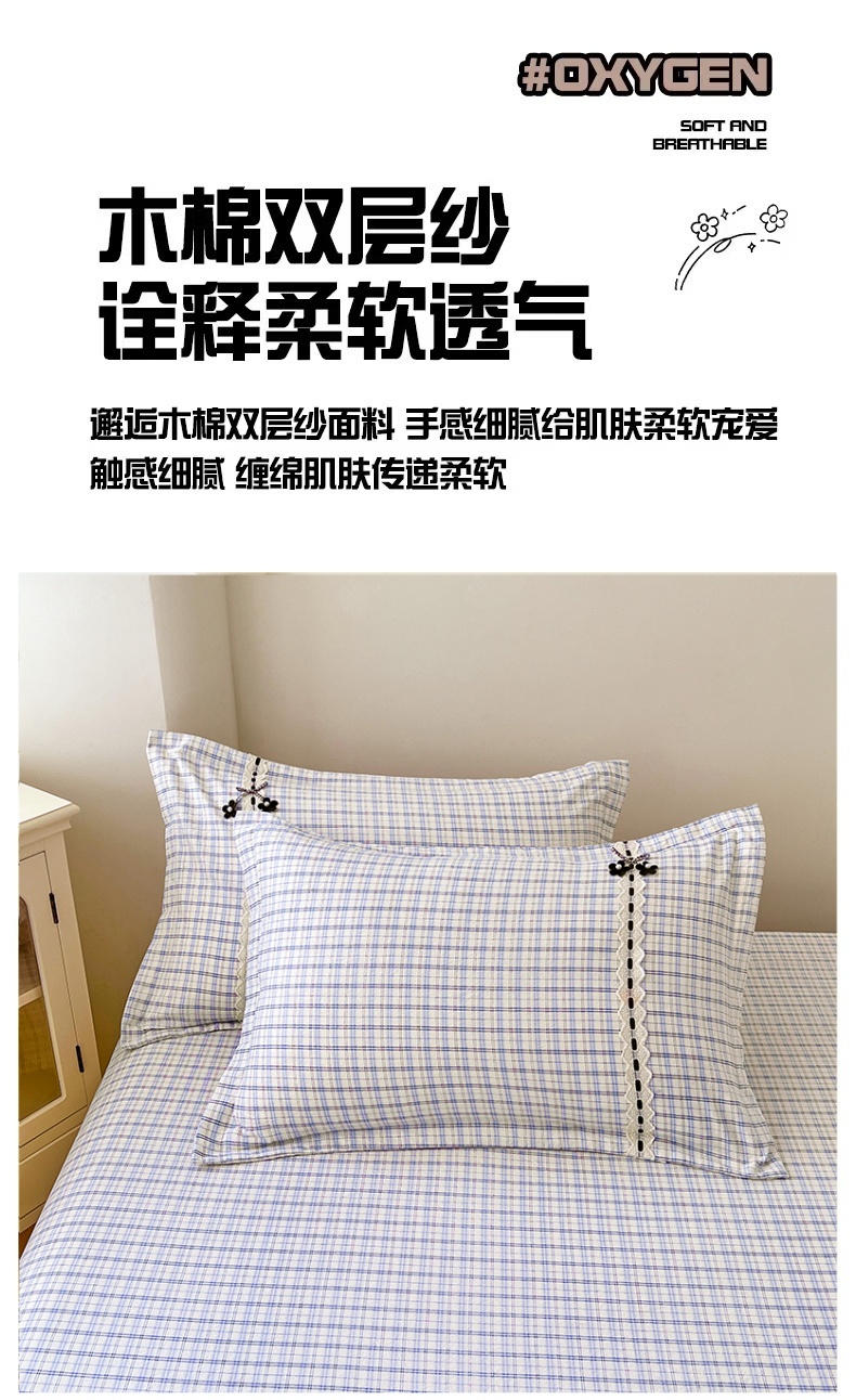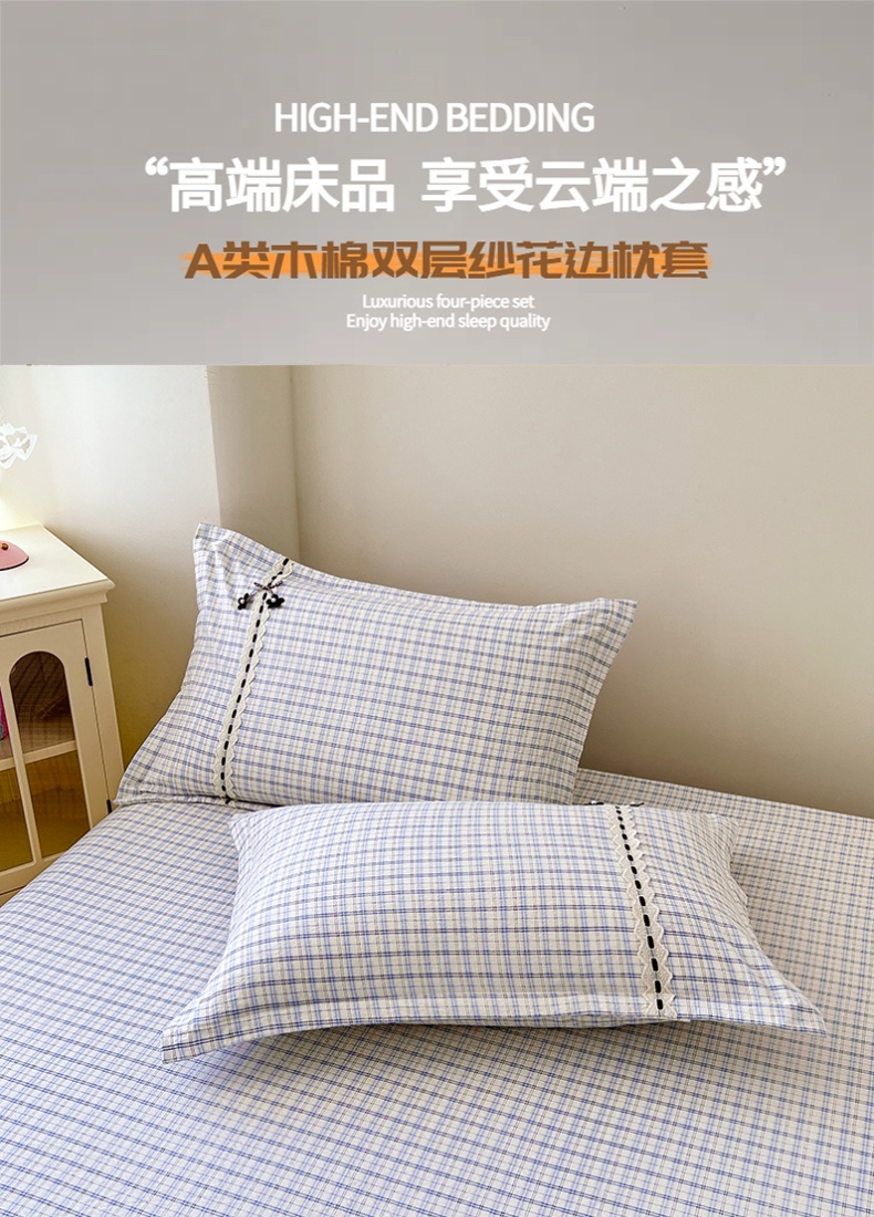商品名称:梦舒羽 2025新款双层纱蕾丝花边格子枕套宿舍单人枕芯套内胆套一对装 天空蓝格