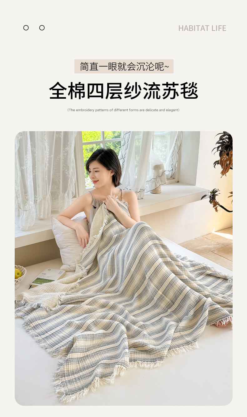 丹本家纺 2025新款双层纱流苏全棉纯棉毯纯棉流苏款盖毯夏被夏凉被空调被 条纹蓝