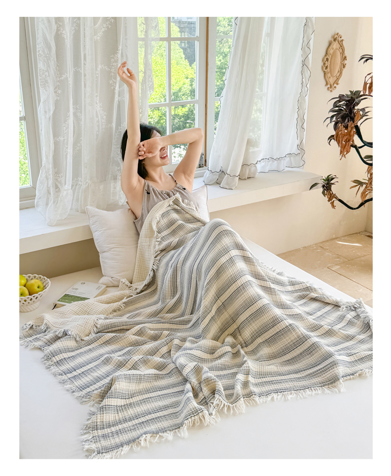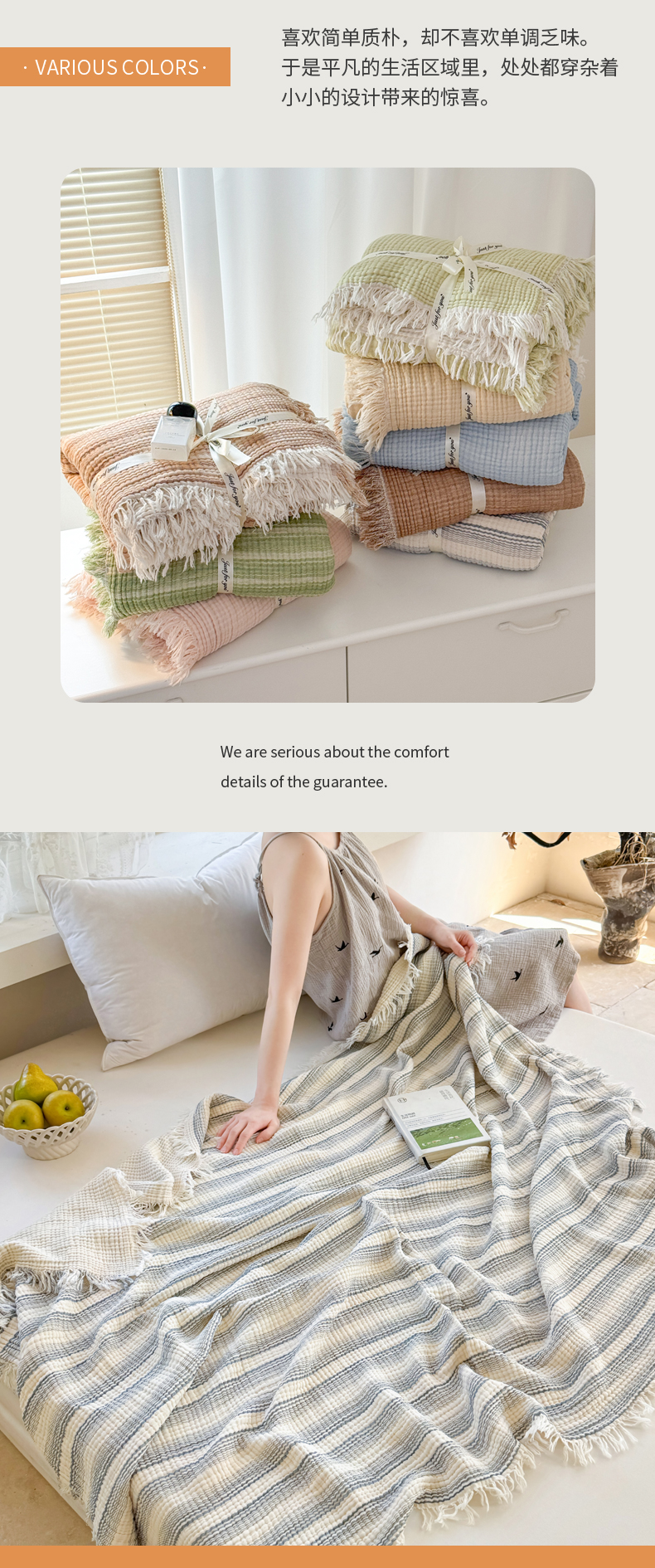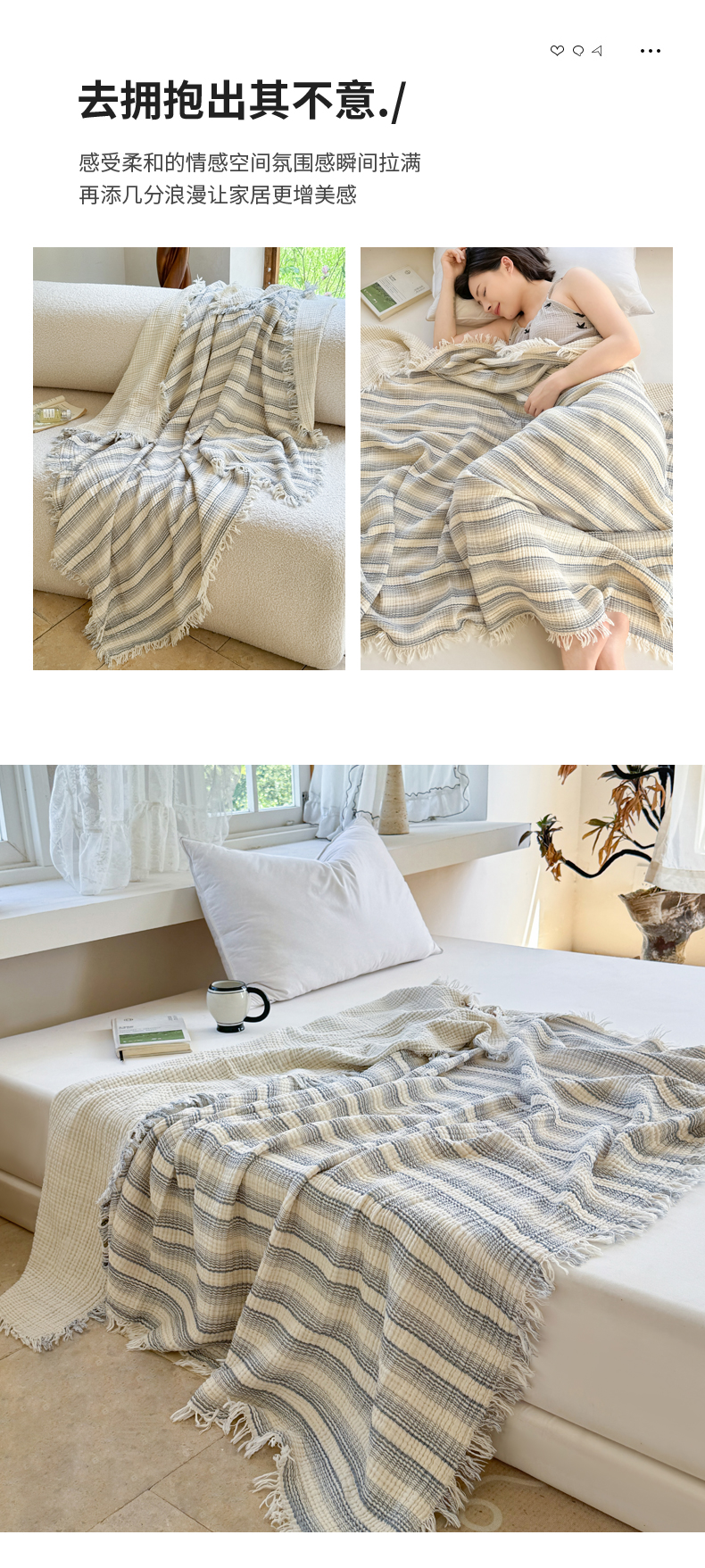 商品名称:丹本家纺 2025新款双层纱流苏全棉纯棉毯纯棉流苏款盖毯夏被夏凉被空调被 条纹蓝