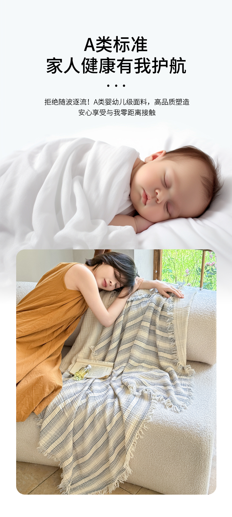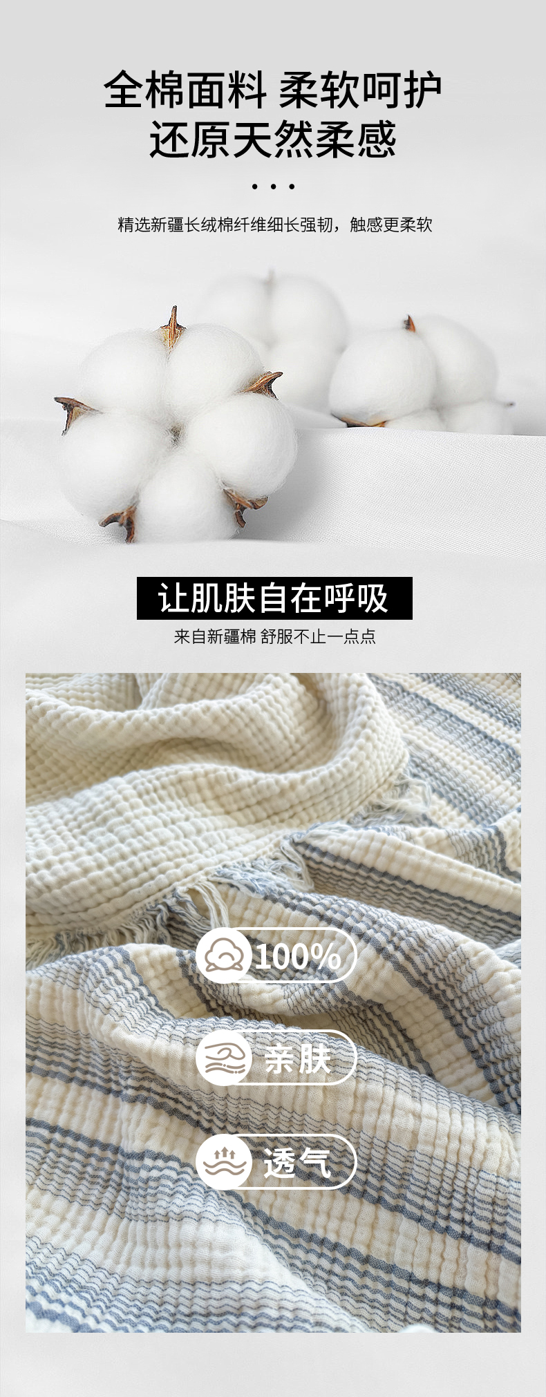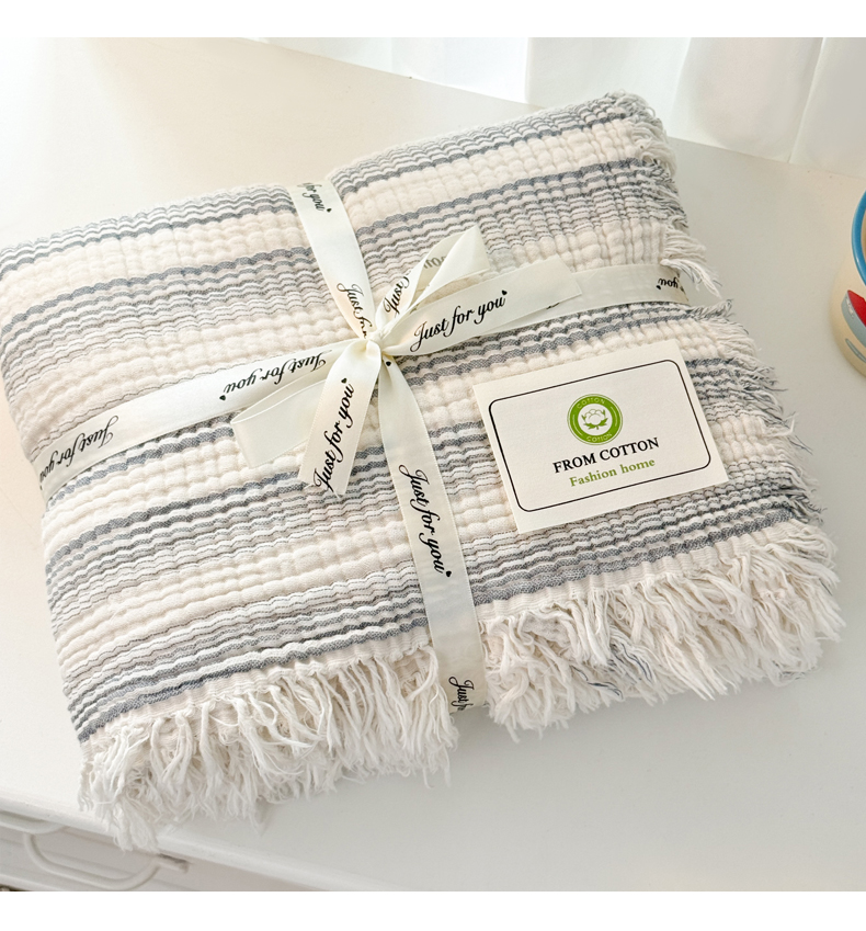 商品名称:丹本家纺 2025新款双层纱流苏全棉纯棉毯纯棉流苏款盖毯夏被夏凉被空调被 条纹蓝