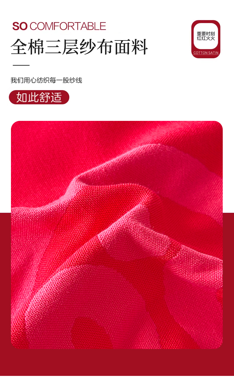 商品名称:悦然毛巾被 2025新款婚庆大红三层全棉纱布枕套 百年好合