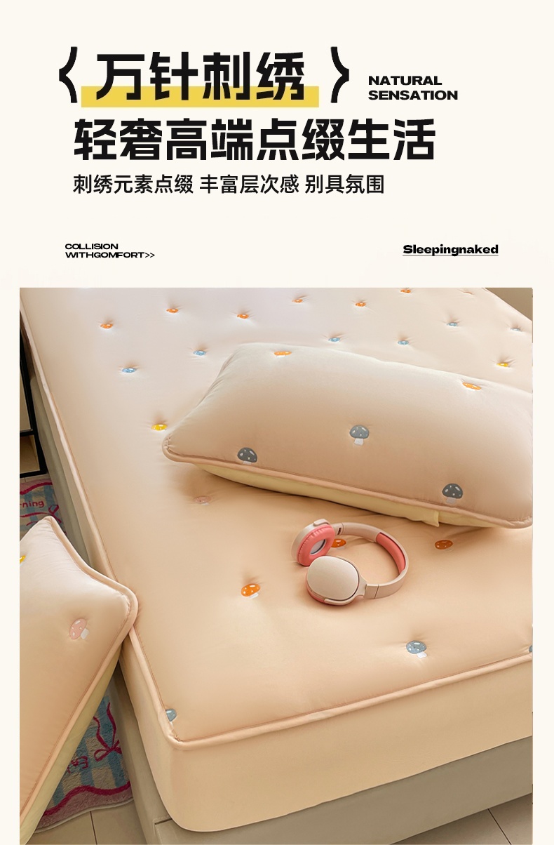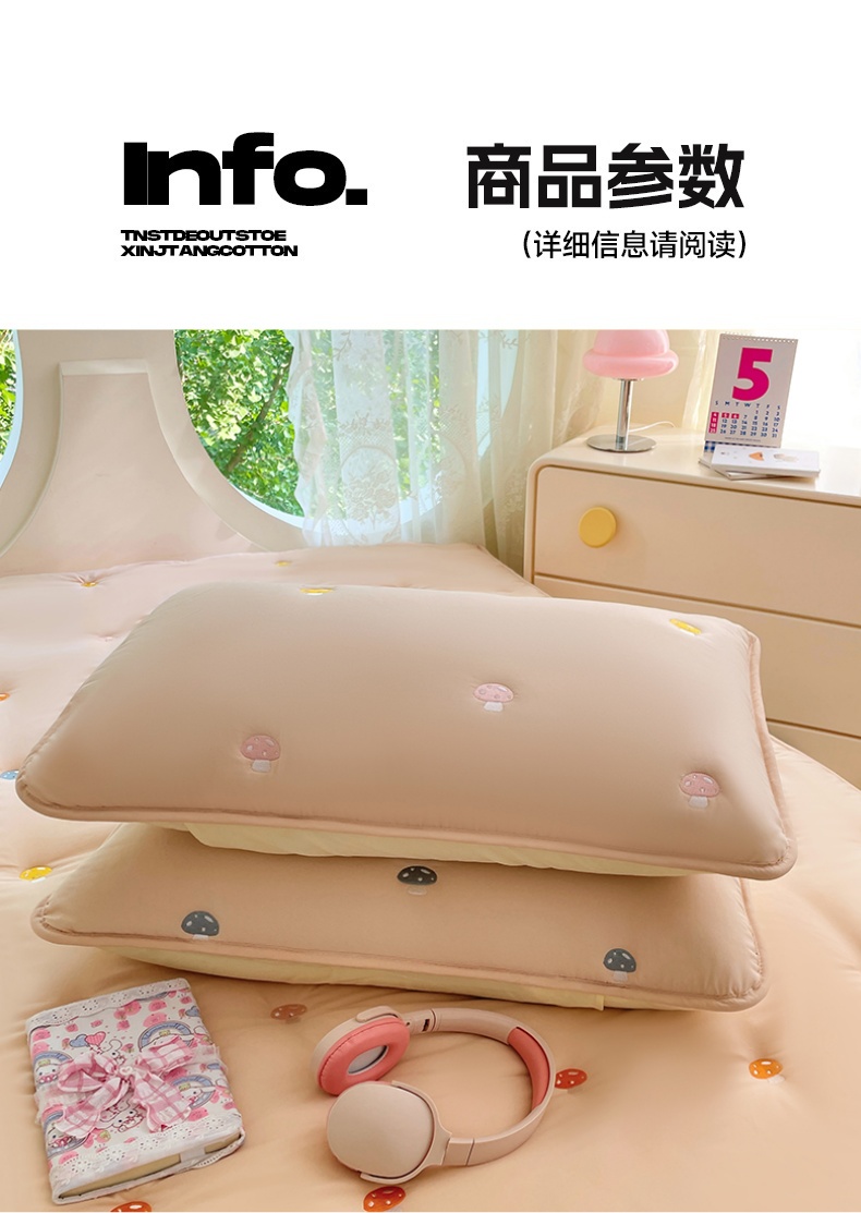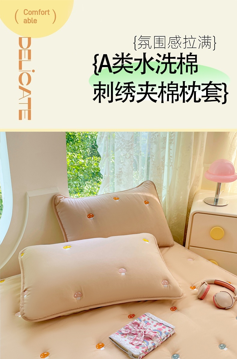 商品名称:梦舒羽 2025新款水洗棉刺绣夹棉枕套加厚宿舍学生枕头套枕芯套 蘑菇屋-奶茶咖