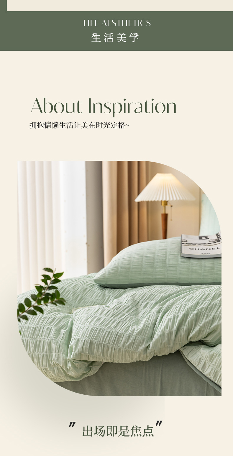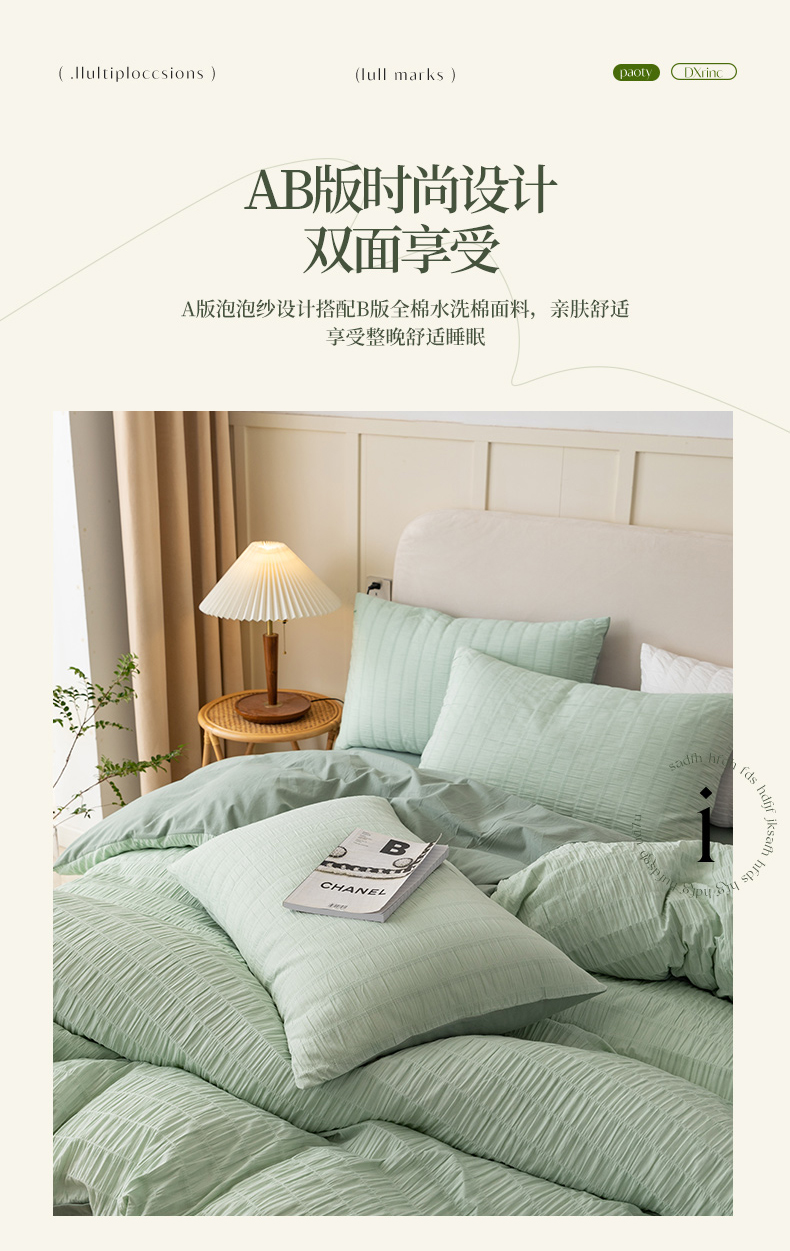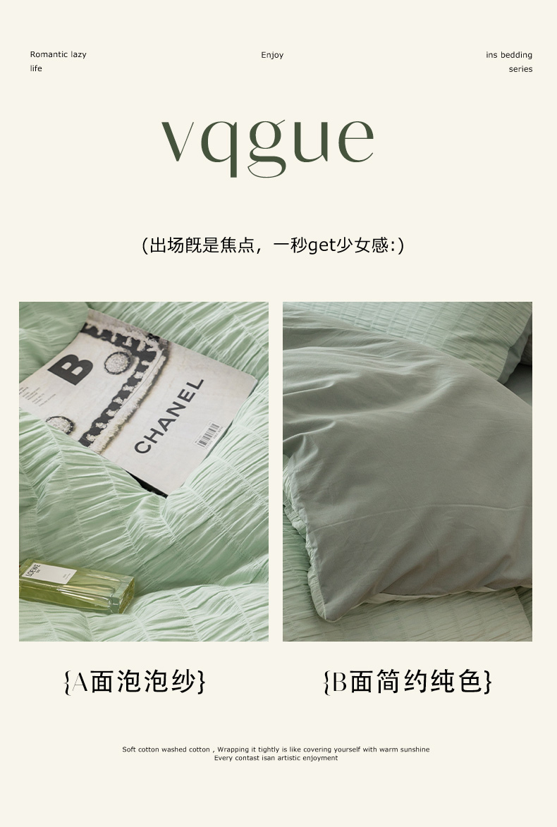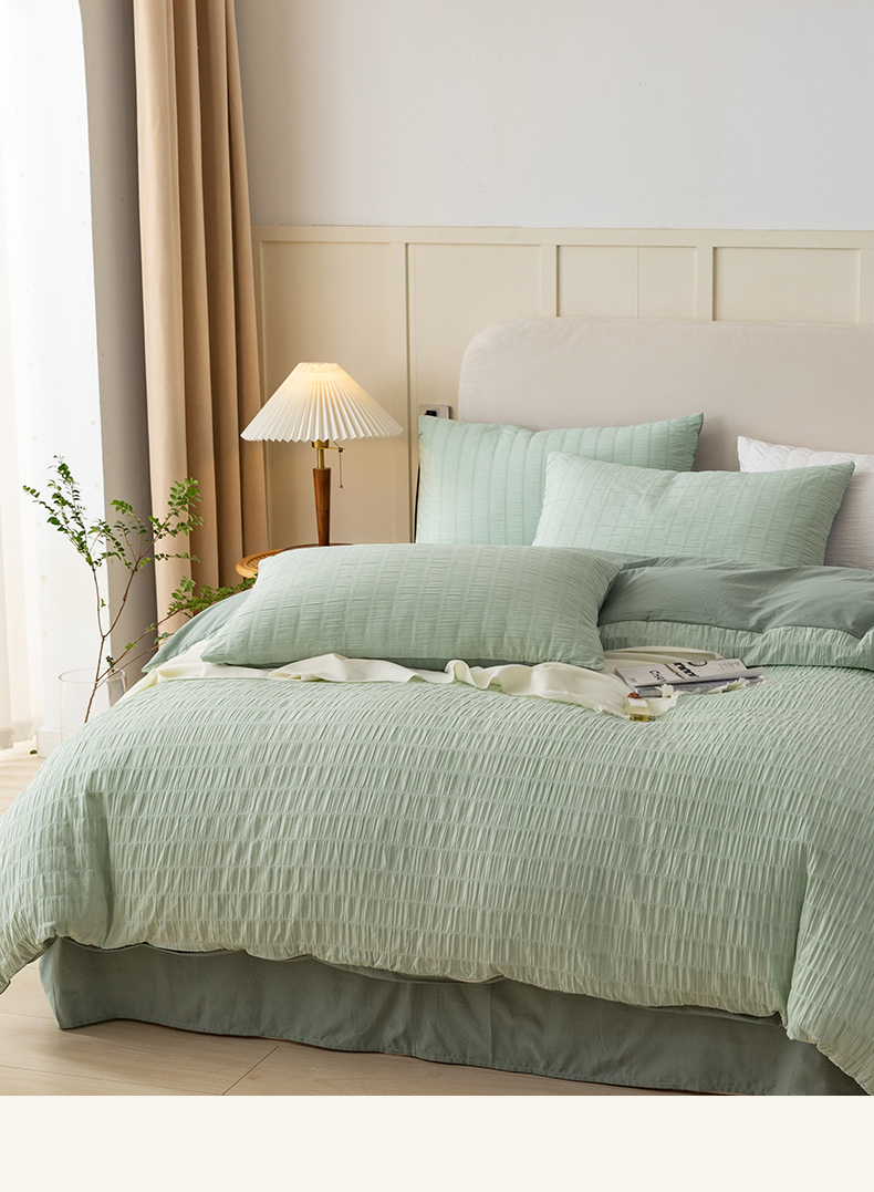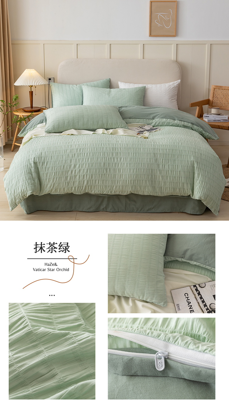 当前位置: 91家纺网 > 商品网购 > 床品套件 > 四件套 > 全棉普通四件套 > 贝尔 PELLHOME AB版纯色全棉泡泡纱四件套皱皱纱四件套另有同款面料夏被(可抖音代发) 抹茶绿
