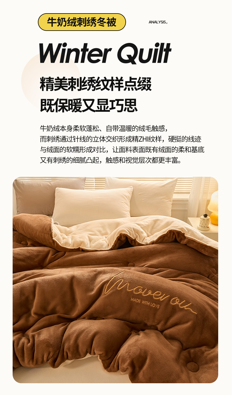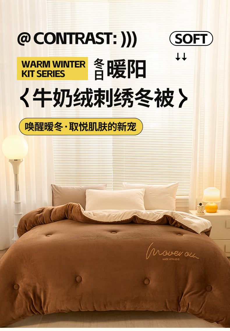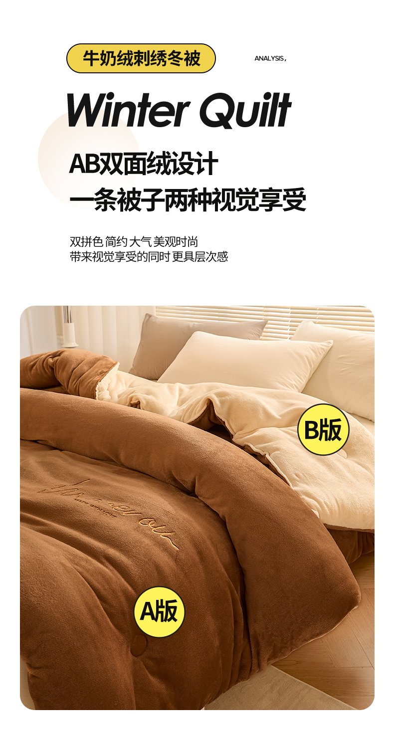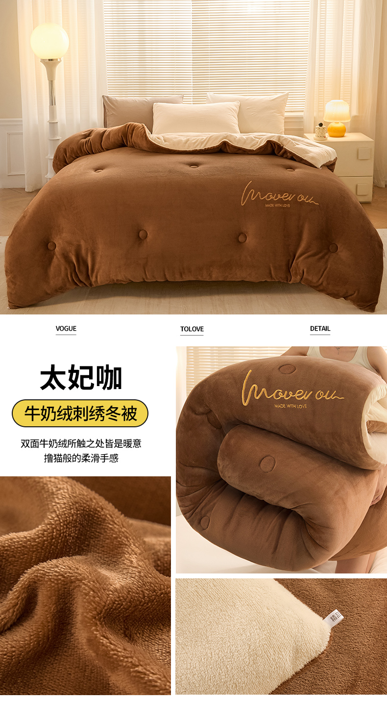 商品名称:暖芯家纺 2025新款双拼色绣花牛奶绒冬被被子被芯 太妃咖