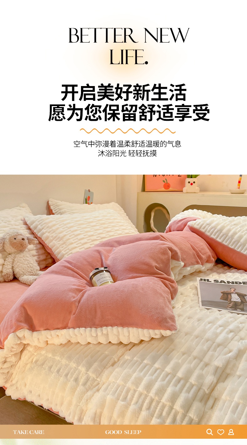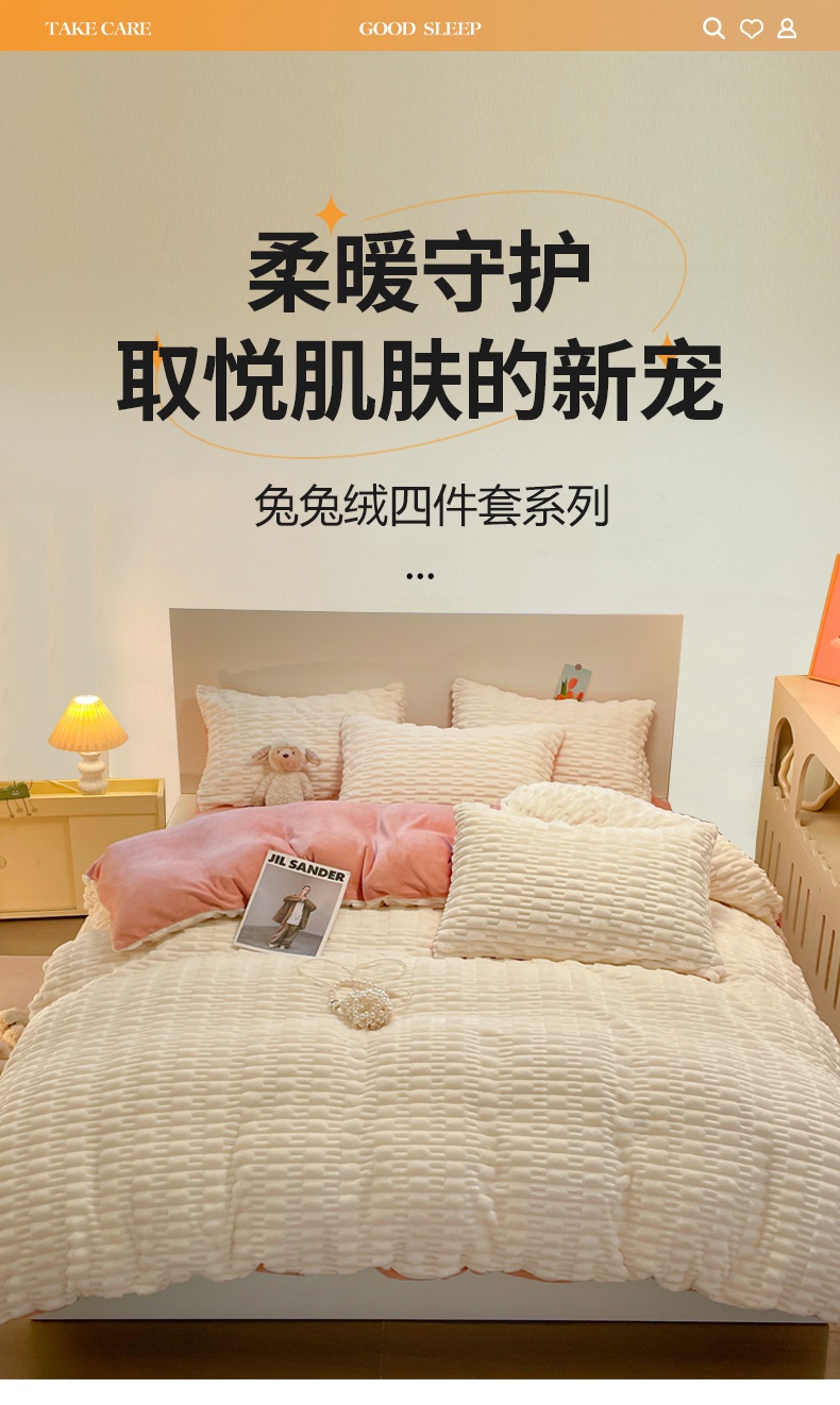 当前位置: 91家纺网 > 商品网购 > 床品套件 > 四件套 > 牛奶绒四件套 > 爱彼家纺 2024新款兔兔绒四件套系列 免兔绒-活力暖黄