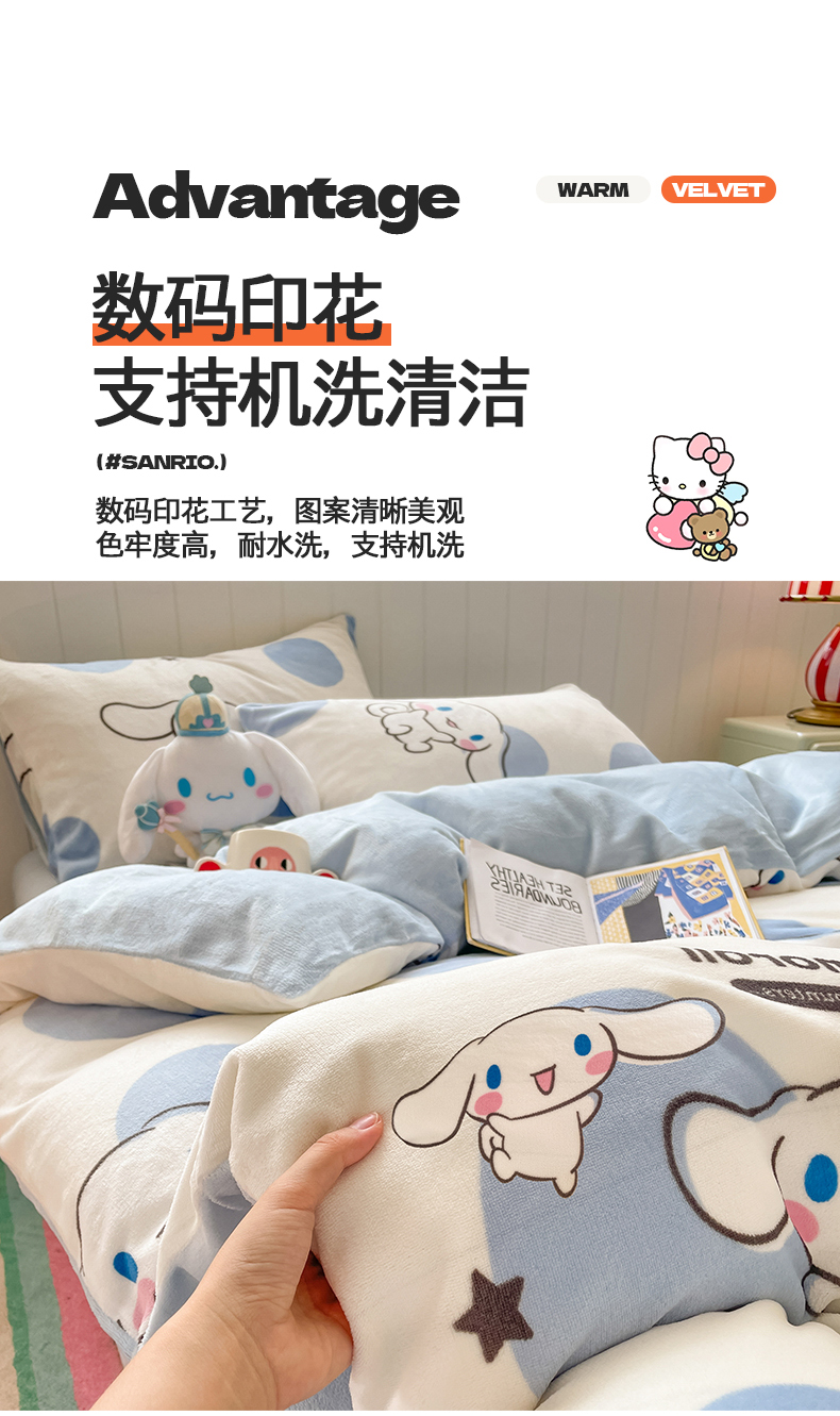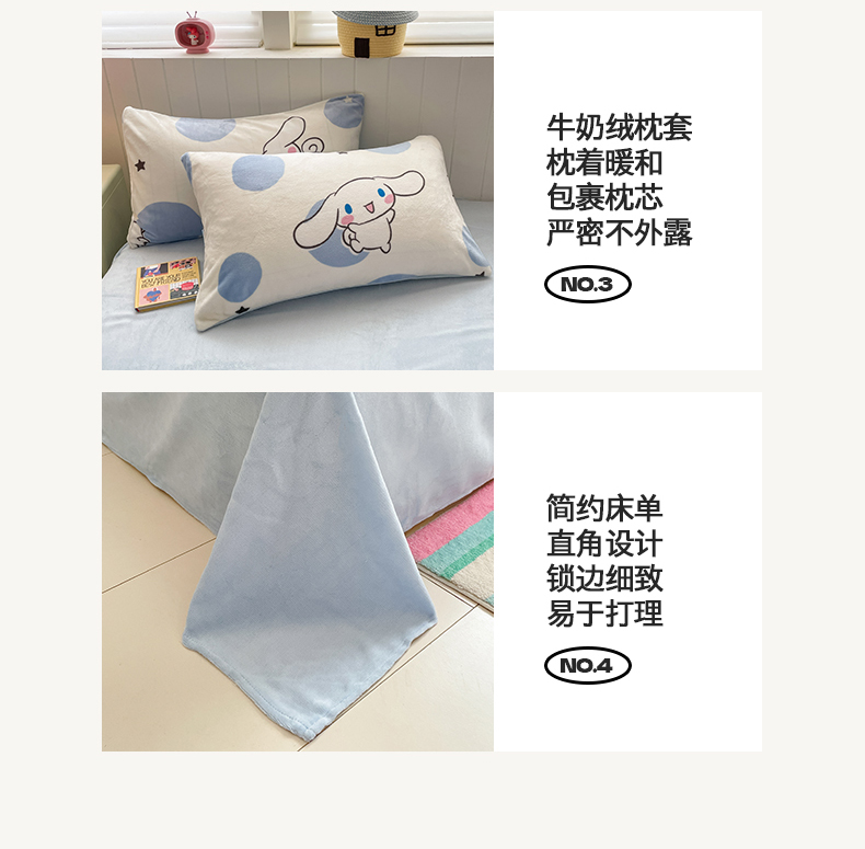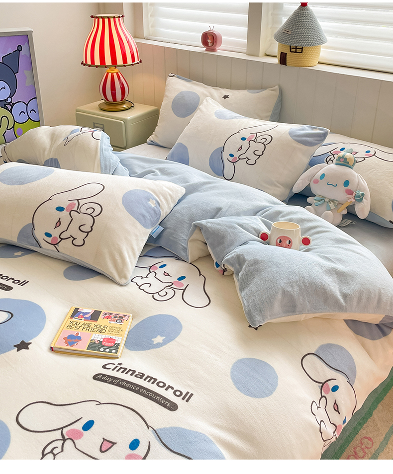 当前位置: 91家纺网 > 商品网购 > 床品套件 > 四件套 > 牛奶绒四件套 > 桃子家居 2025新款A类正版三丽鸥授权卡通加厚高克重牛奶绒系列四件套 绒三丽鸥-蓝色波点玉桂狗