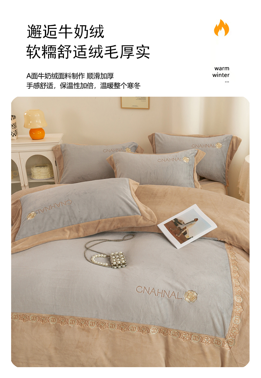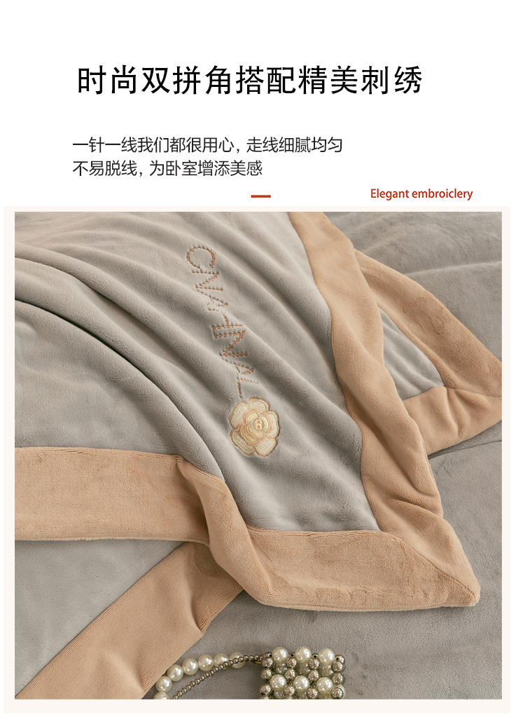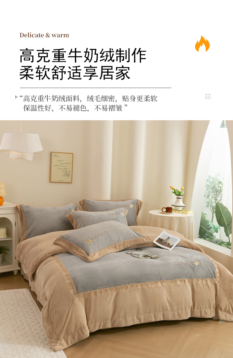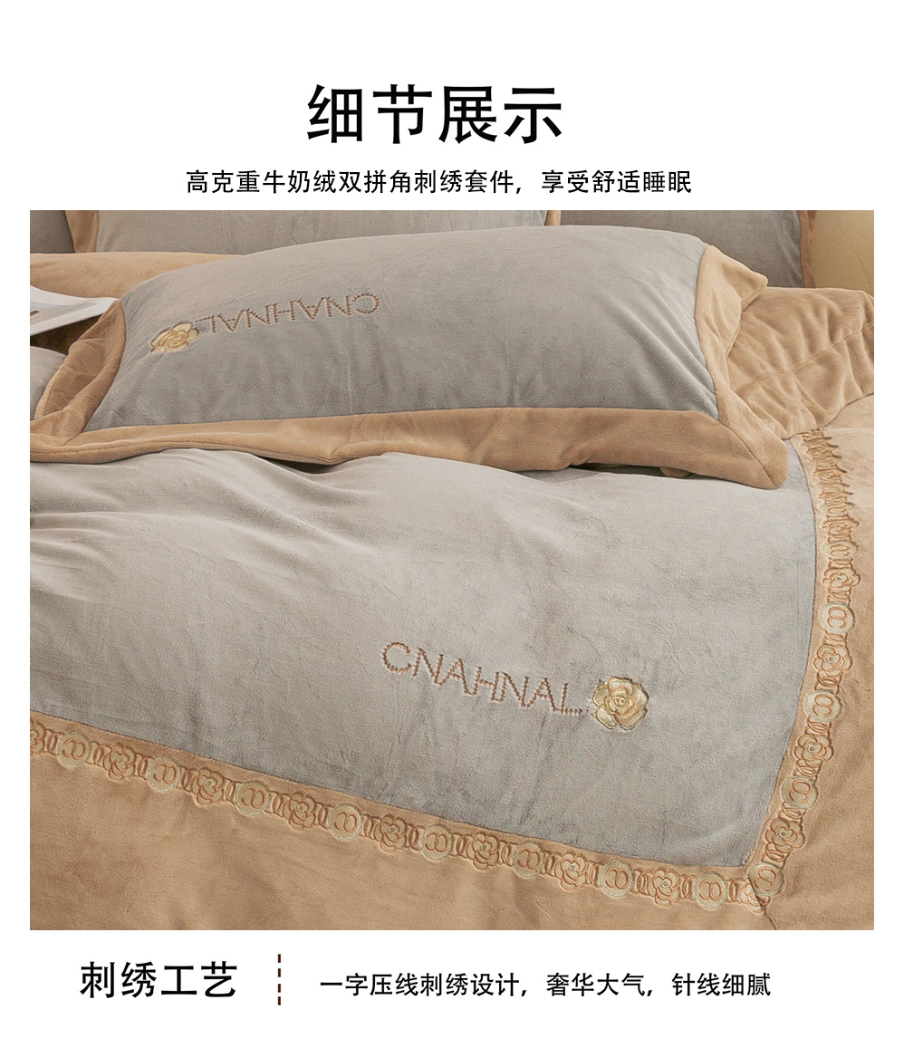 商品名称:绒博士 2025新款270克牛奶绒双拼角刺绣宽边款四件套--维也纳系列 维也纳-浅咖