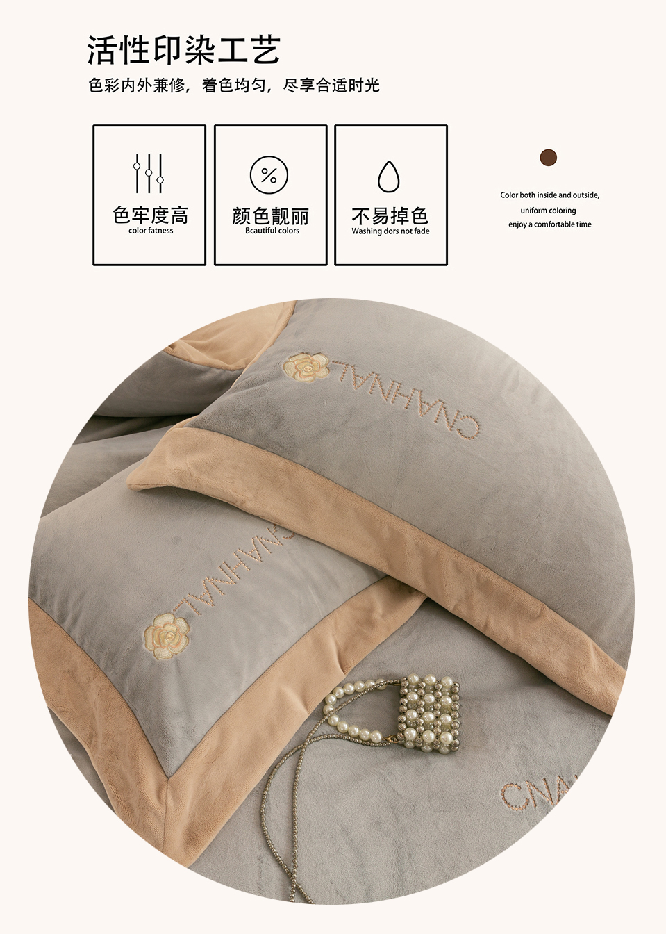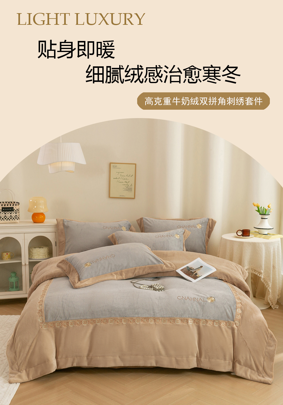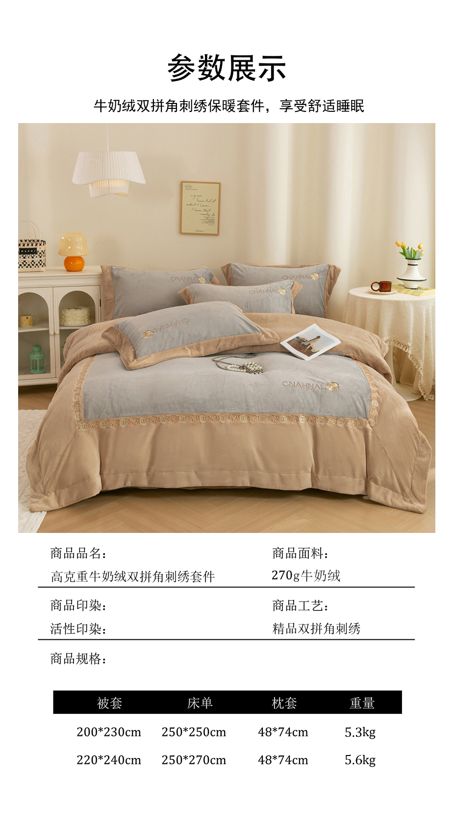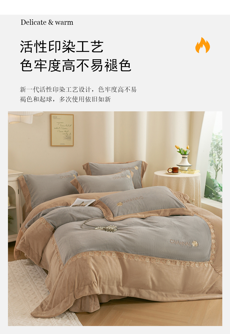 商品名称:绒博士 2025新款270克牛奶绒双拼角刺绣宽边款四件套--维也纳系列 维也纳-浅咖