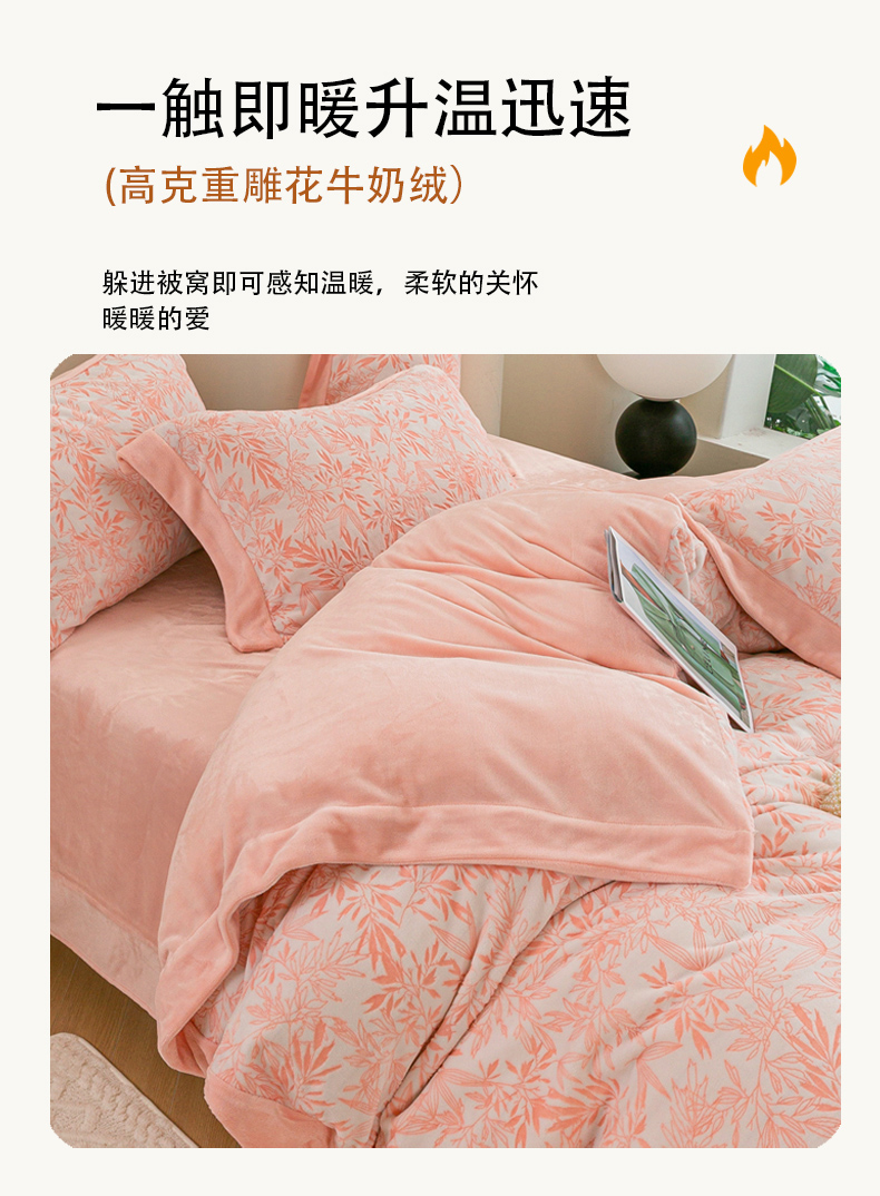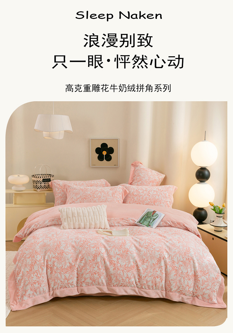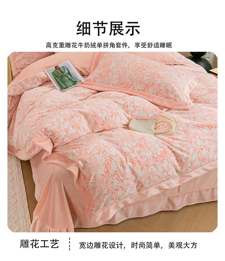 商品名称:绒博士 2025新款230克牛奶绒单拼角雕花宽边款四件套--倩影系列 倩影-粉玉