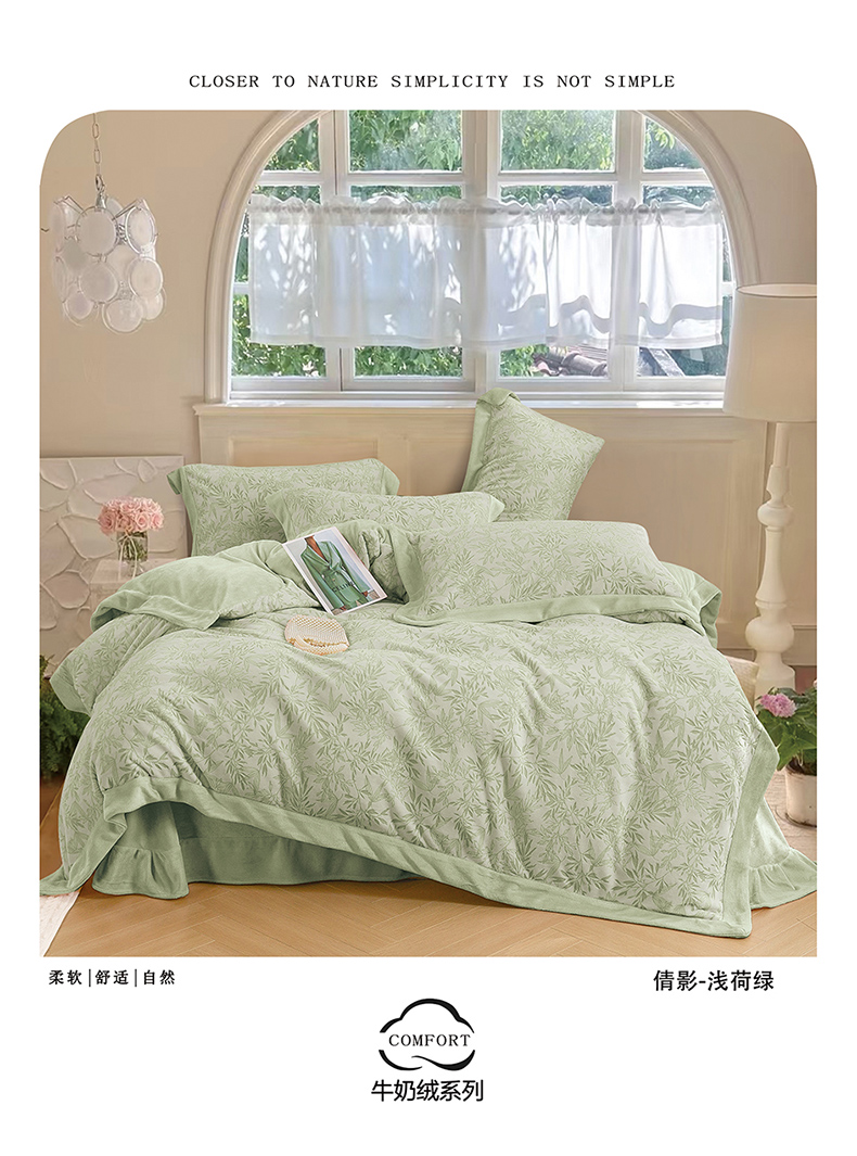 (总)绒博士 2025新款230克牛奶绒单拼角雕花宽边款四件套--倩影系列,倩影-粉玉,倩影-灰紫,倩影-浅荷绿,倩影-天空蓝